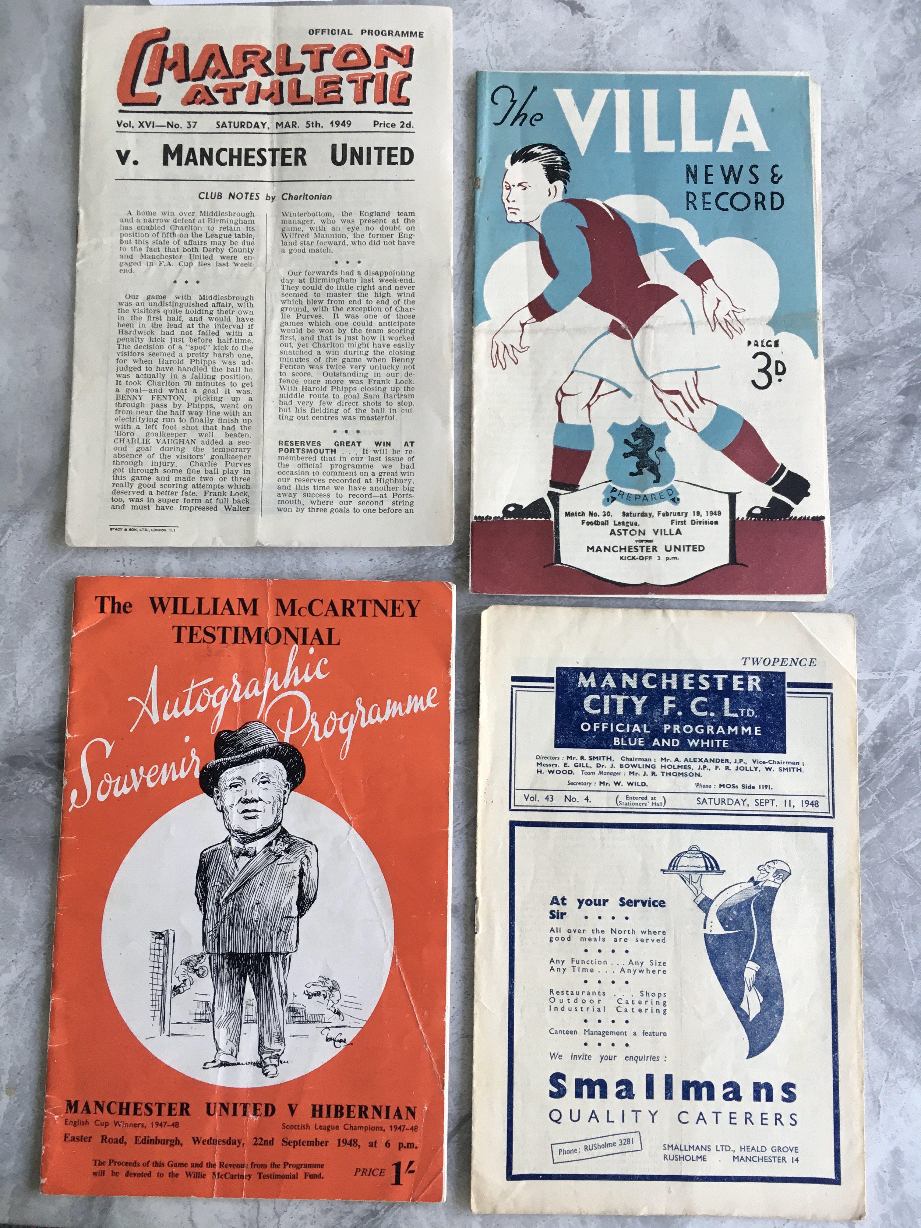 48/49 Manchester United Away Football Programmes: Hibernian McCartney testimonial fair and league matches at Charlton Aston Villa + Manchester City. Good. (4)