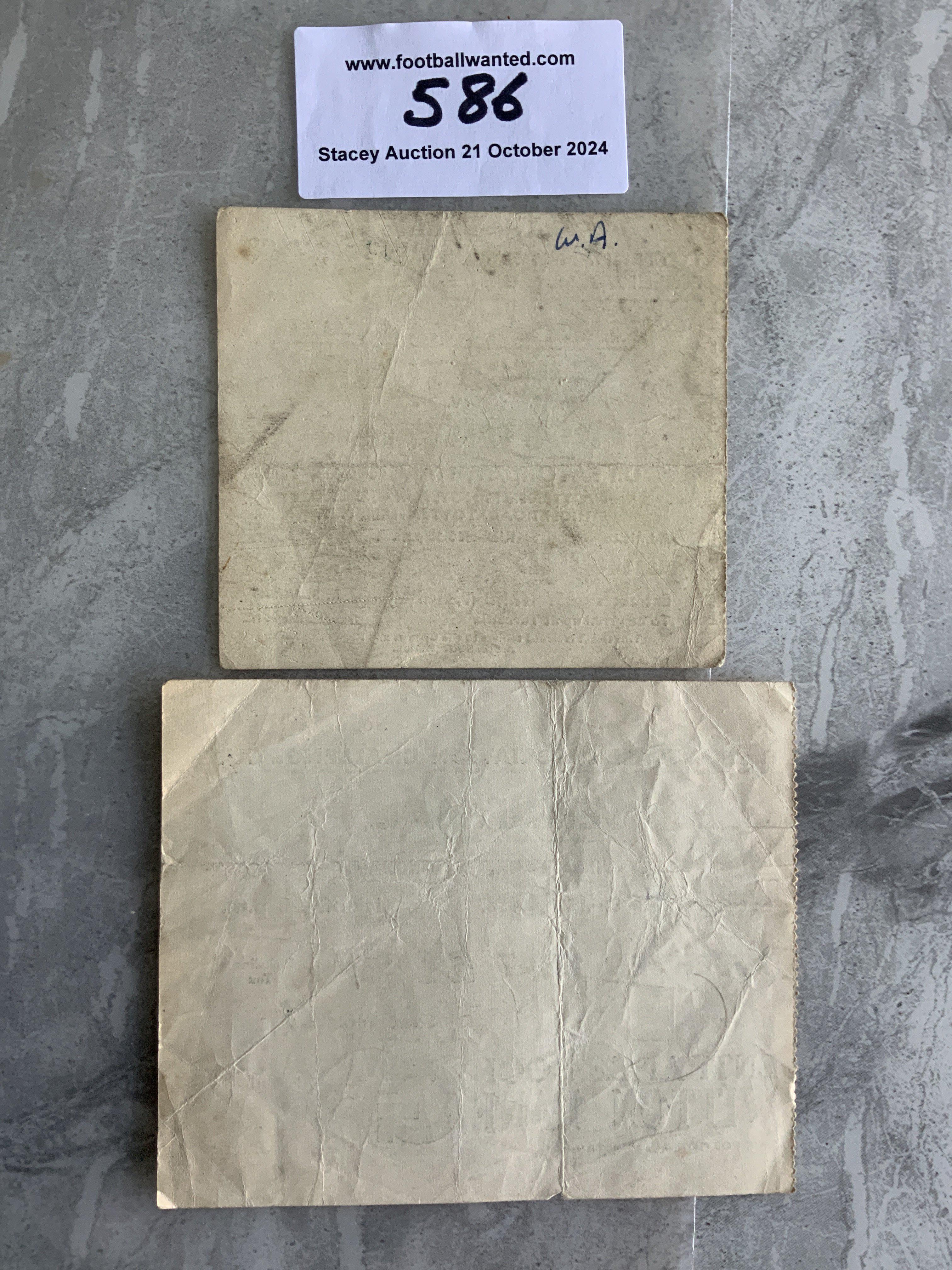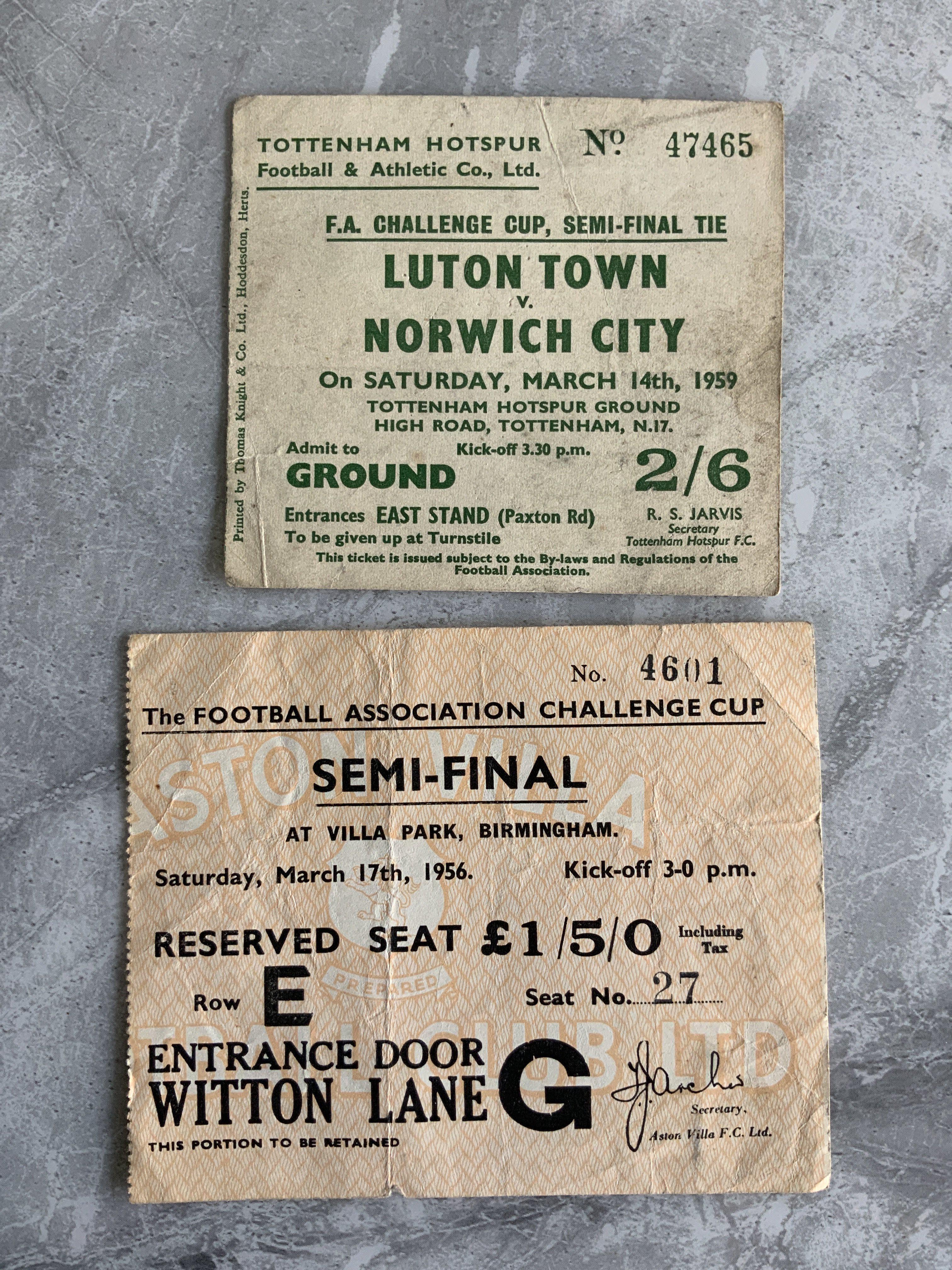 1956 + 1959 FA Cup Semi Final Football Tickets: 1956 Manchester City v Tottenham at Aston Villa and 1959 Luton v Norwich at Tottenham. Fair/good condition with folding. (2)