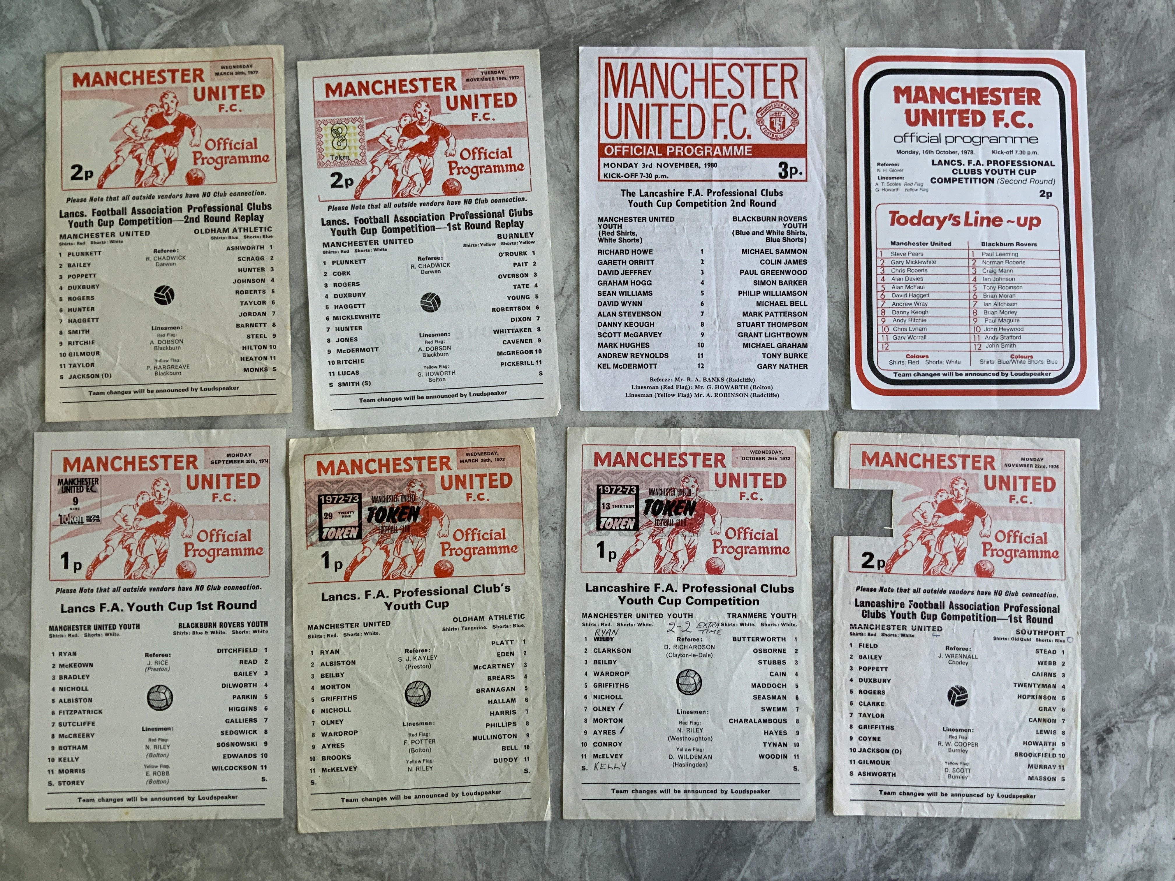 Manchester United 1970s Lancashire Youth Cup Home Football Programmes: Good condition single sheets with 76/77 Southport having token missing. (8)