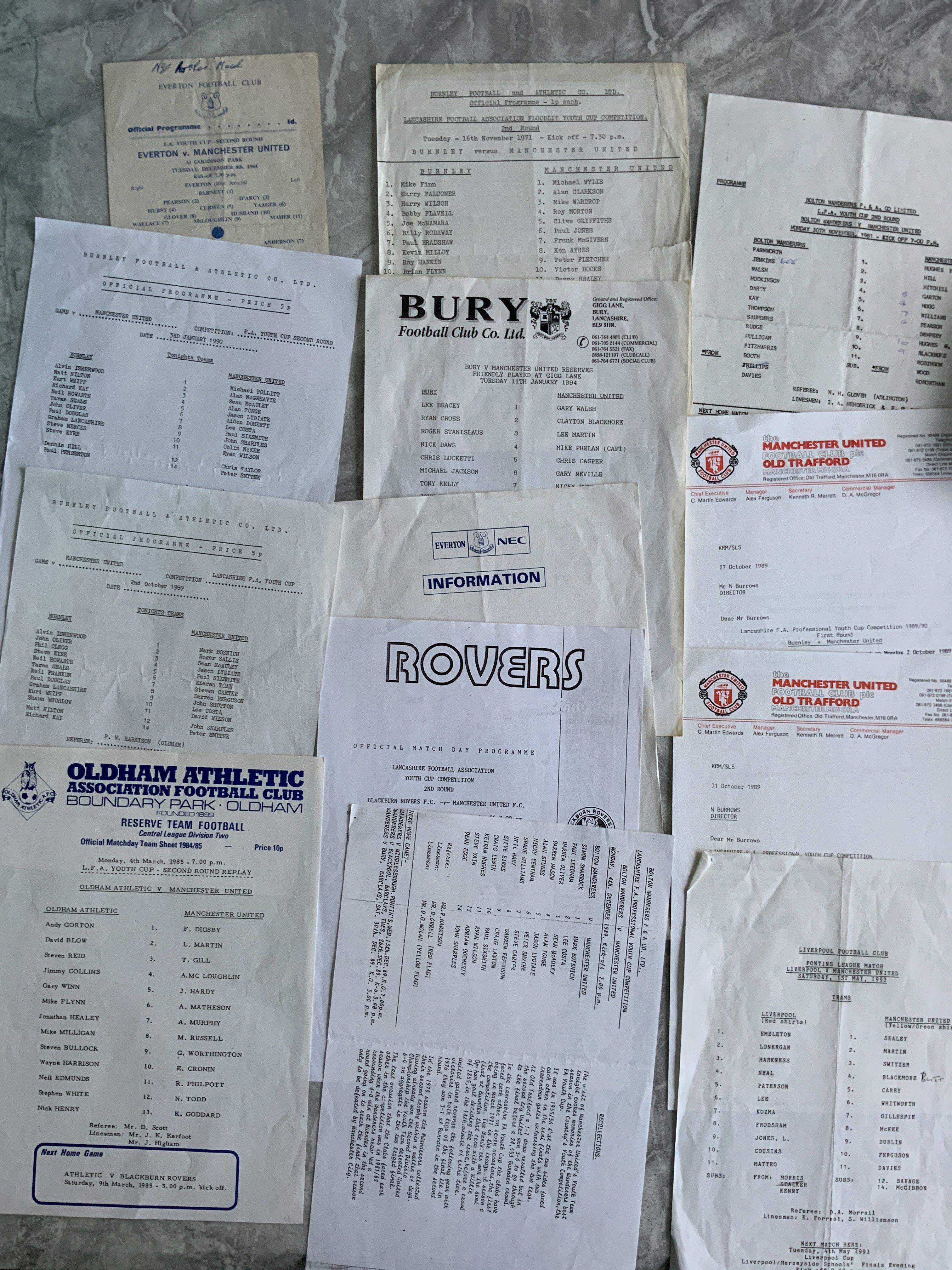 Manchester United Away Youth Football Programmes: 8 single sheets at 64/65 Everton, 71/72 Burnley, 81/82 Bolton, 84/85 Oldham, 89/90 Burnley 2 different and more. C/W 3 reserves and 3 letters regarding fixtures to Director N Burrows.
