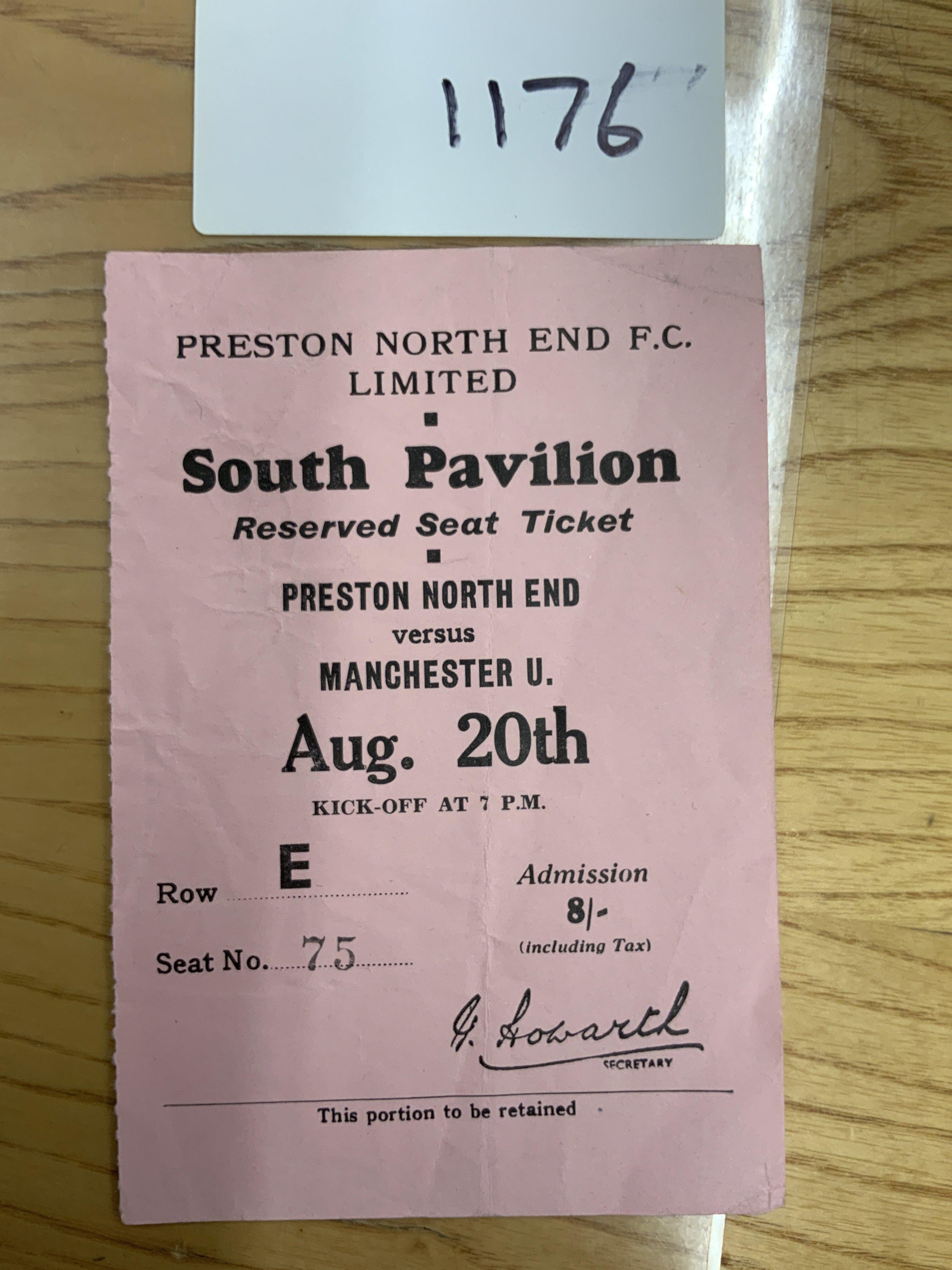 56/57 Preston v Manchester United Football Ticket: First away league match of the season which turned out to be a league winning season for Man Utd. Very good.