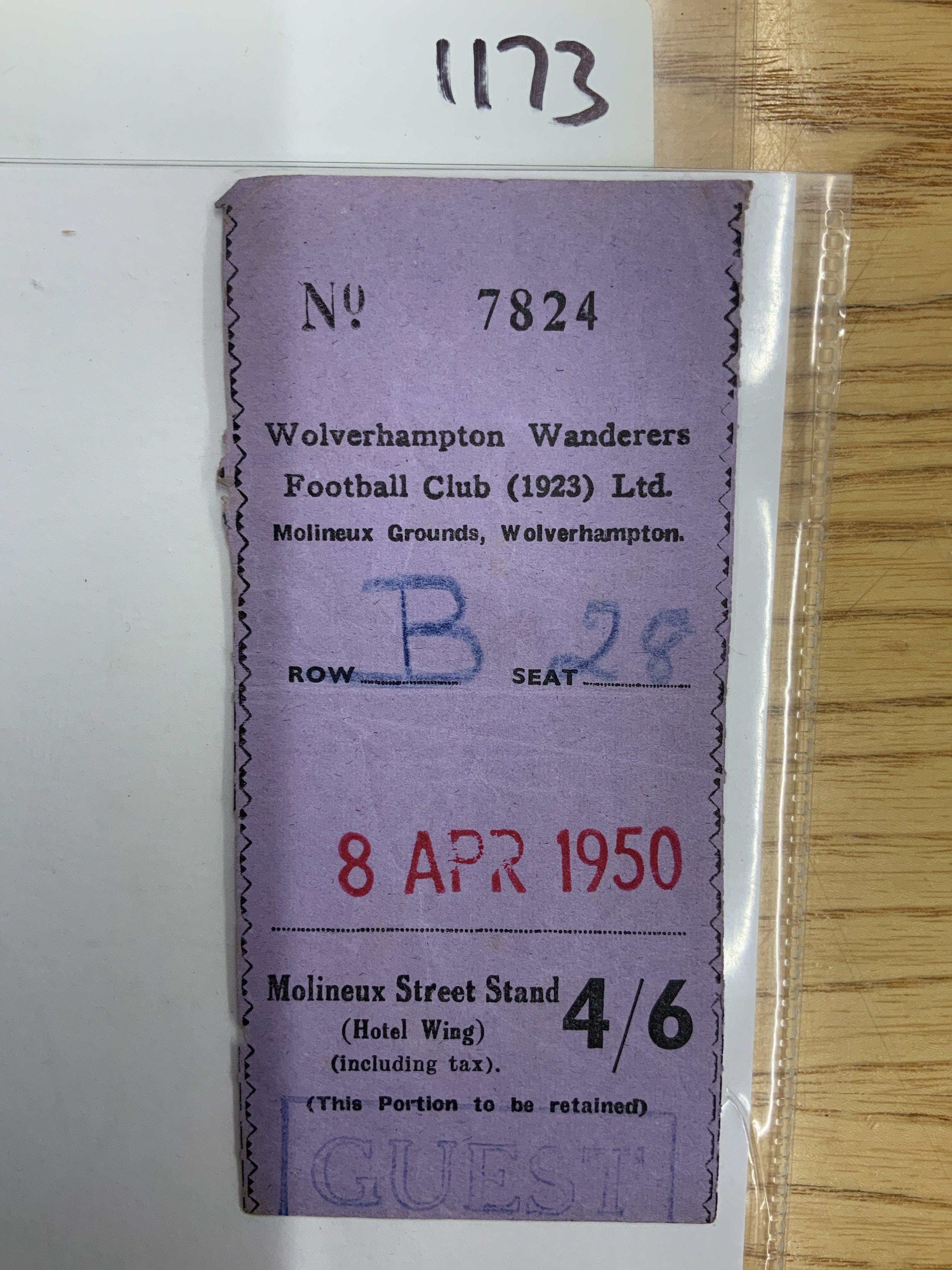 49/50 Wolves v Manchester United Football Ticket: League match dated 8 4 1950 played at Molineux. Wolves ticket has the word guest stamped and a hand written seat number and a date stamp. Wolves ended up with same points as champions Portsmouth.