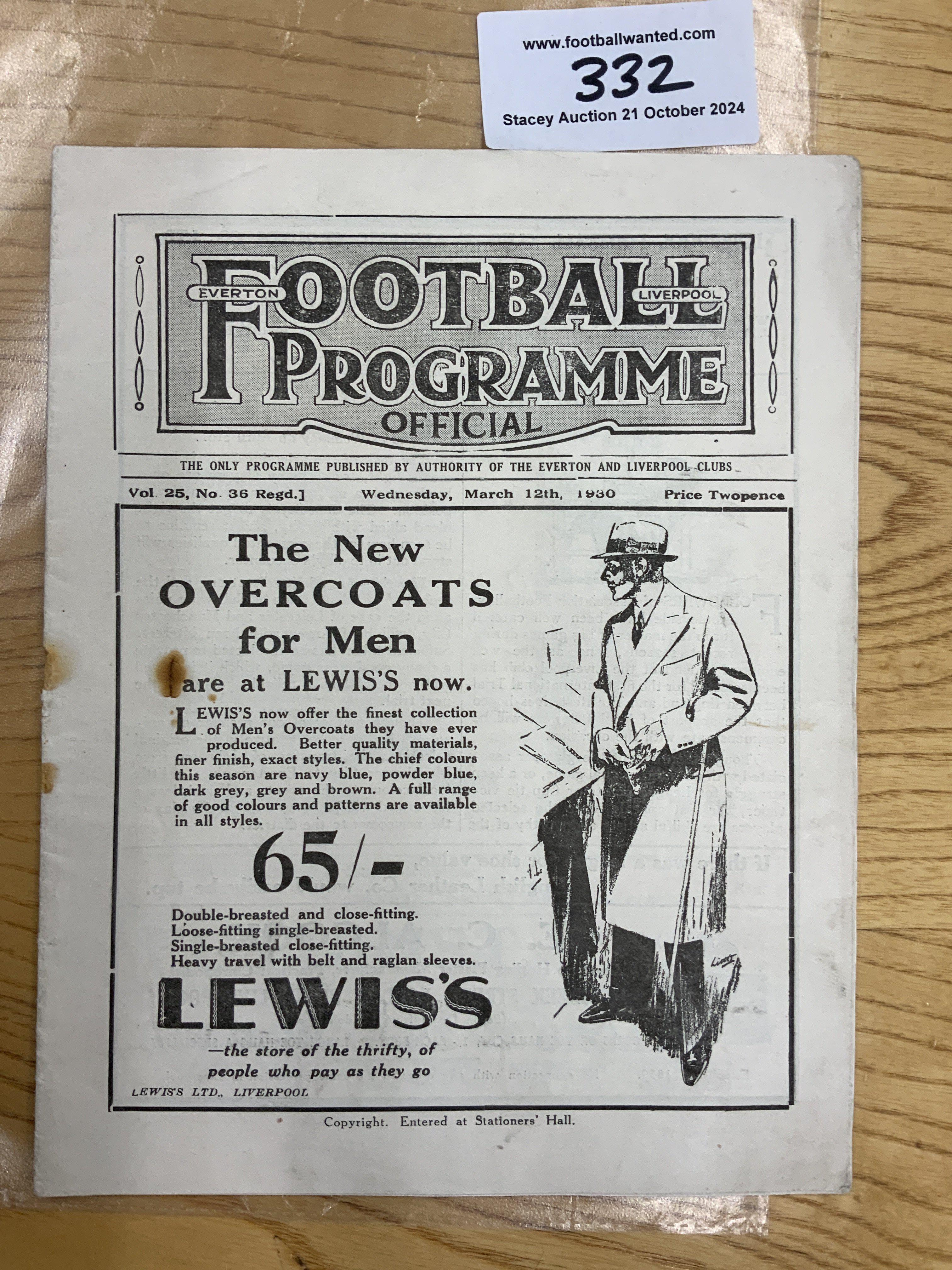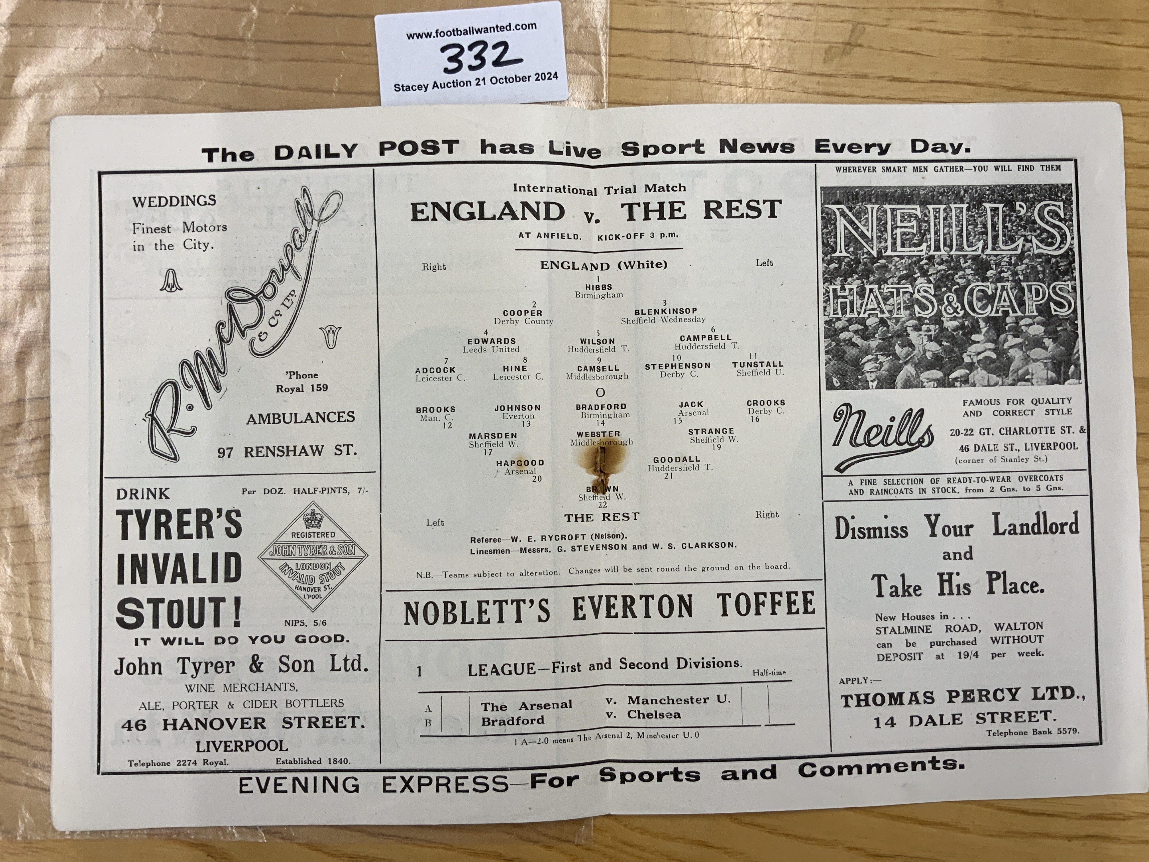 29/30 England International Trial Football Programme: England v The Rest played at Everton on 12 3 1930. Staple has rusted away leaving hole, otherwise good with no team changes.