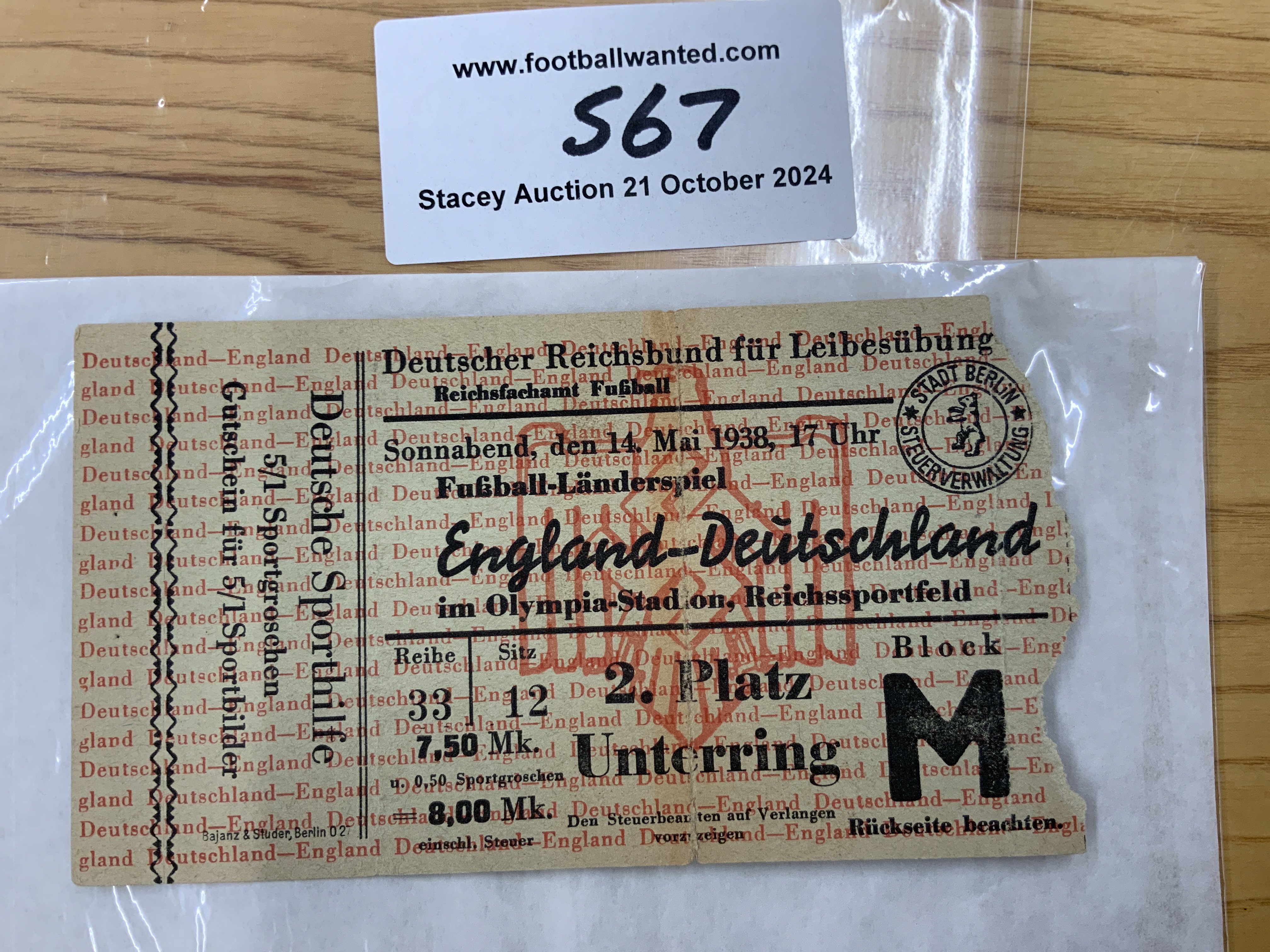 1938 Germany v England Football Ticket: Infamous Nazi salute match dated 14 5 1938 played in Berlin. Fair condition full international ticket torn at edge for entry. Fold.