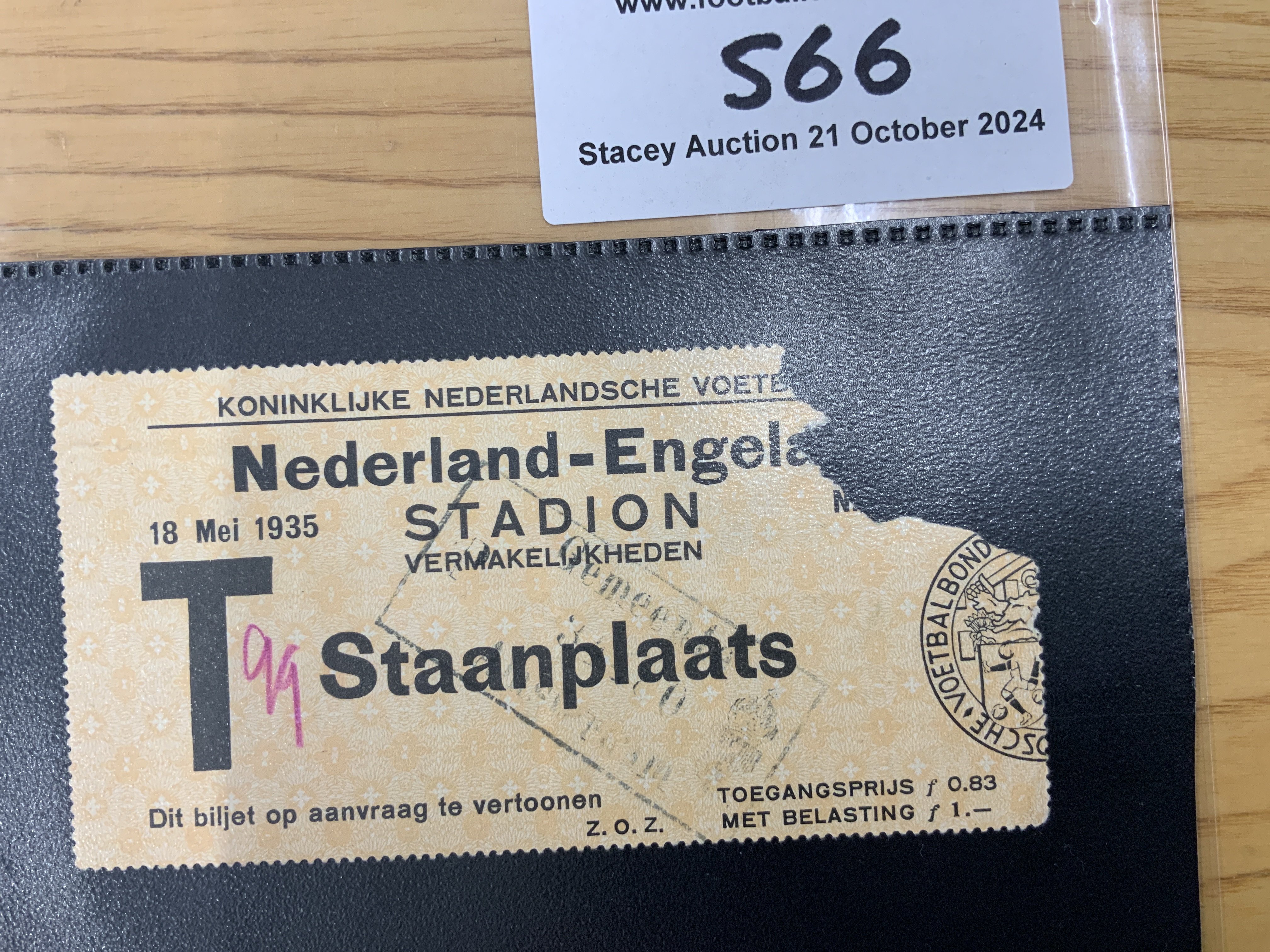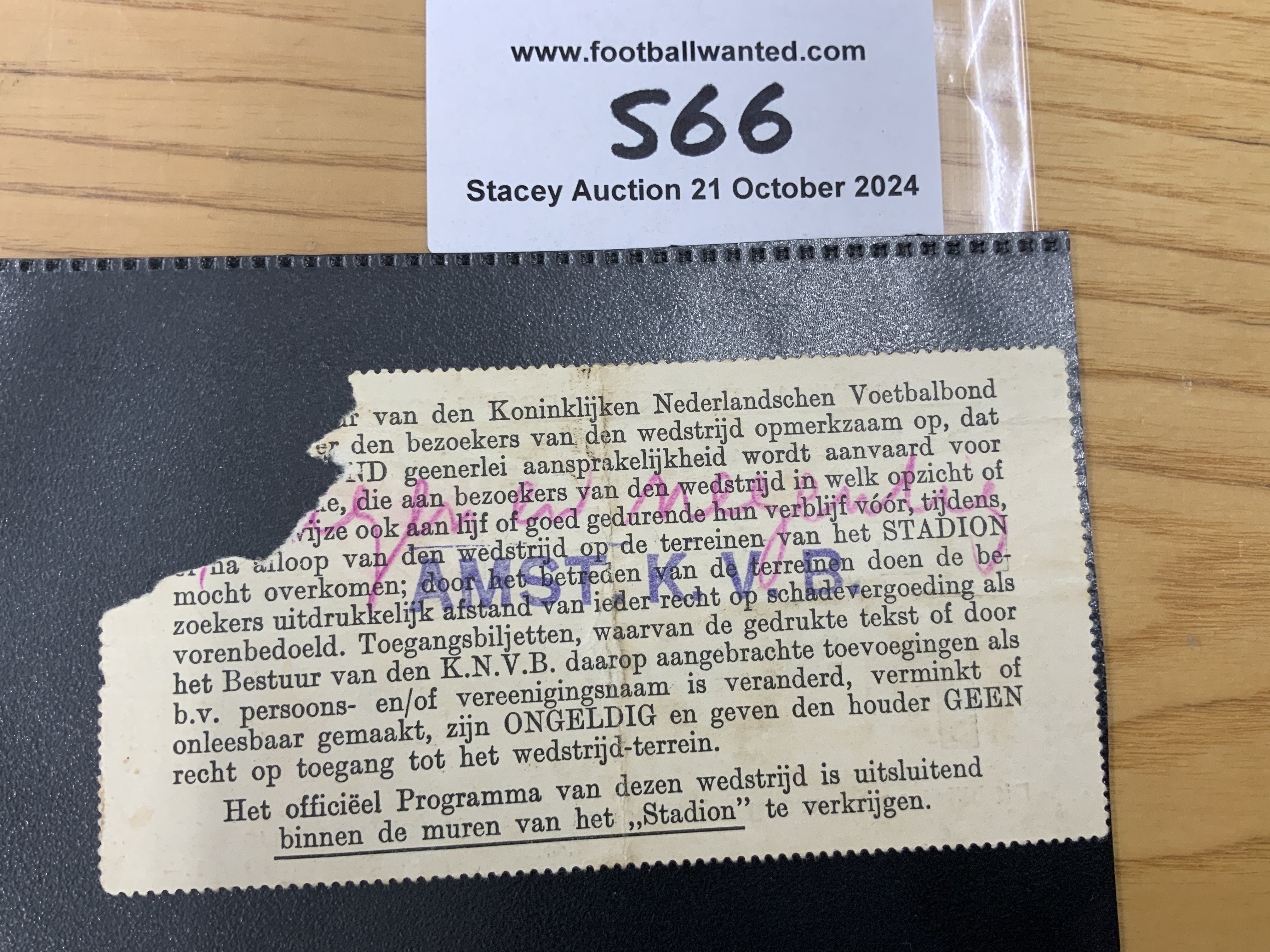 1935 Netherlands v England Football Ticket: Dated 18 5 1935 played in Amsterdam. Full international ticket has been torn off at corner for entry. Writing.