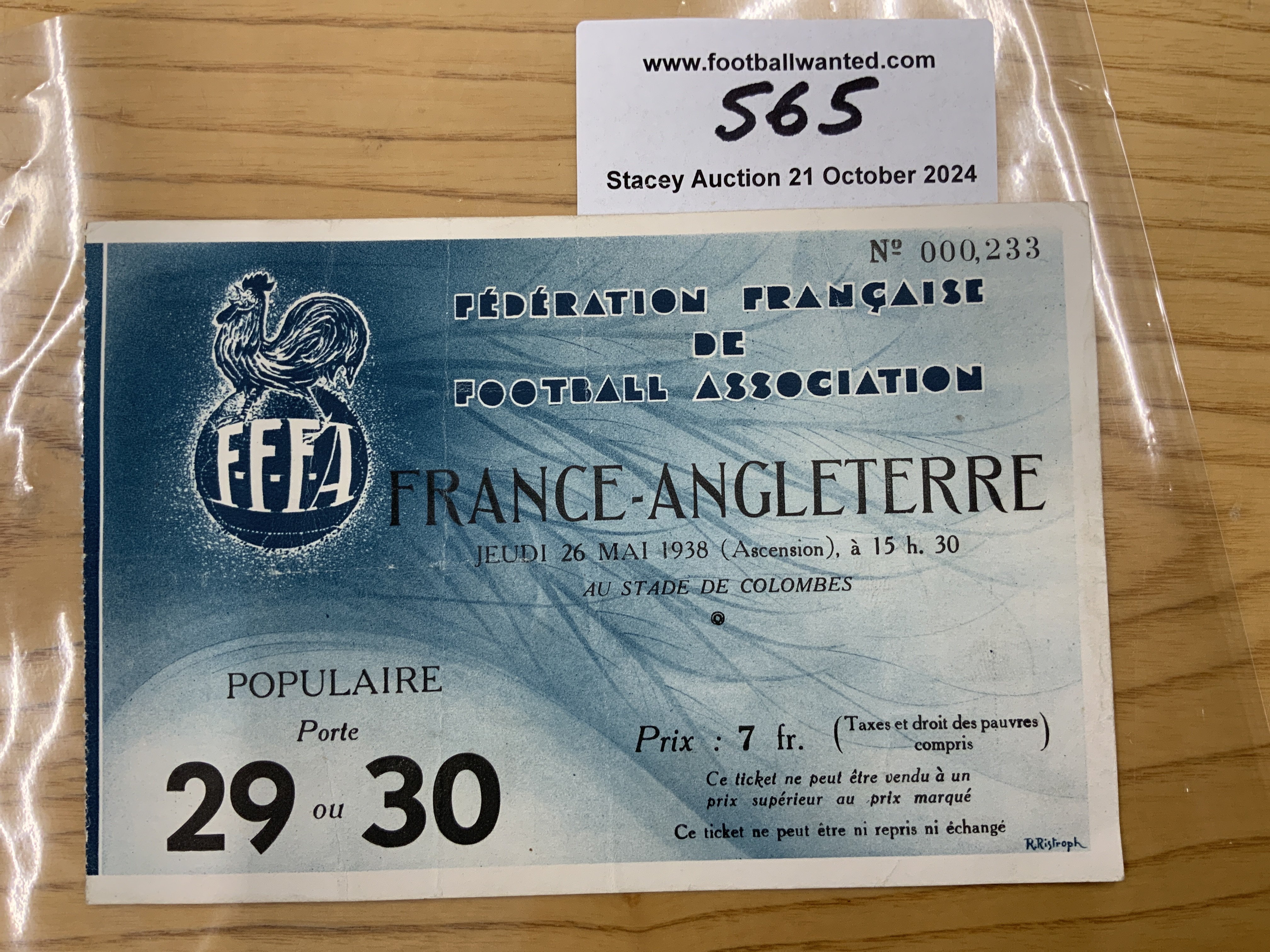 1938 France v England Football Ticket: Dated 26 5 1938 played in Paris. Very good condition attractive full international ticket with folding.