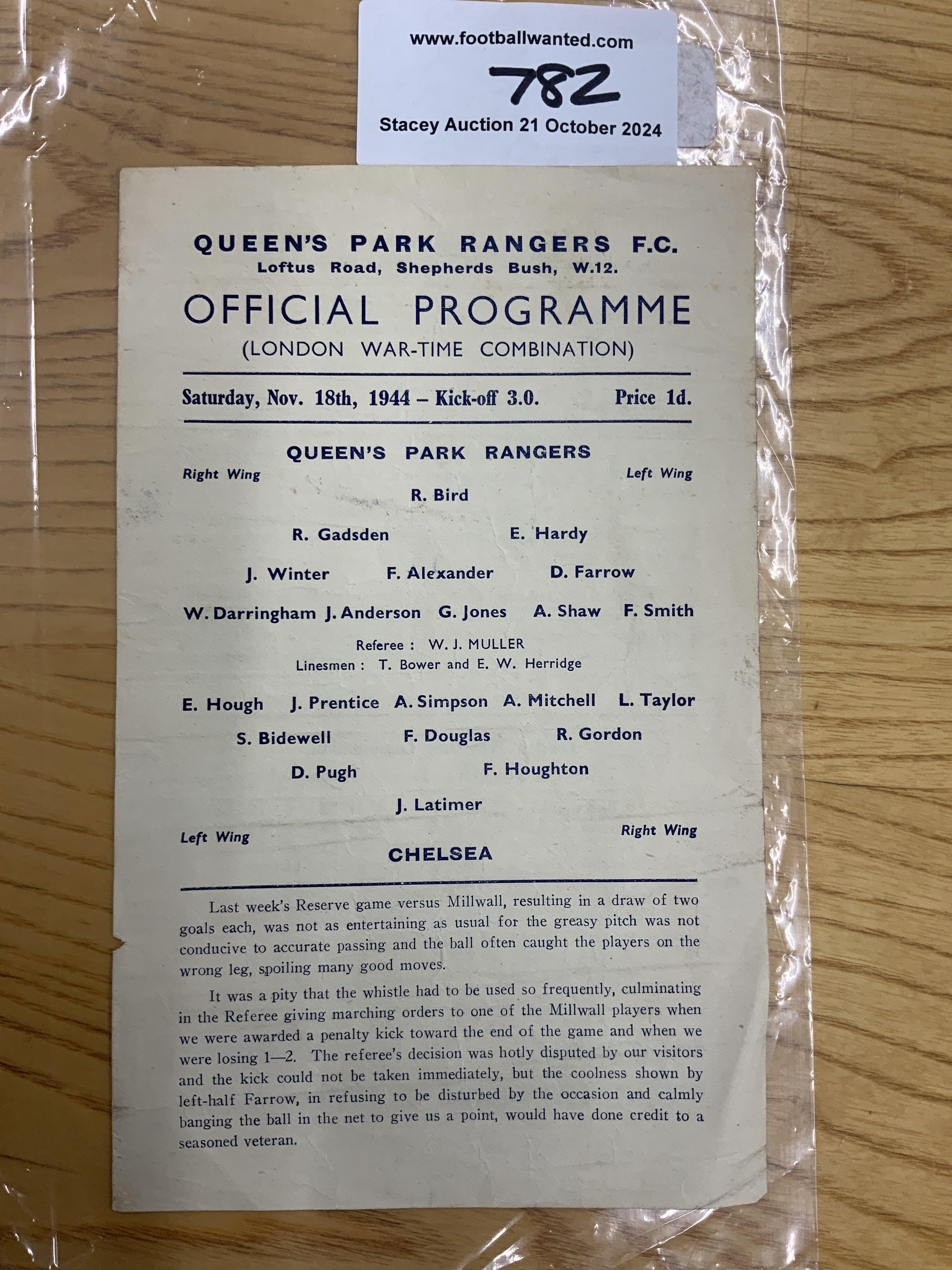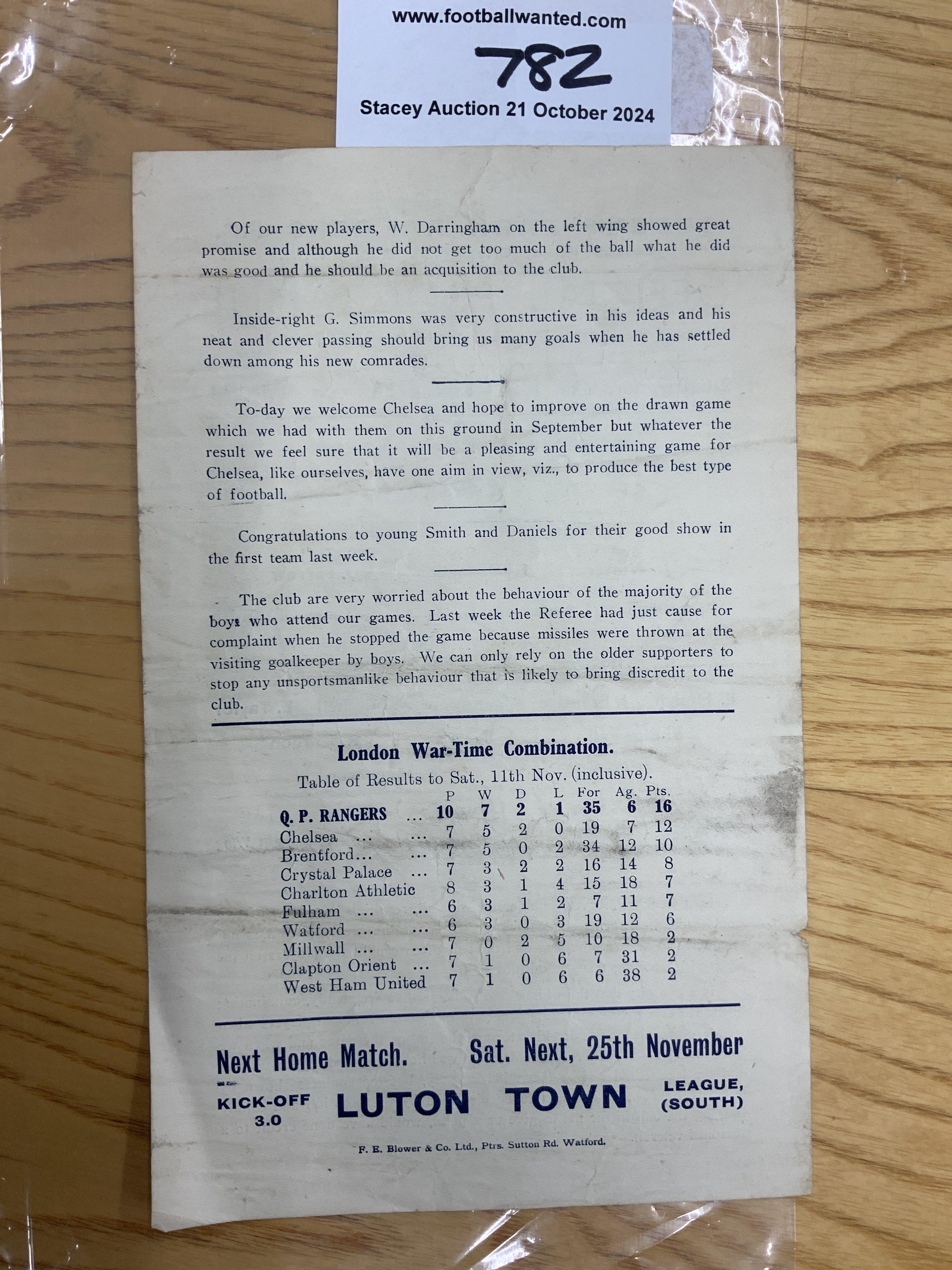 44/45 QPR Reserves v Chelsea Combination Football Programme: Hard to obtain single sheet reserves match dated 18 11 1944. Good condition with no team changes.