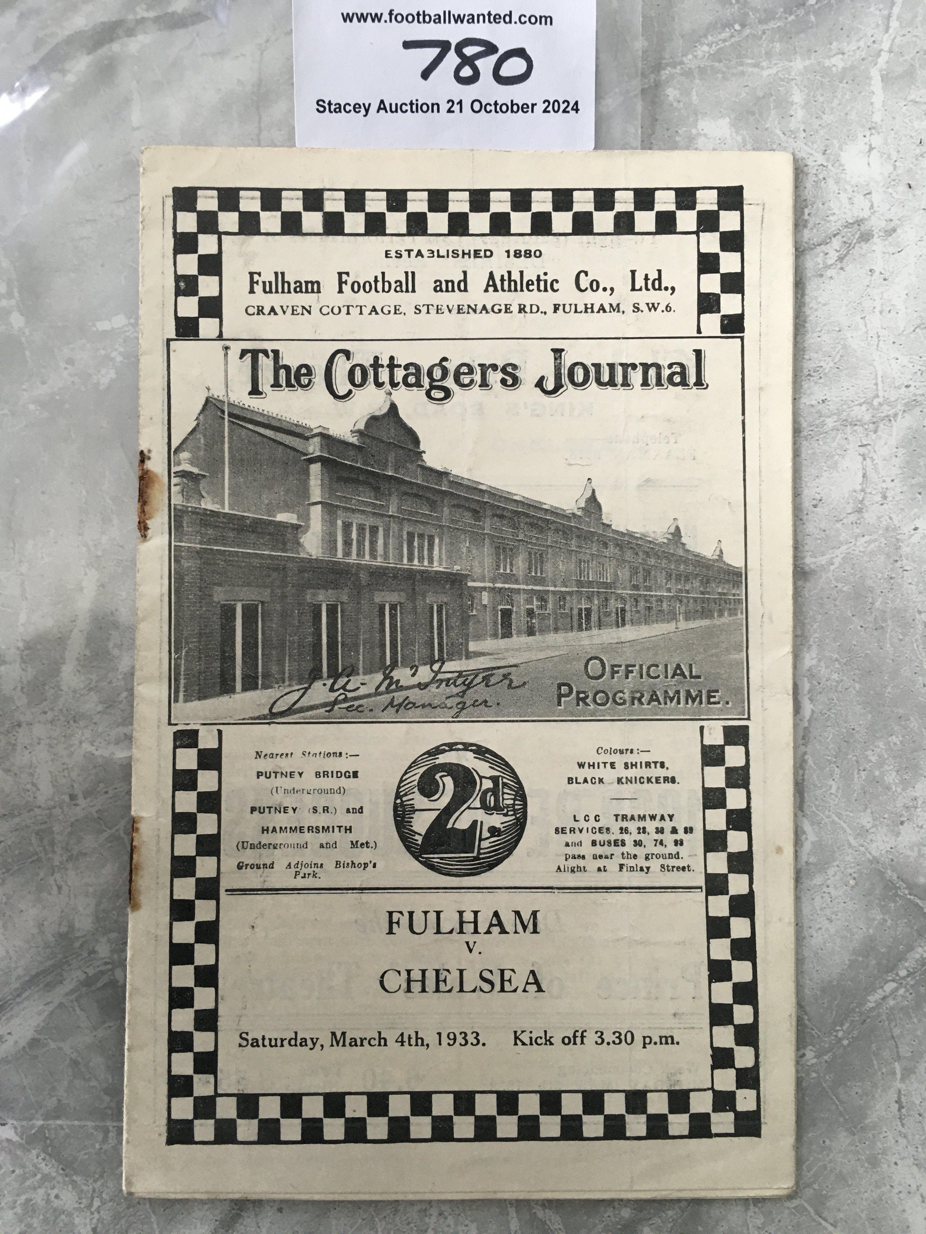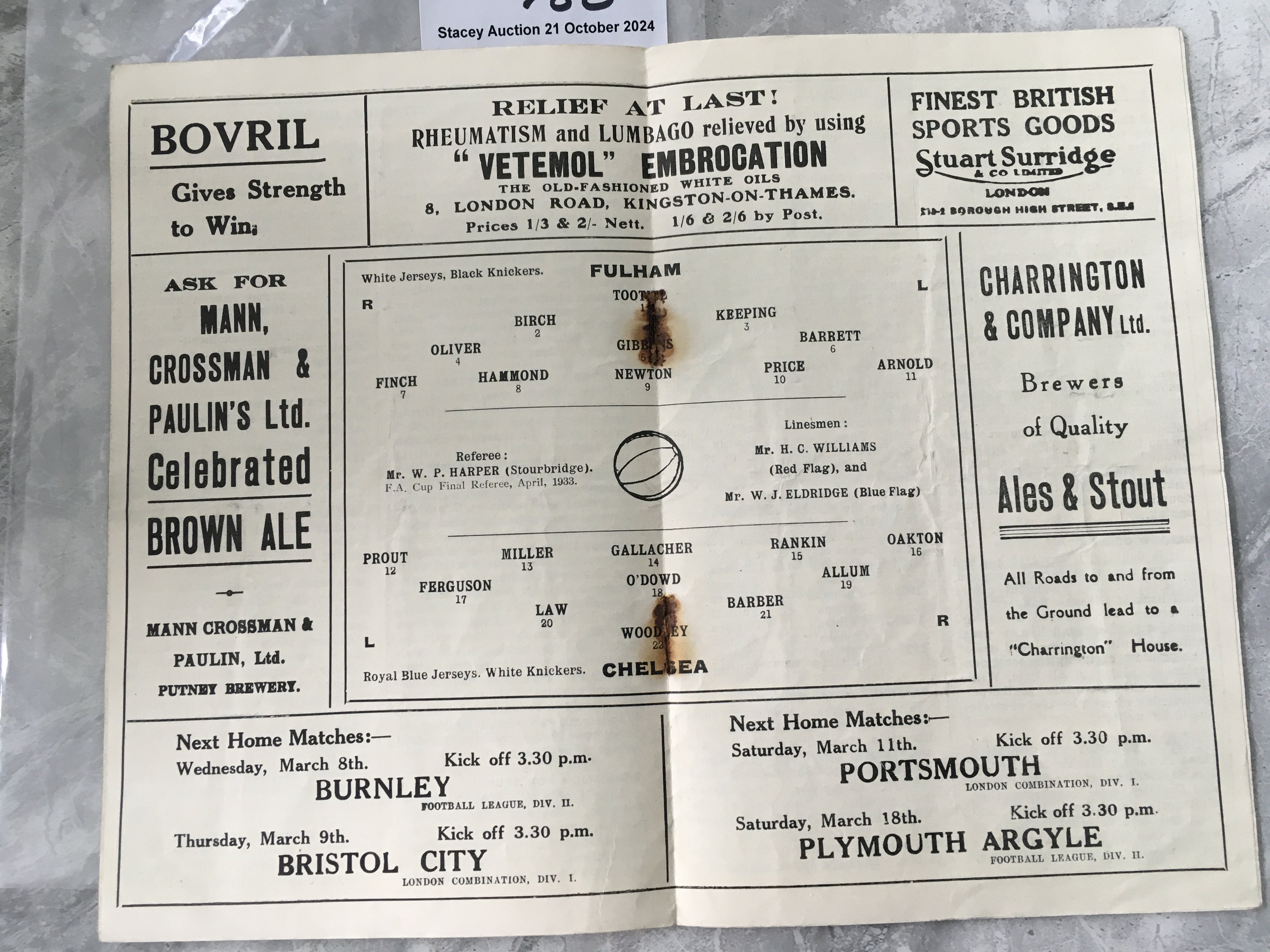 32/33 Fulham v Chelsea Friendly Football Programme: Dated 4 3 1933 with very rusty staples but no team changes.