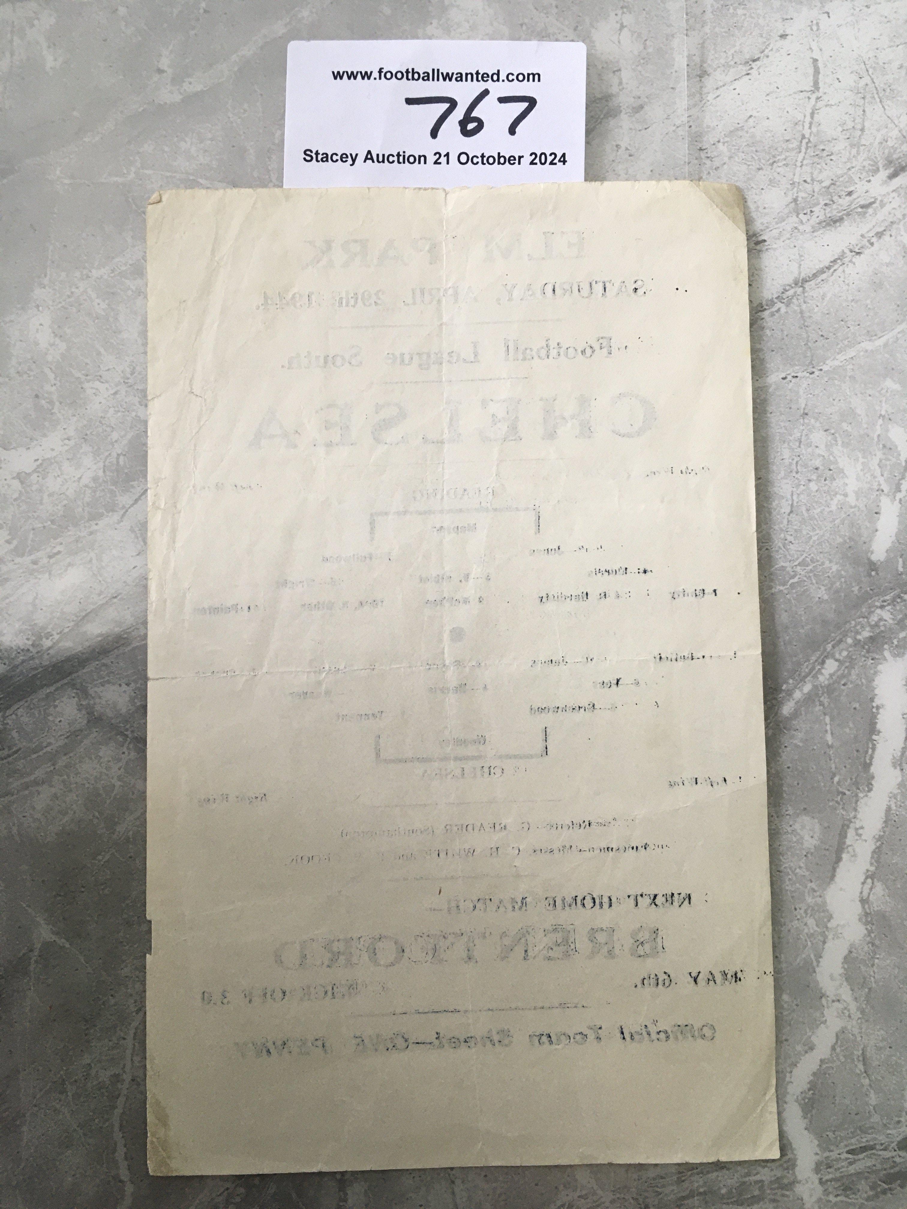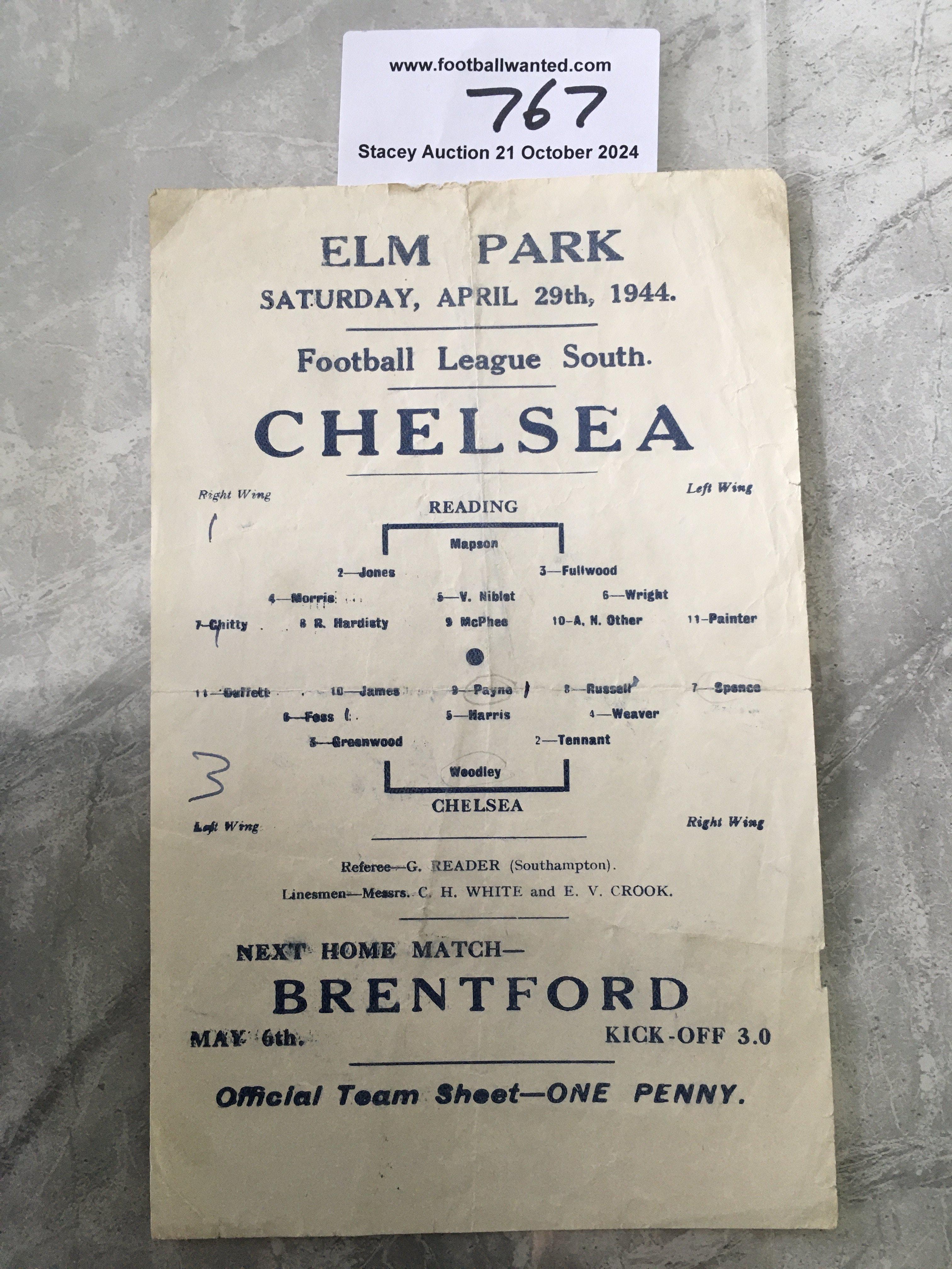 43/44 Reading v Chelsea Football Programme: Chelsea home game and hastily arranged to be played at Elm Park due to non availability of Stamford Bridge. Single sheet league match dated 29 4 1944 with score and scorers noted. Fold but overall good.