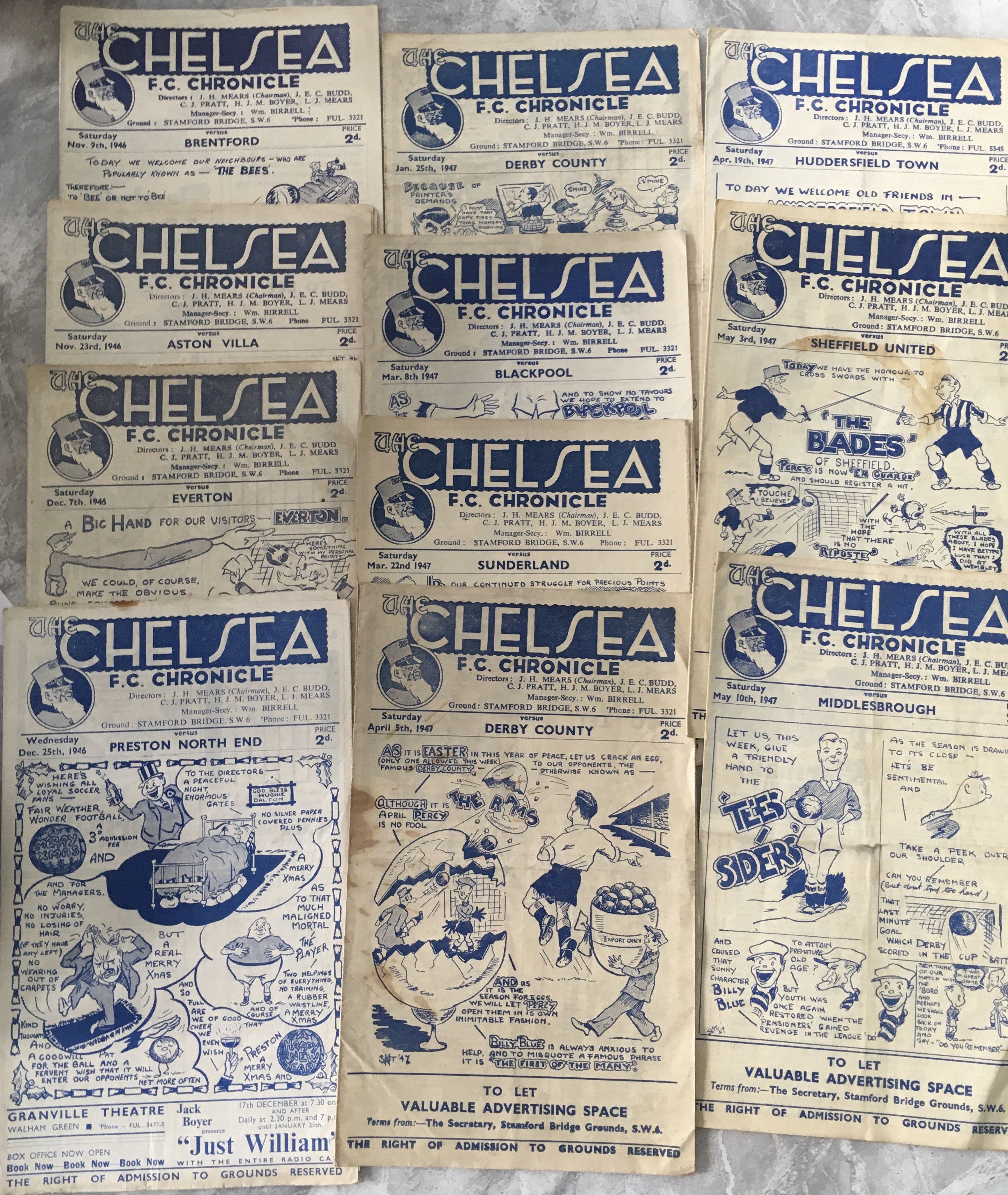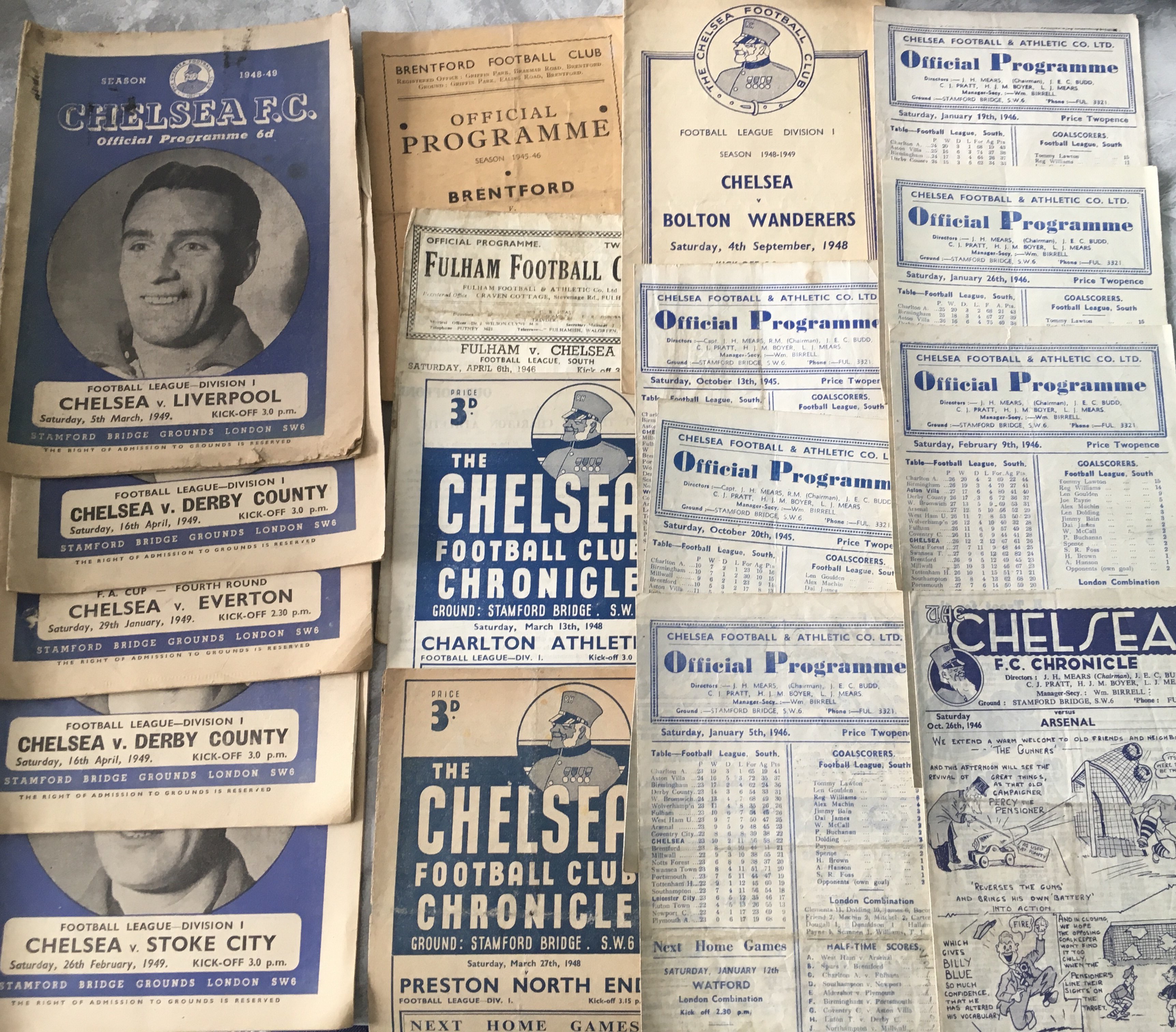 Chelsea 1940s Home Football Programmes: 45/46 x 5, 46/47 x 12, 47/48 x 2, 48/49 x 6 plus 2 aways at 45/46 Fulham and Brentford. Fair. (25)