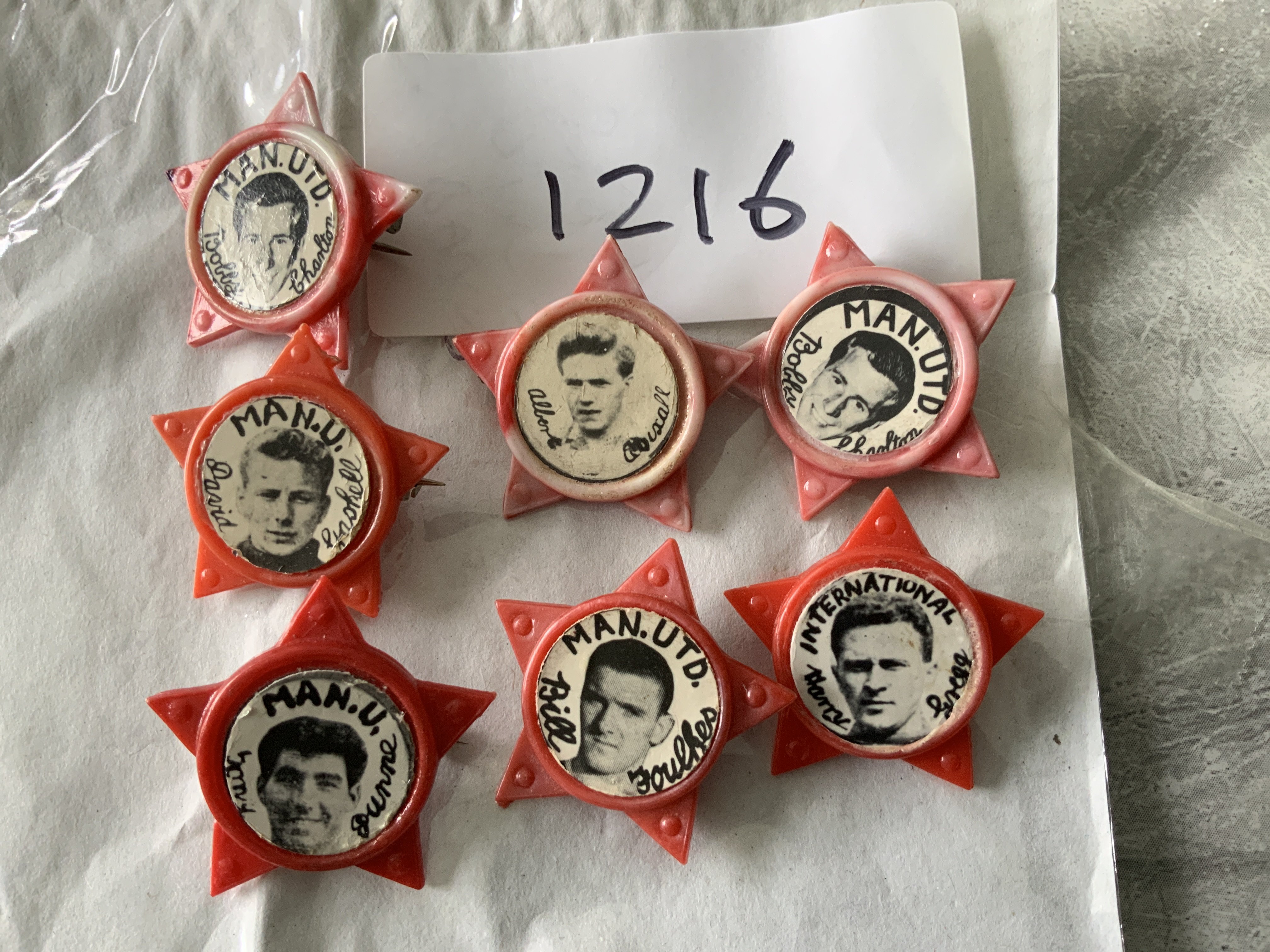 1960s Manchester United Football Star Badges: Original old pin badges of players. Includes Foulkes Gaskell Dunne Quixall Gregg and Charlton x 2. Good. (7)
