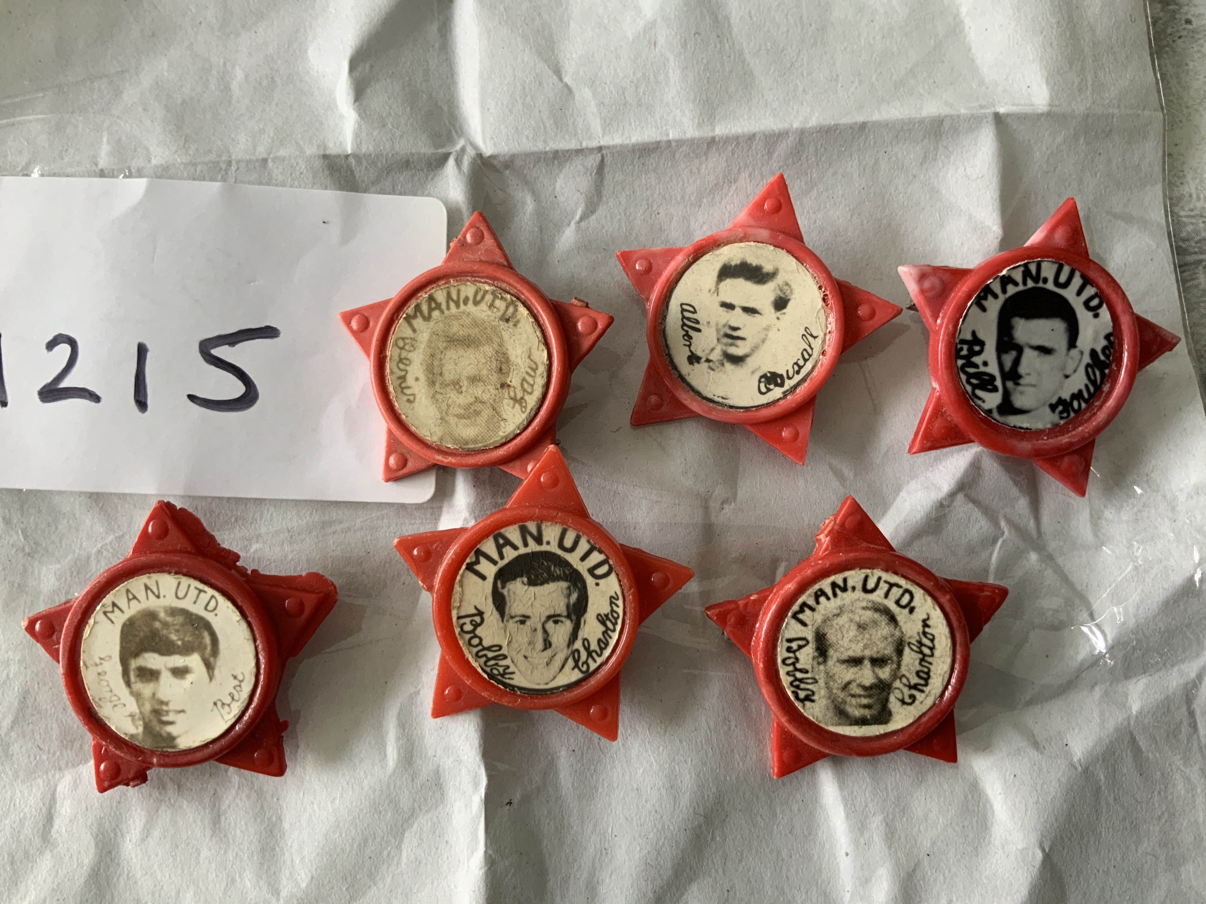 1960s Manchester United Football Star Badges: Original old pin badges of players. Includes Foulkes Law Best Quixall and 2 variations of Charlton. Good. (6)