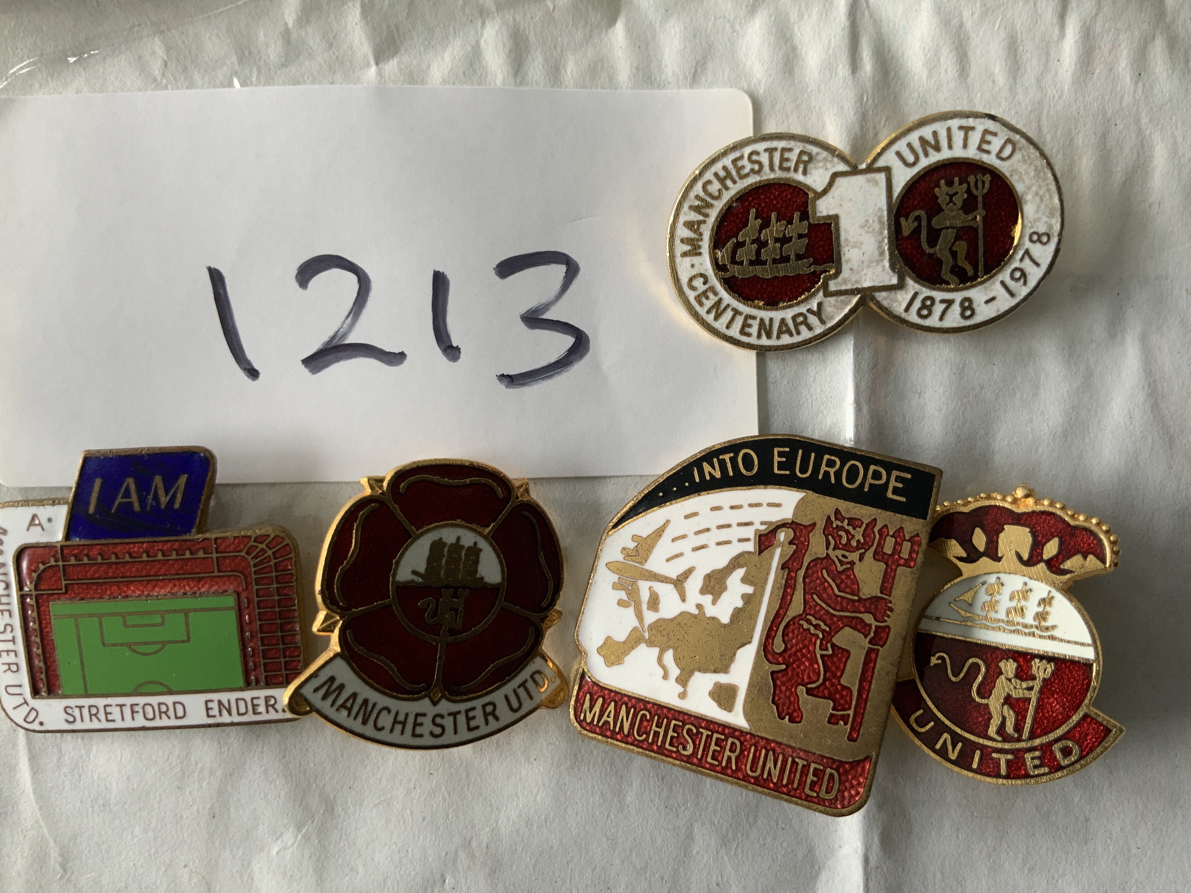 Manchester United Coffer Football Badges: Original old pin badges to include subjects such as 1978 100 Years, Into Europe and Stretford Ender. Good. (5)