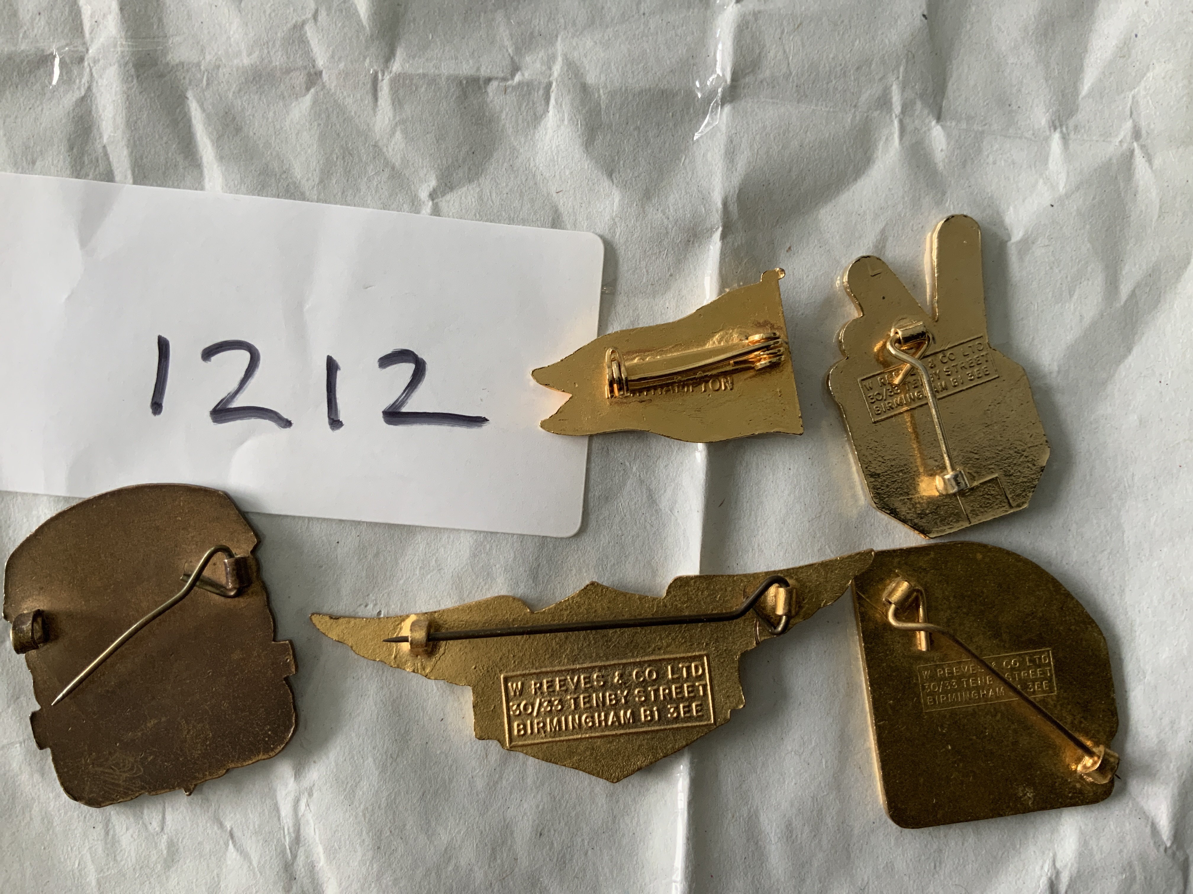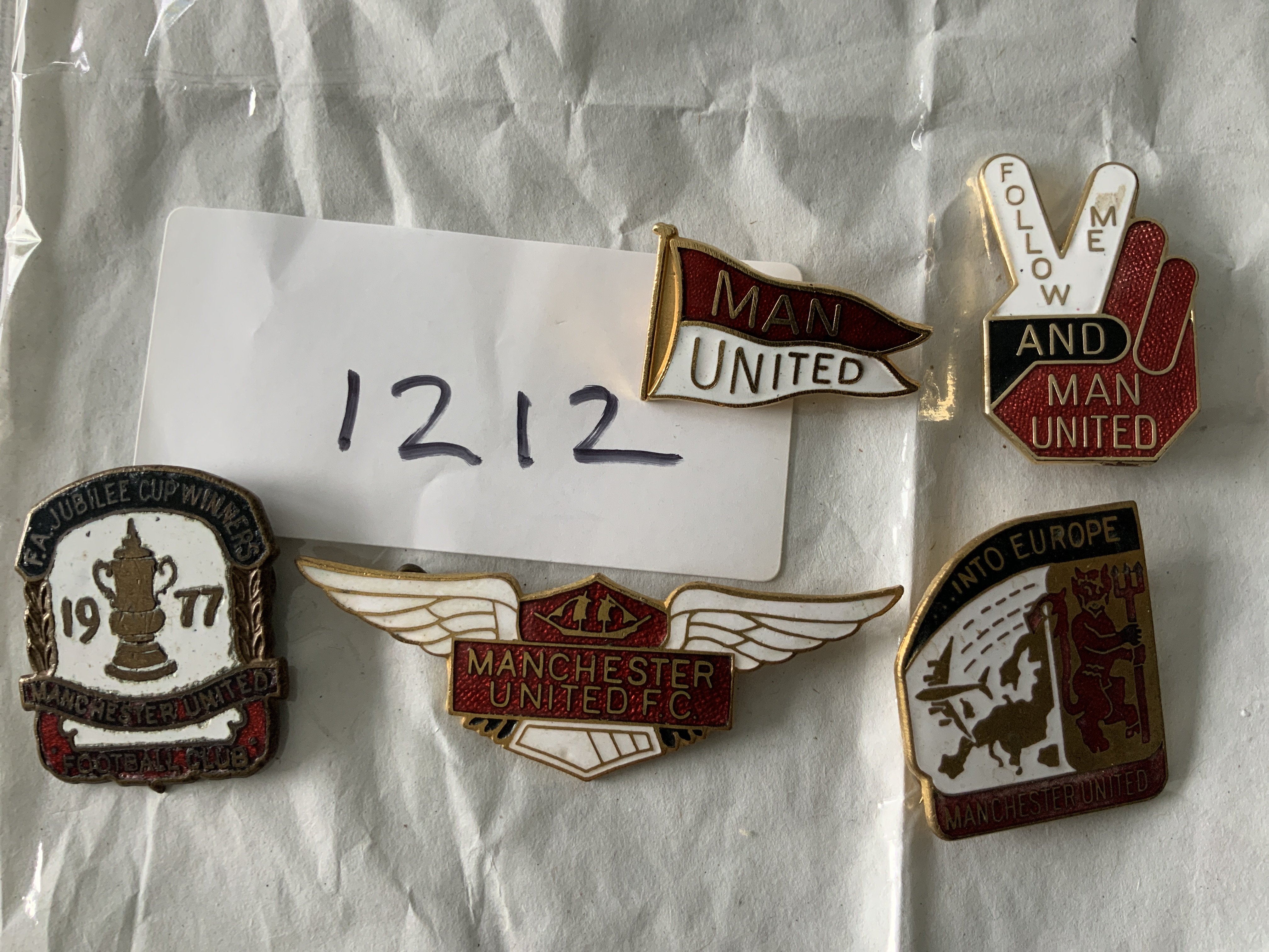 Manchester United Coffer Football Badges: Original old pin badges to include subjects such as 1977 Jubilee Cup Winners, Follow Me and United and Into Europe. Good. (5)