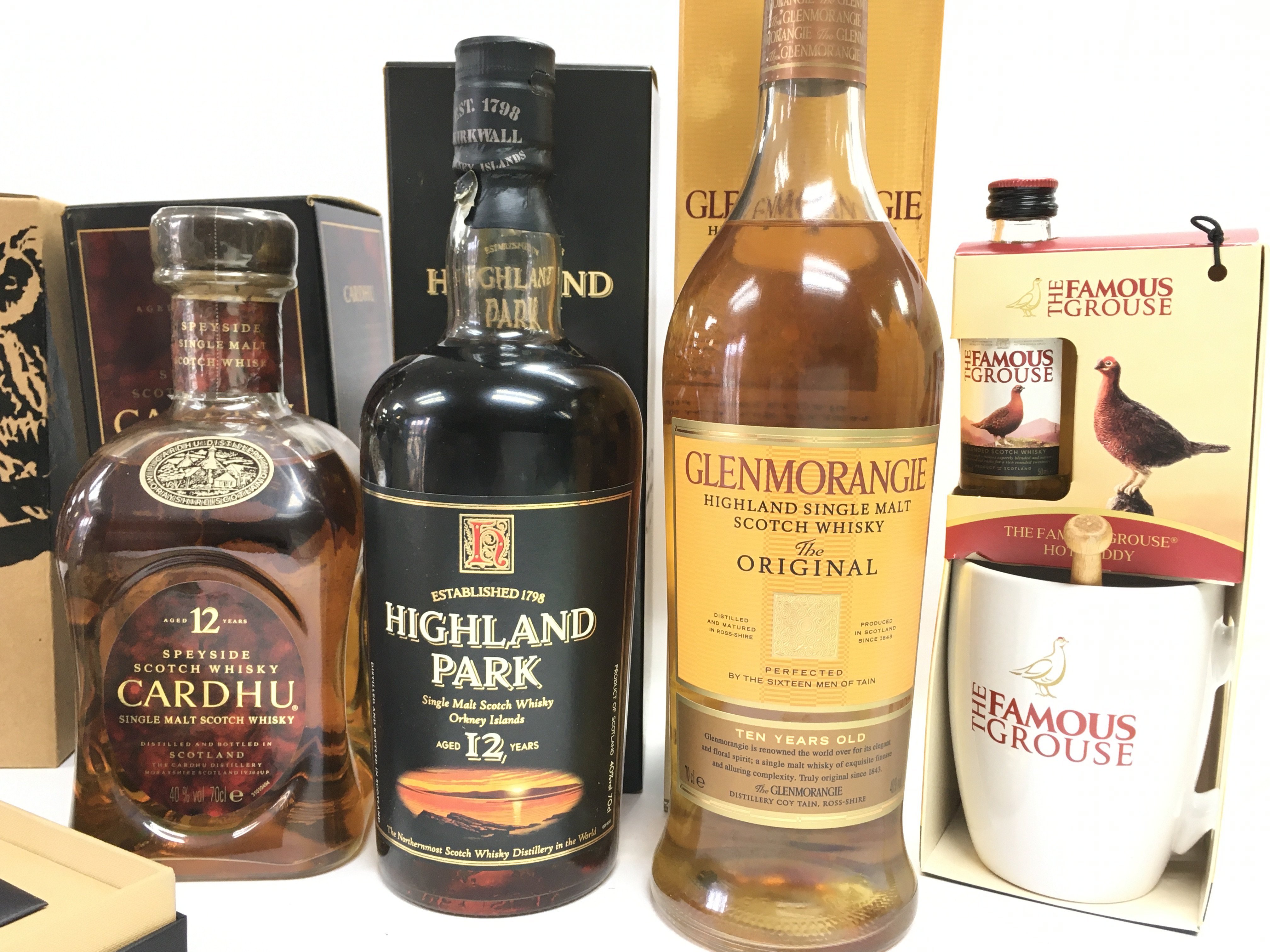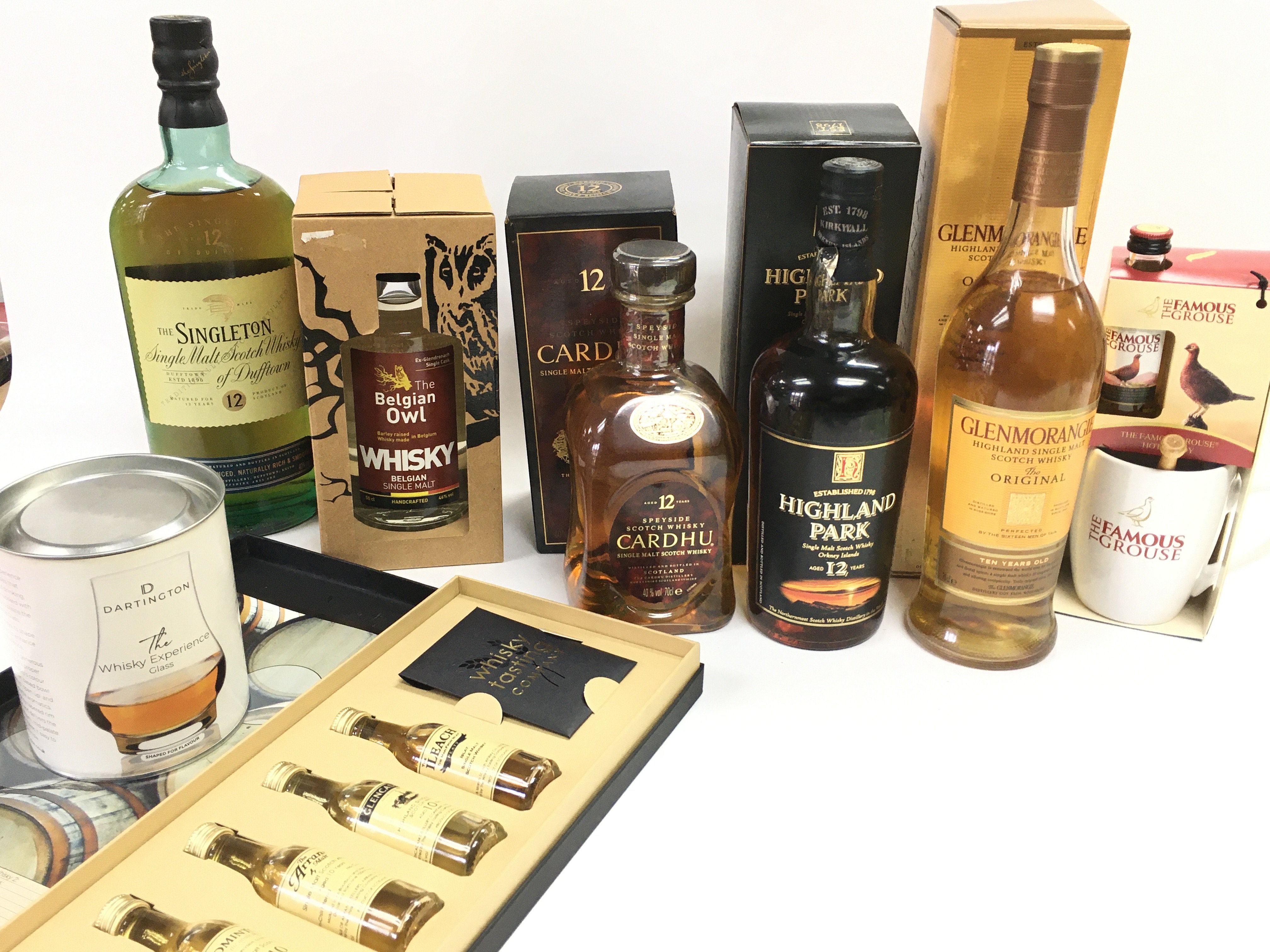 A Collection of whiskeys including Cardhu 12 year single malt scotch whiskey, Highland park 12 year single malt scotch whisky, Glenmorangie, The Belgian owl, The Singleton single malt scotch whisky etc. this lot cannot be posted