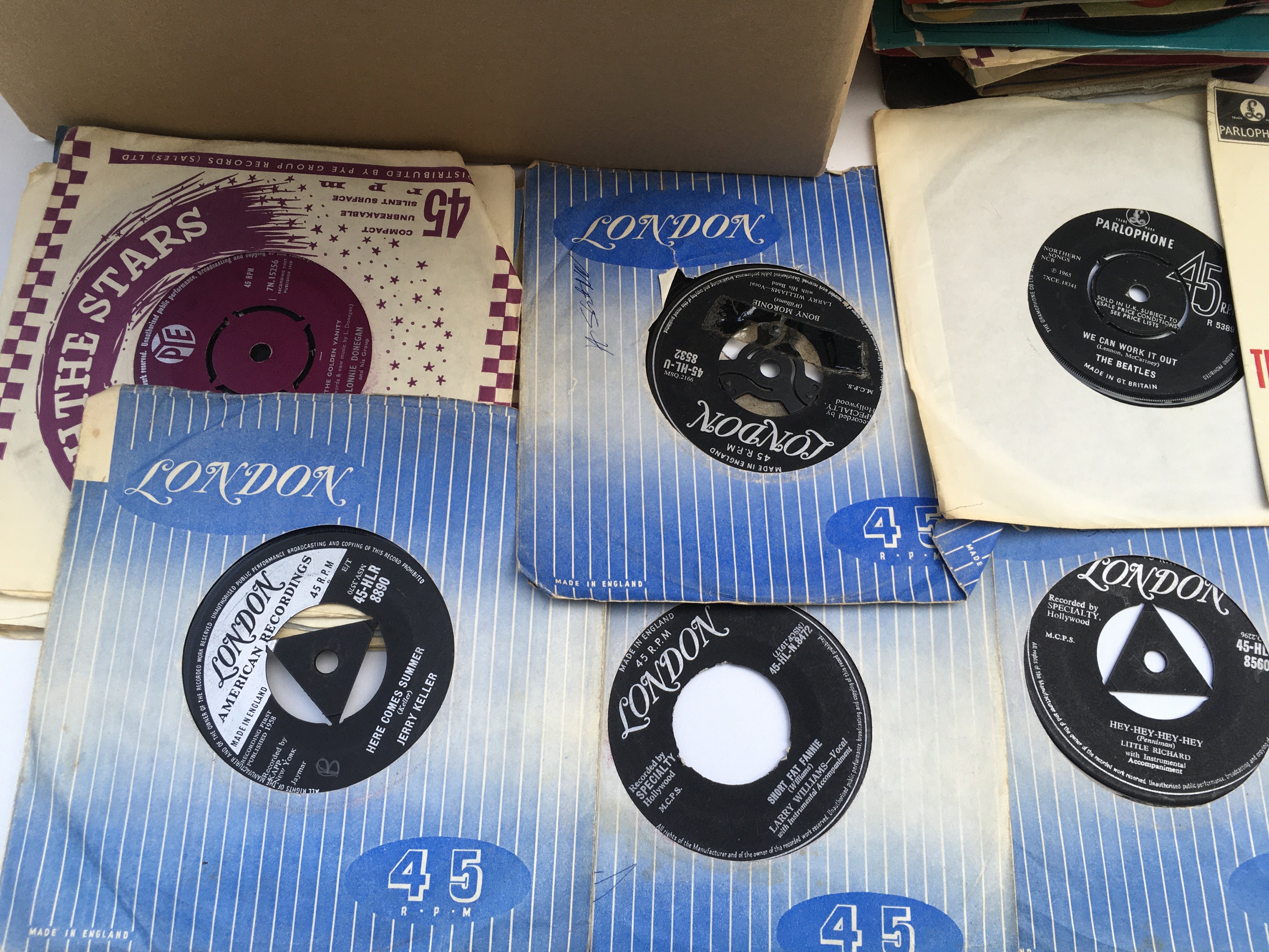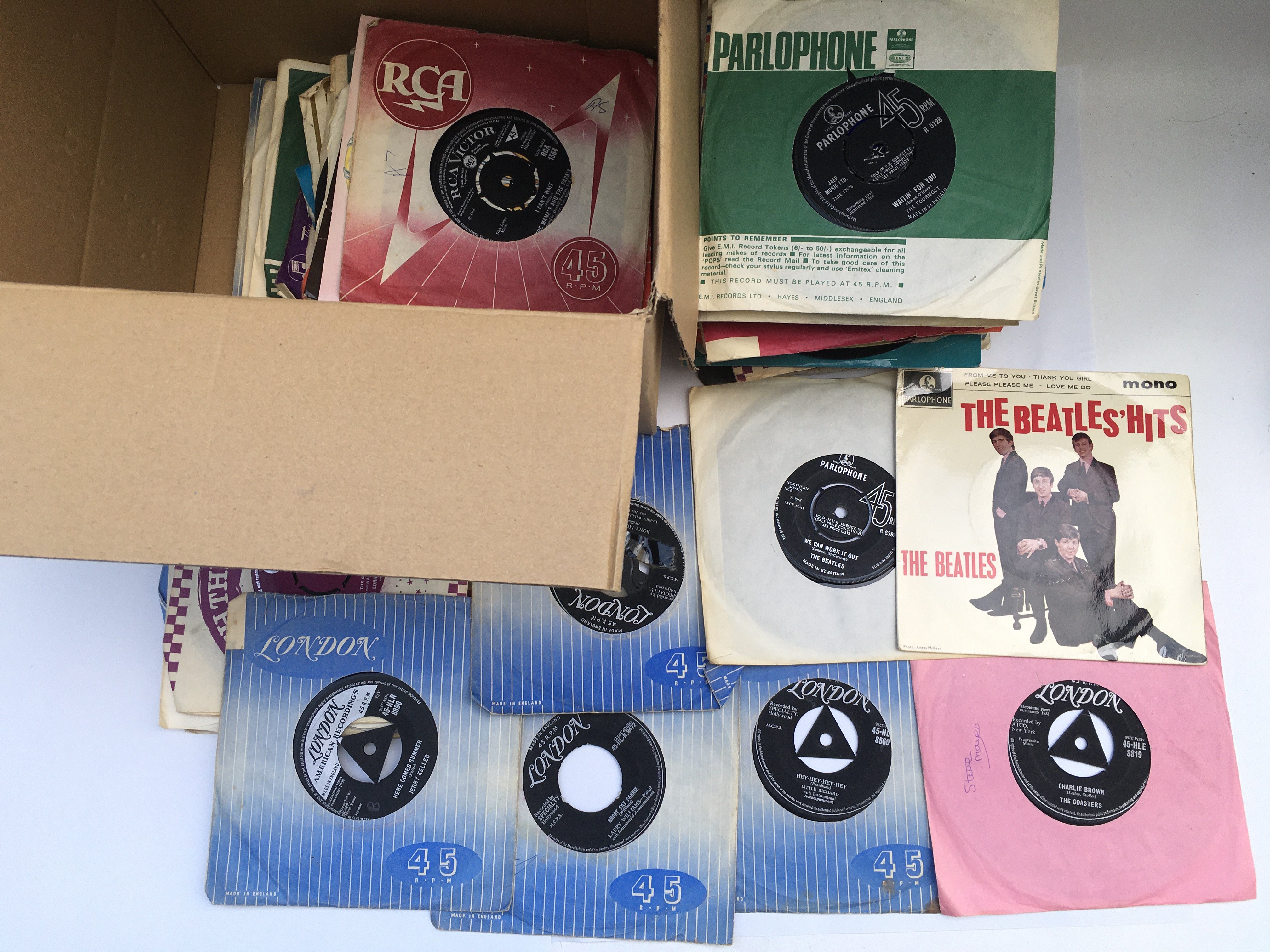 A box of 7" singles and EPs by various artists from the 1950s onwards including Little Richard, Larry Williams, Elvis Presley, The Beatles and many more.