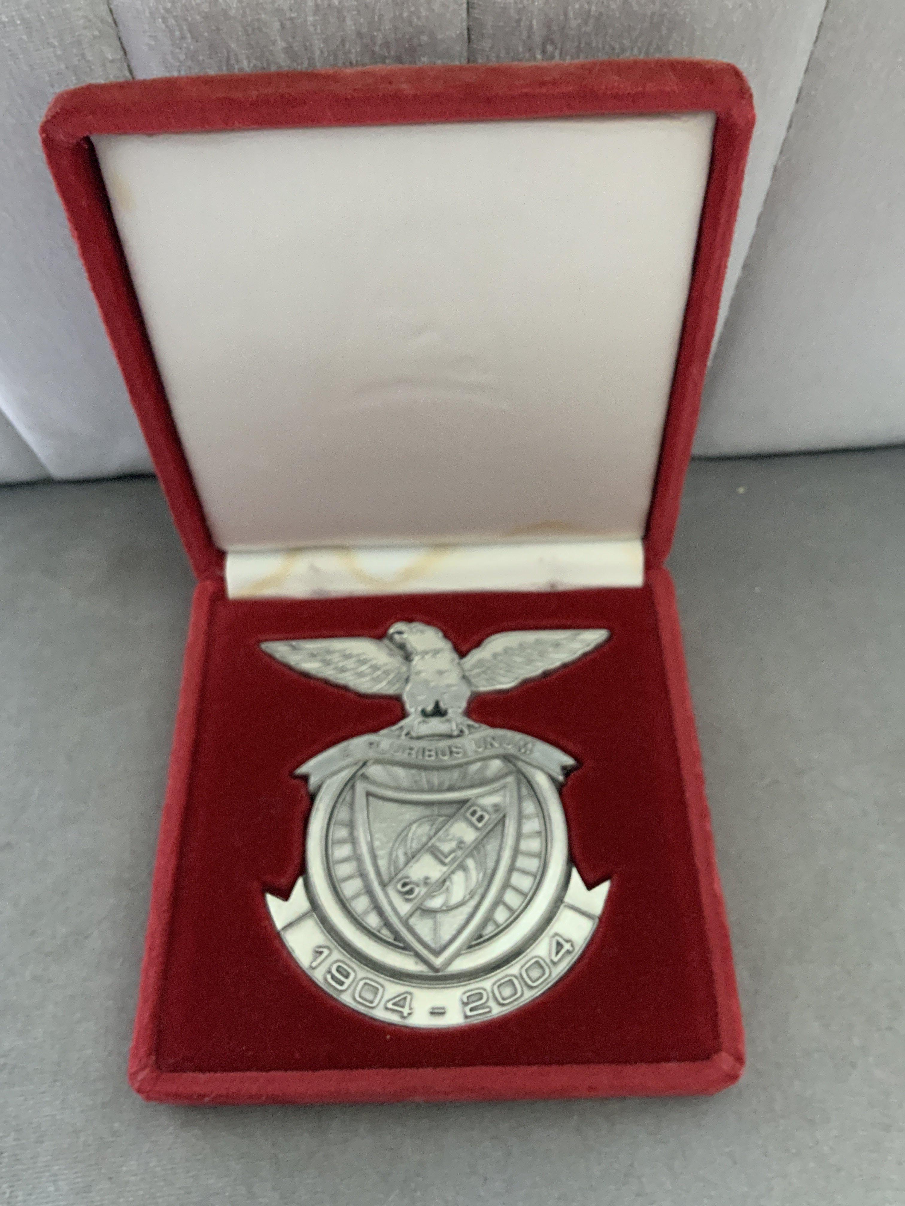 Benfica Centenary Boxed Football Emblem: 1904 - 2004 metal plaque measuring 10 x 10 cm in red suede effect case. Nice item.