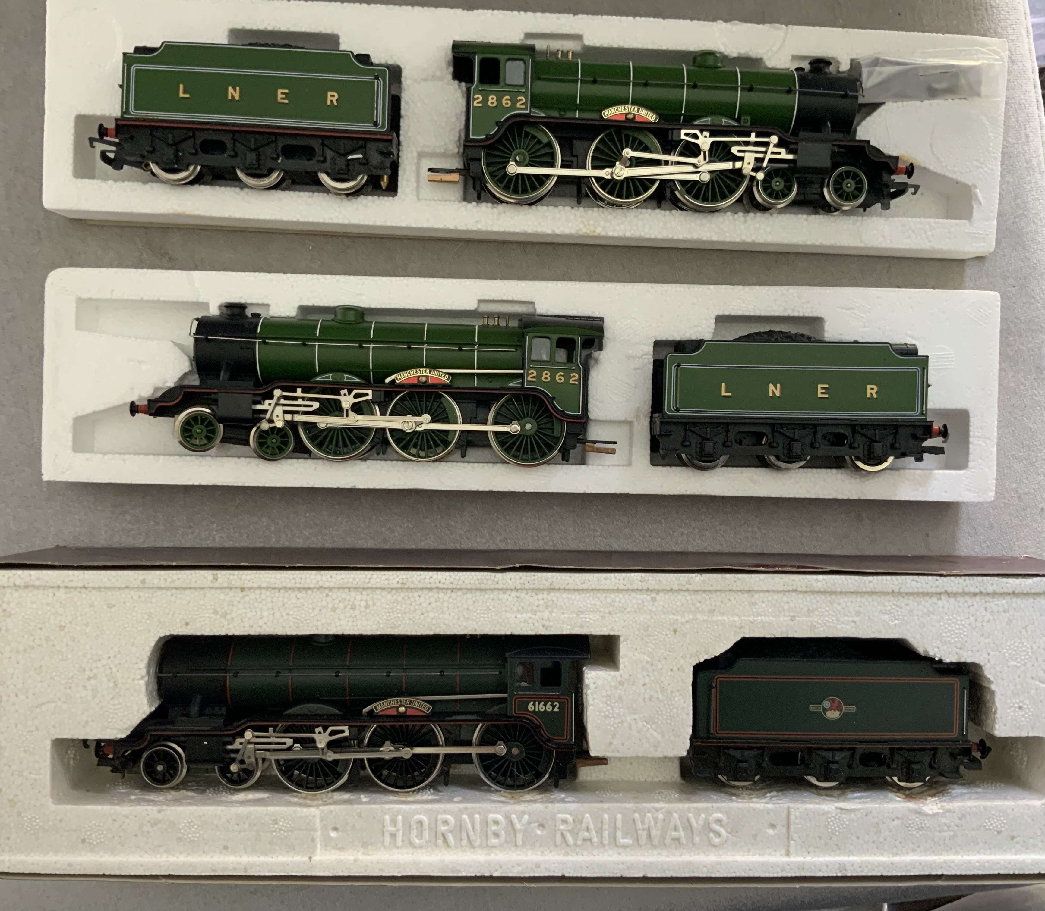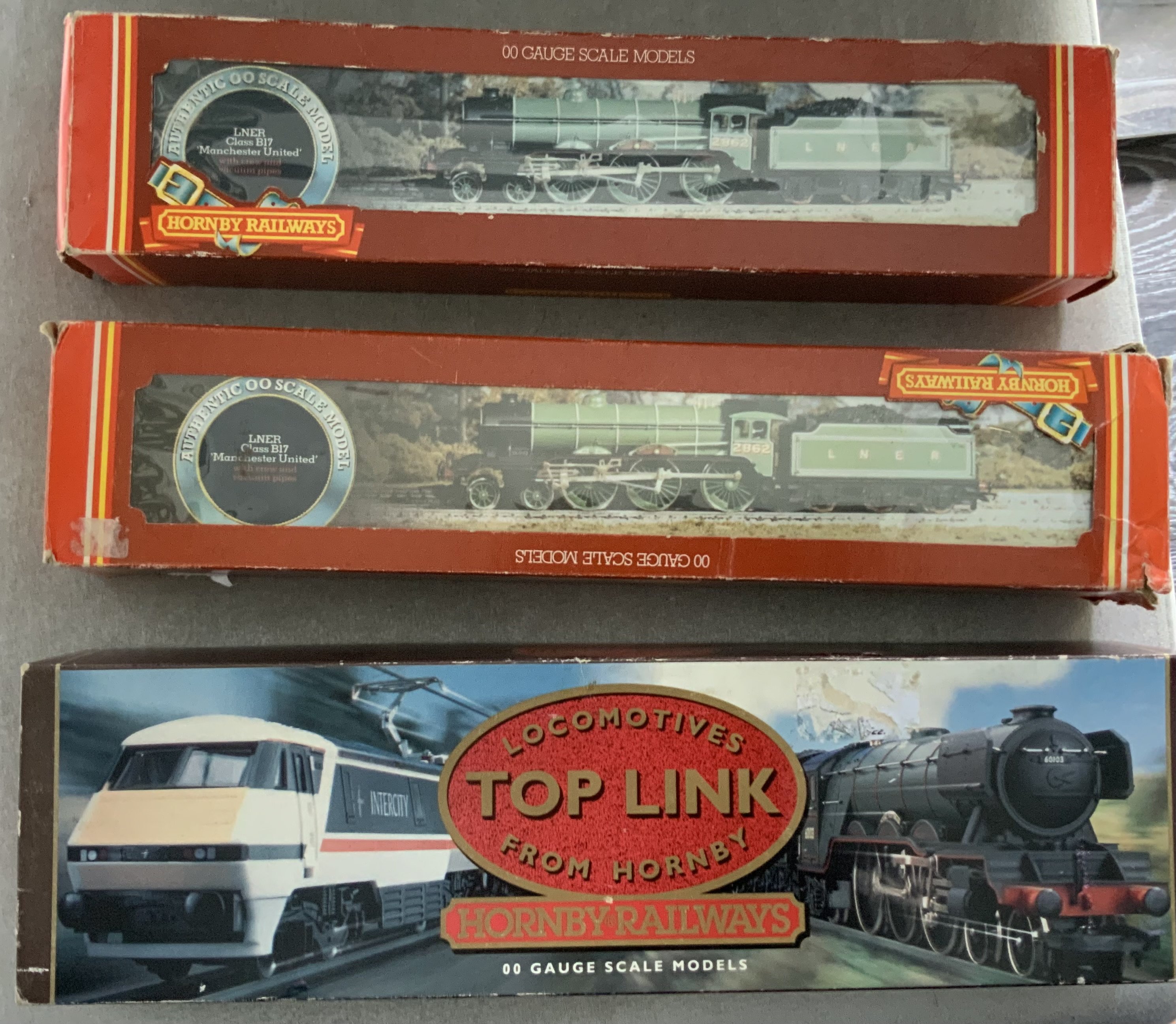 Manchester United Hornby Railway Engines: Three boxed engines with contents excellent and boxes good with the odd scuff. Includes two LNER Class B17 and a BR Class B17/4. (3)