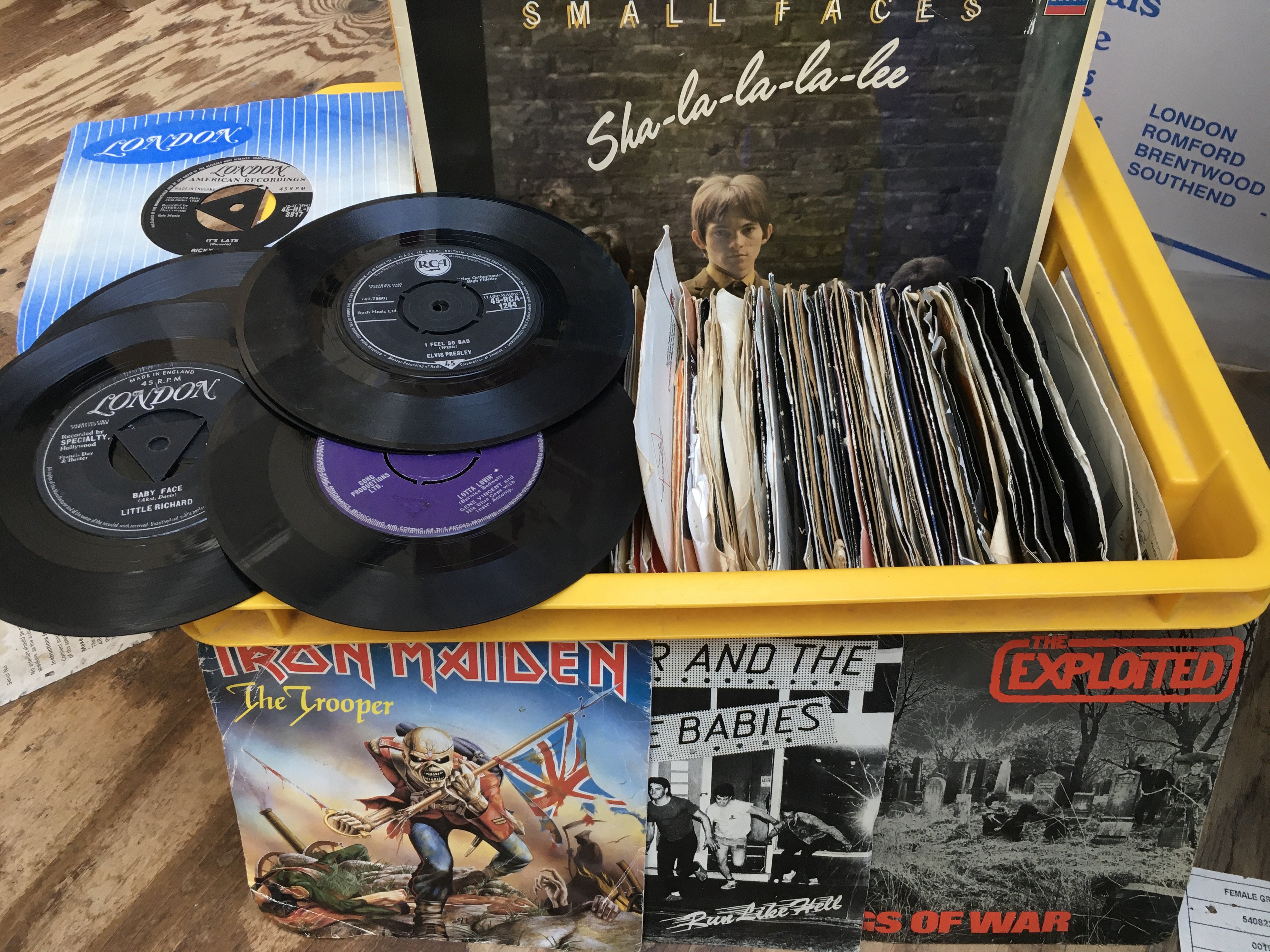 A crate of LPs and 7" singles by various artists from the 1960s onwards including Small Faces, Little Richard, Iron Maiden and many more.
