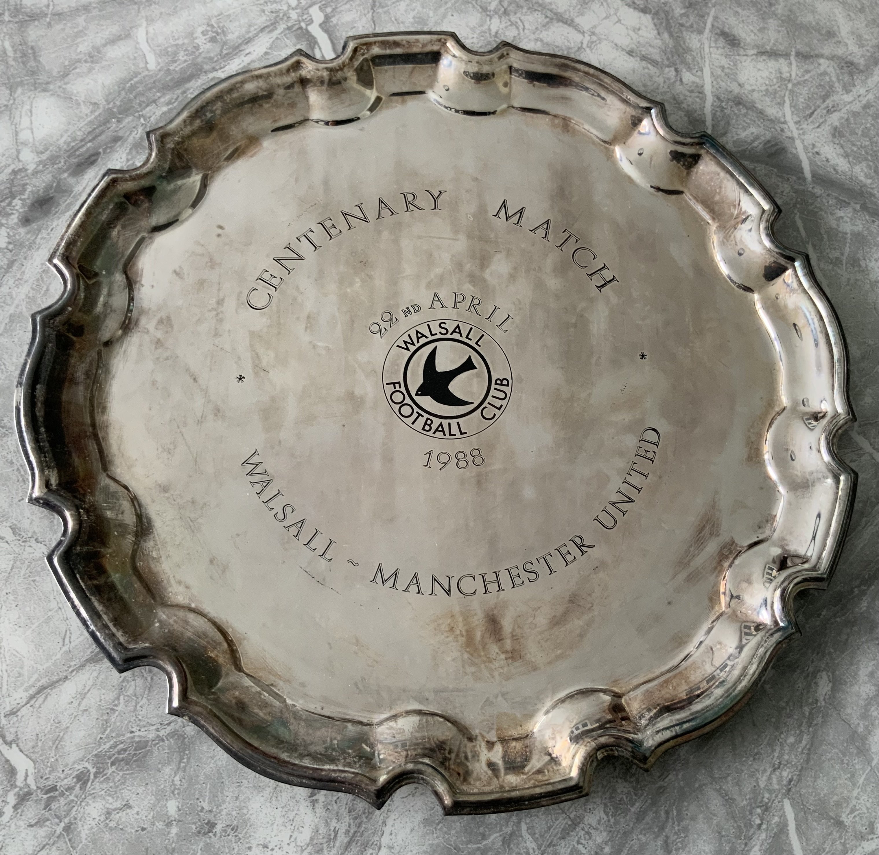 1988 Walsall v Manchester United Centenary Tray: Silver coloured large tray with the Words Centenary Match 22nd April 1988 around the Walsall swift logo. Walsall - Manchester United also embossed. Tarnished.