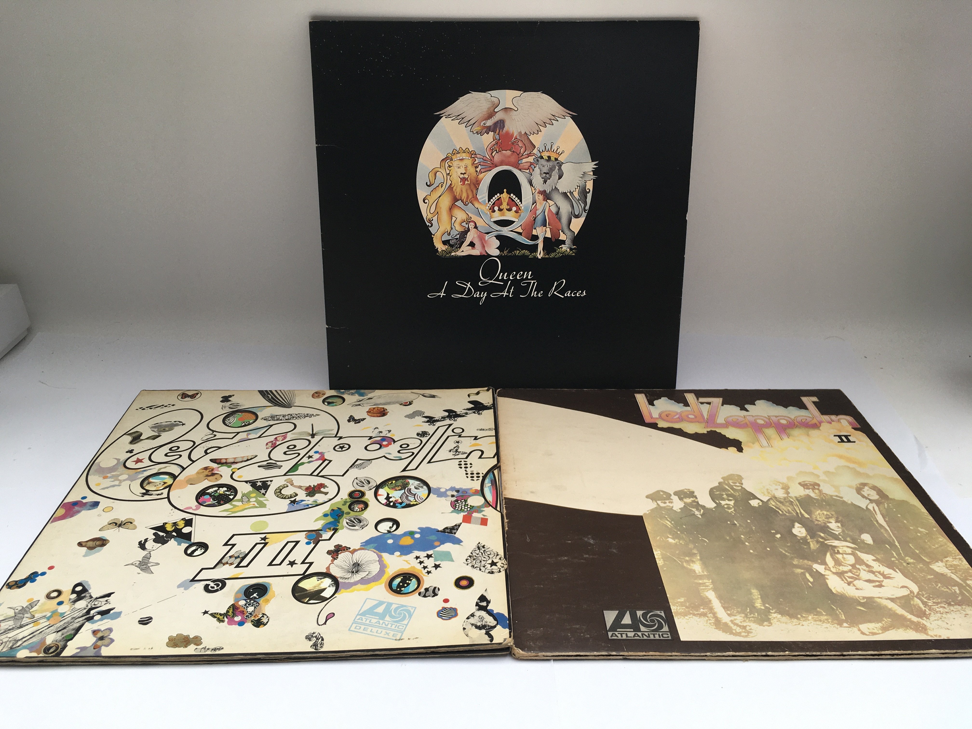 Two early pressings of Led Zeppelin LPs on red/plum Atlantic labels comprising 'II' and 'III' and 'A Day At The Races' by Queen (3).