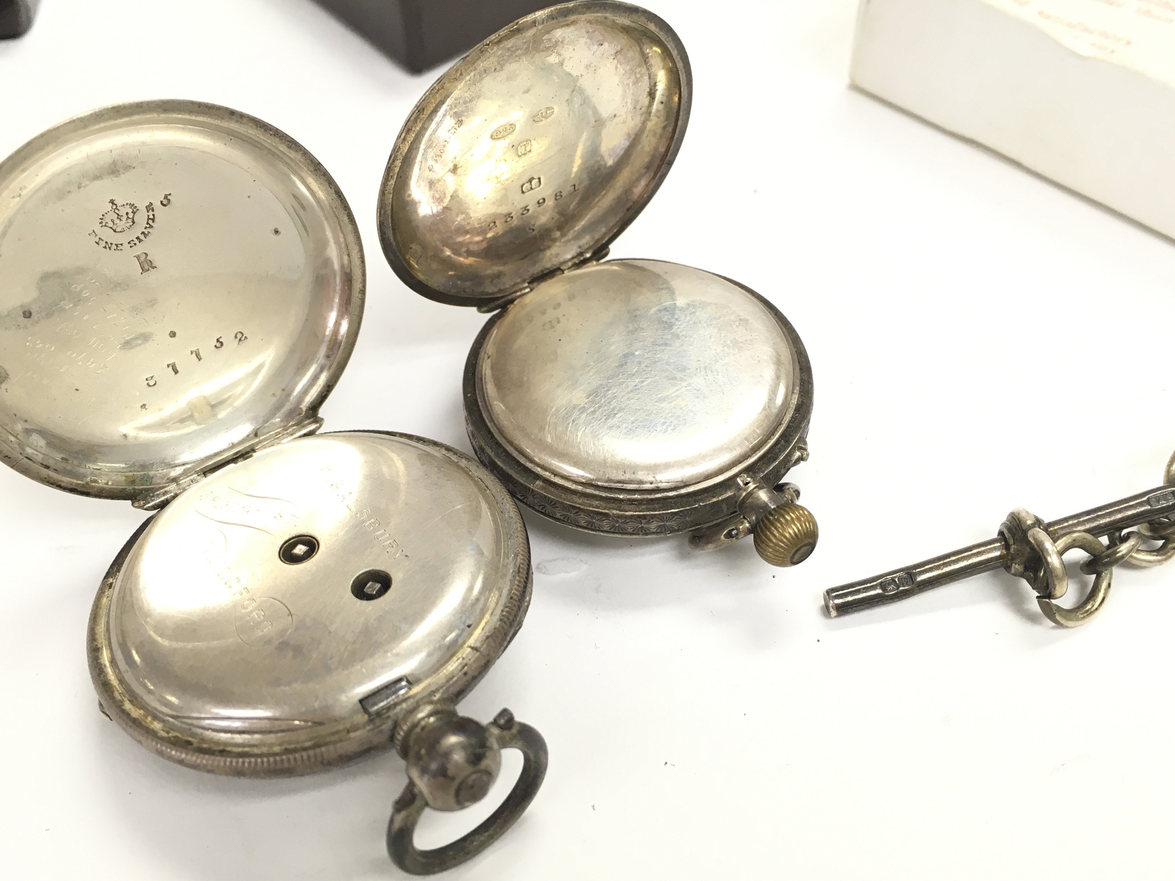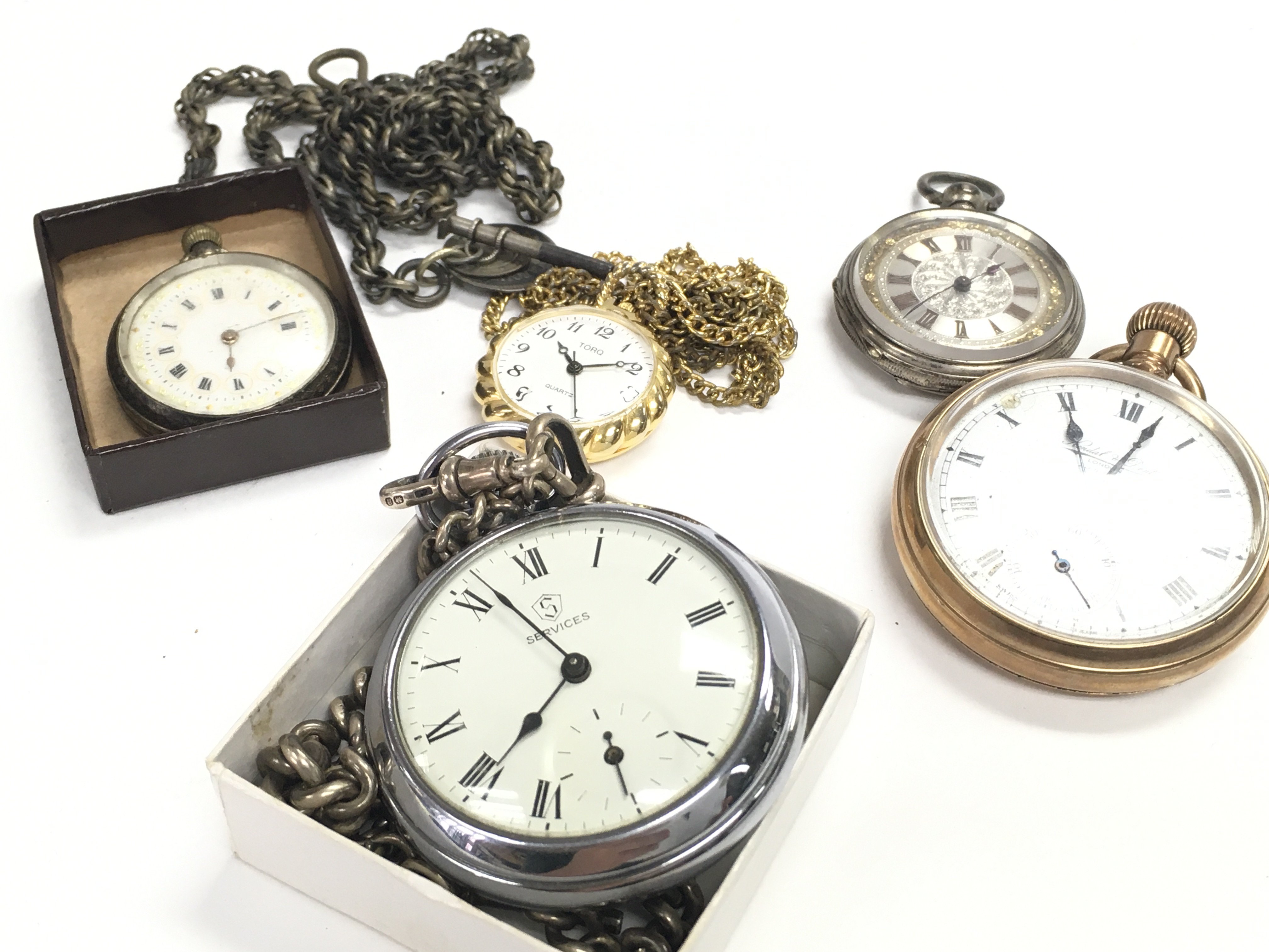 A Collection of pocket watches including some silver cased examples, a Services watch with a silver hallmarked chain. This lot cannot be posted
