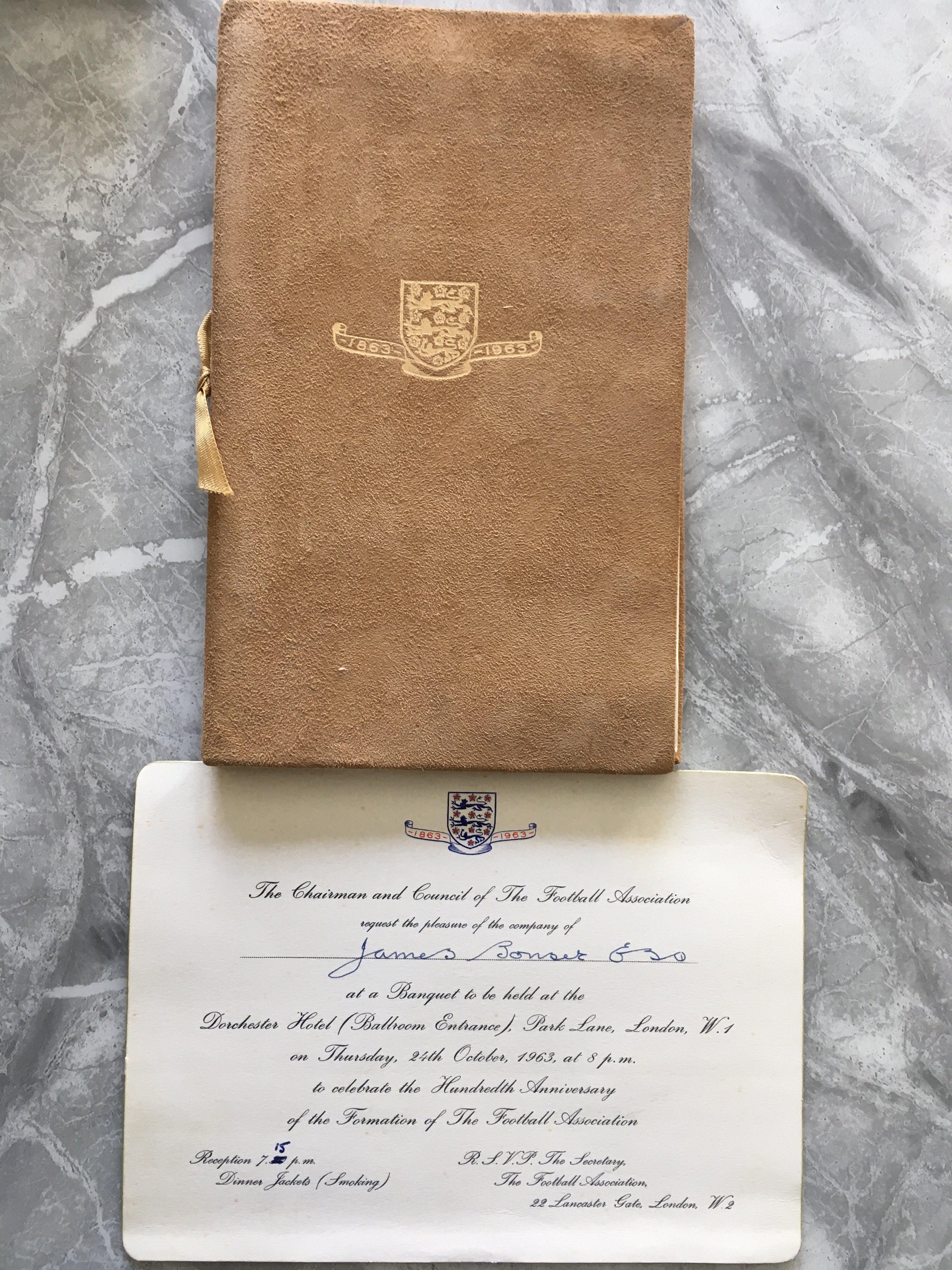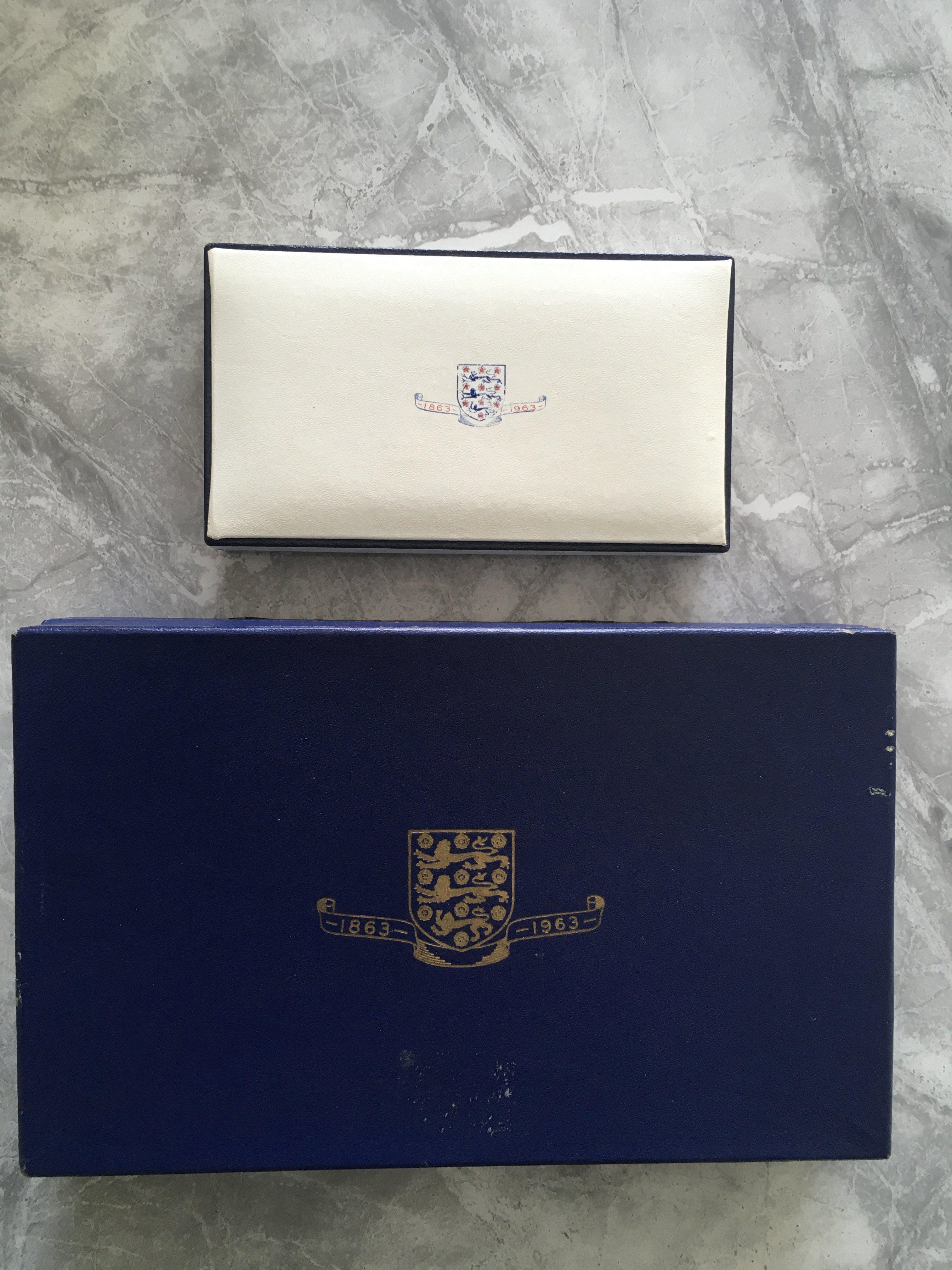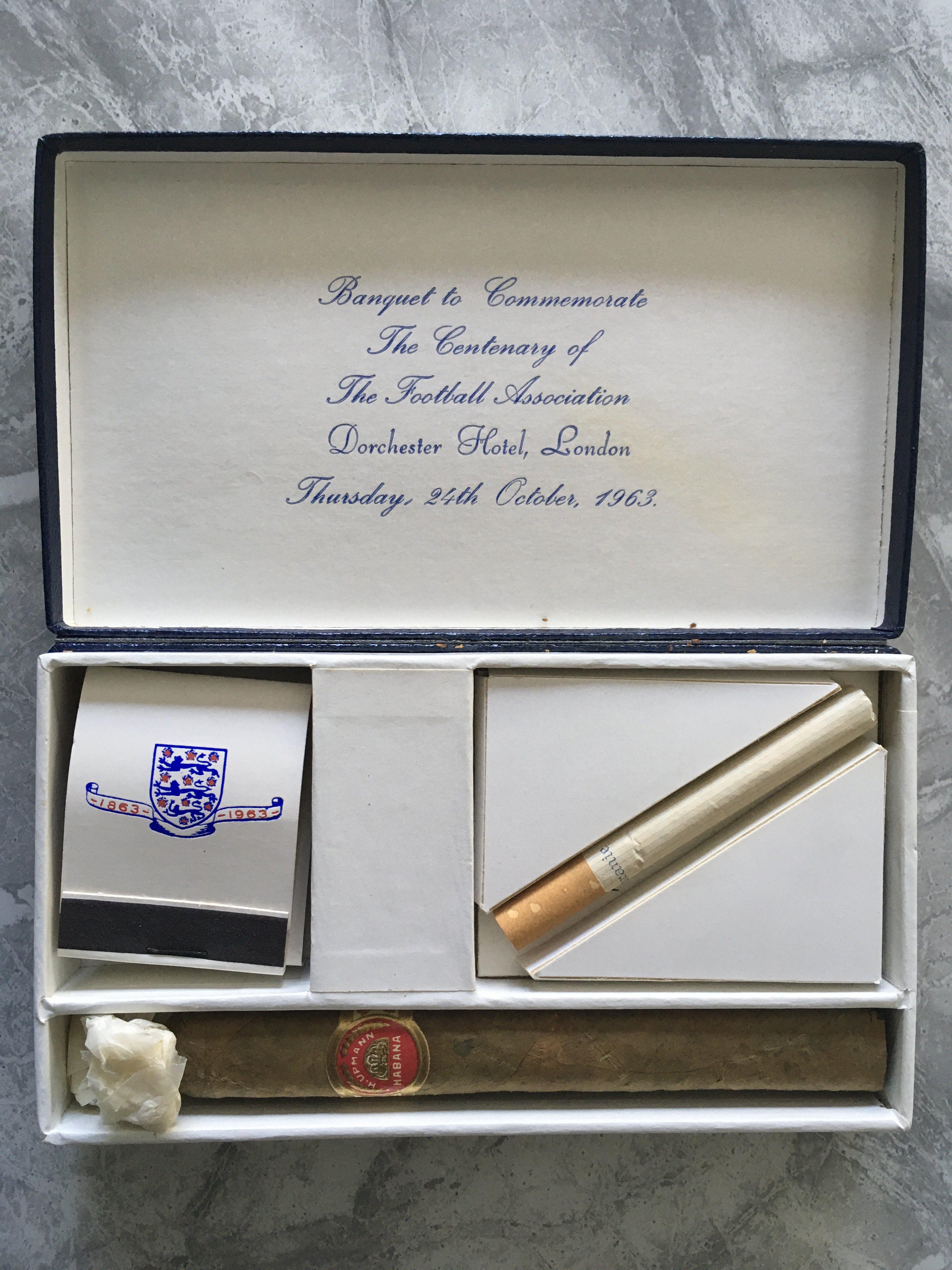 1963 FA Centenary Football Memorabilia: Stunning gifts and keepsakes given to Watford Director and all distinguished guests. Invitation to the 100th anniversary of the Football Association dinner plus an embossed velvet feel tasseled list of guests. Gift set comprising of two soap dishes a pen and two badges all with centenary three lions logo. Lastly from the dinner table is a boxed cigarette, cigar and box of matches. Nice collection.