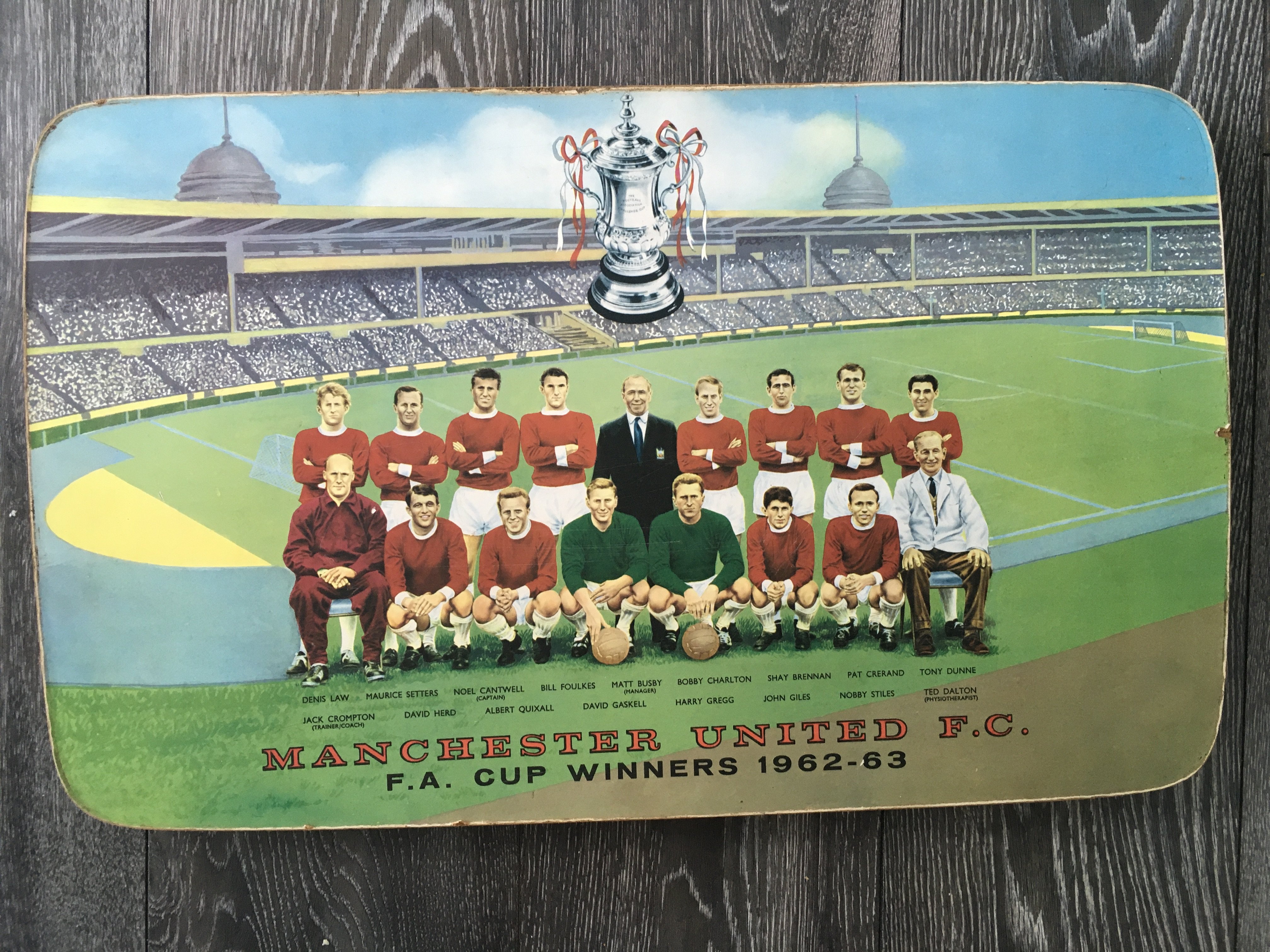 Manchester United 1963 FA Cup Final Team Group Table: Staff issue 2 foot long table with 4 legs that screw in. Stunning picture of the team with a Wembley back drop stating FA Cup Winners 1962-63. Tiniest chip to edge.