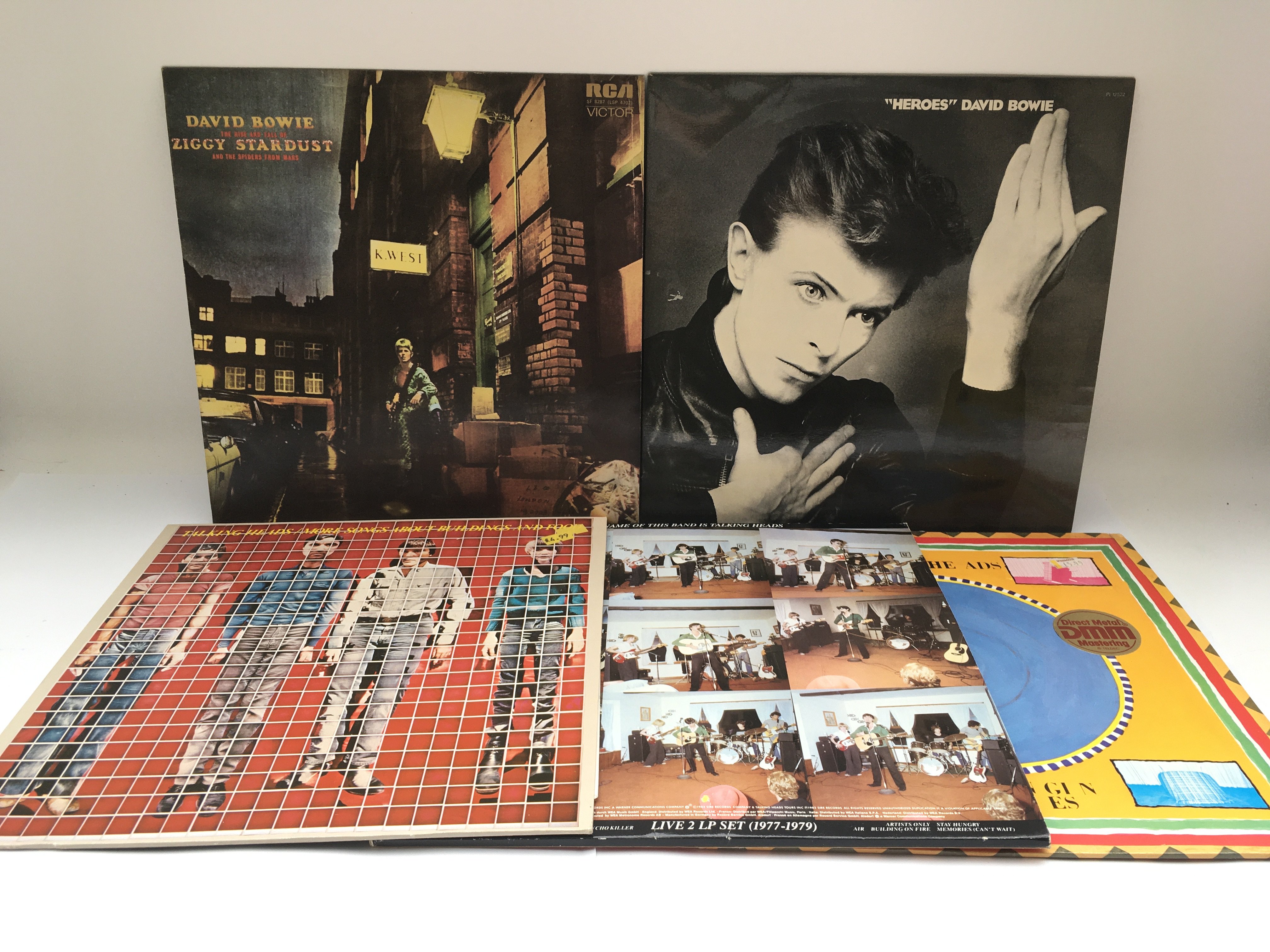 Two early pressings of David Bowie LPs comprising 'Ziggy Stardust' and 'Heroes' plus three LPs by Talking Heads (5).