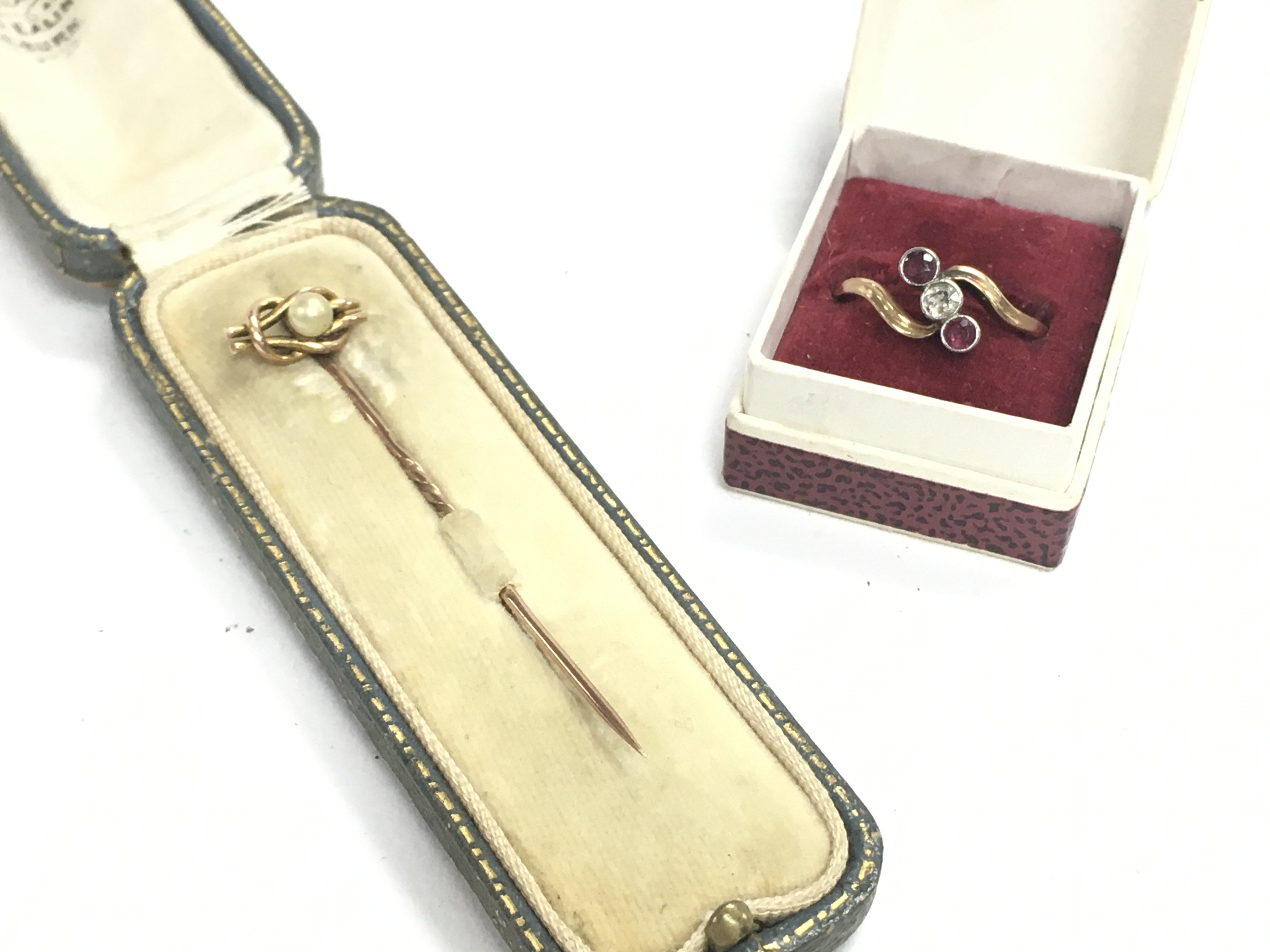 A gold ring (size N) and a 9ct gold tie pearl pin. Postage category A
