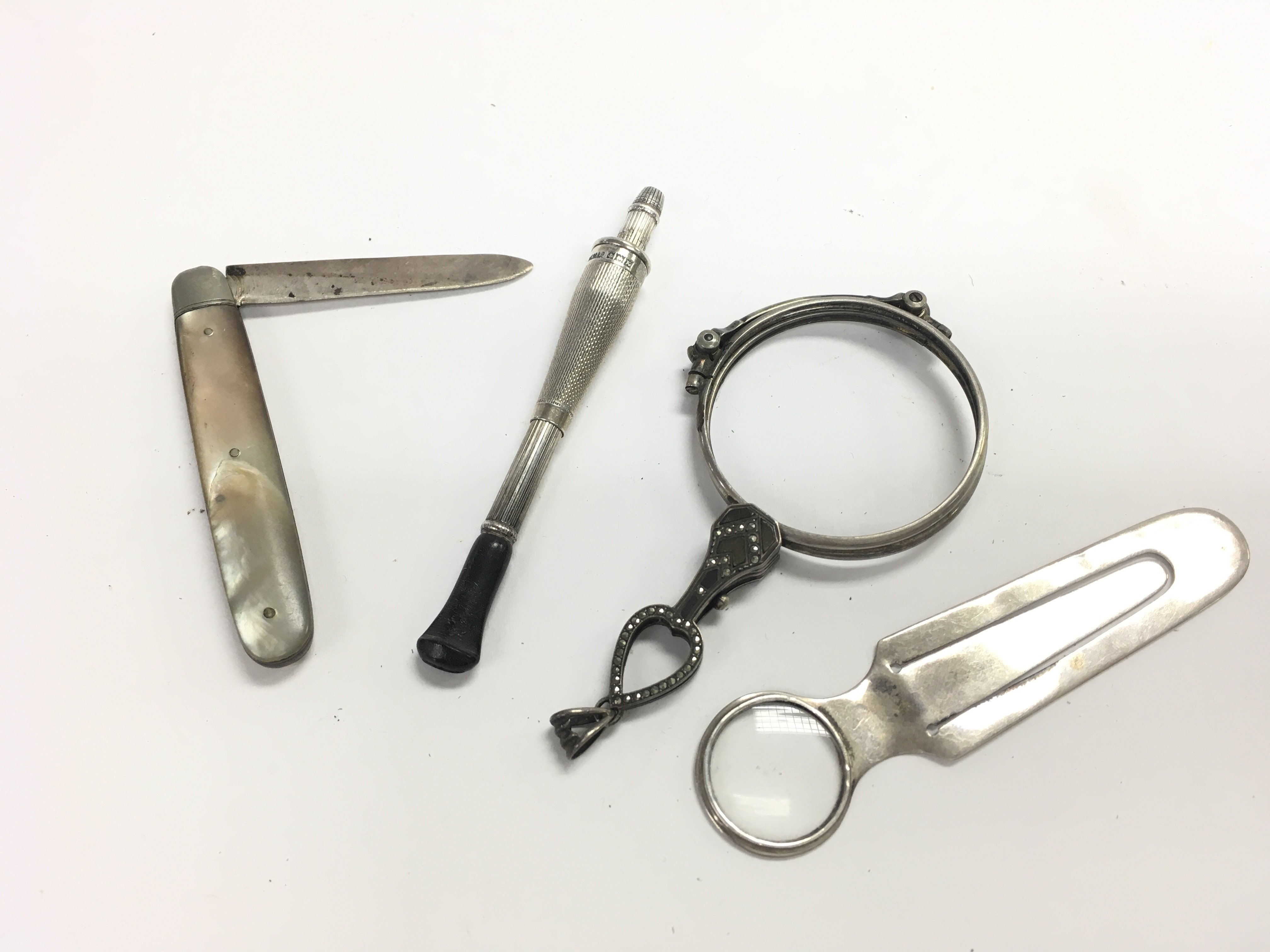 A silver hallmarked pen knife, silver book mark, silver lorgnettes and a silver cigarette holder. Postage category A
