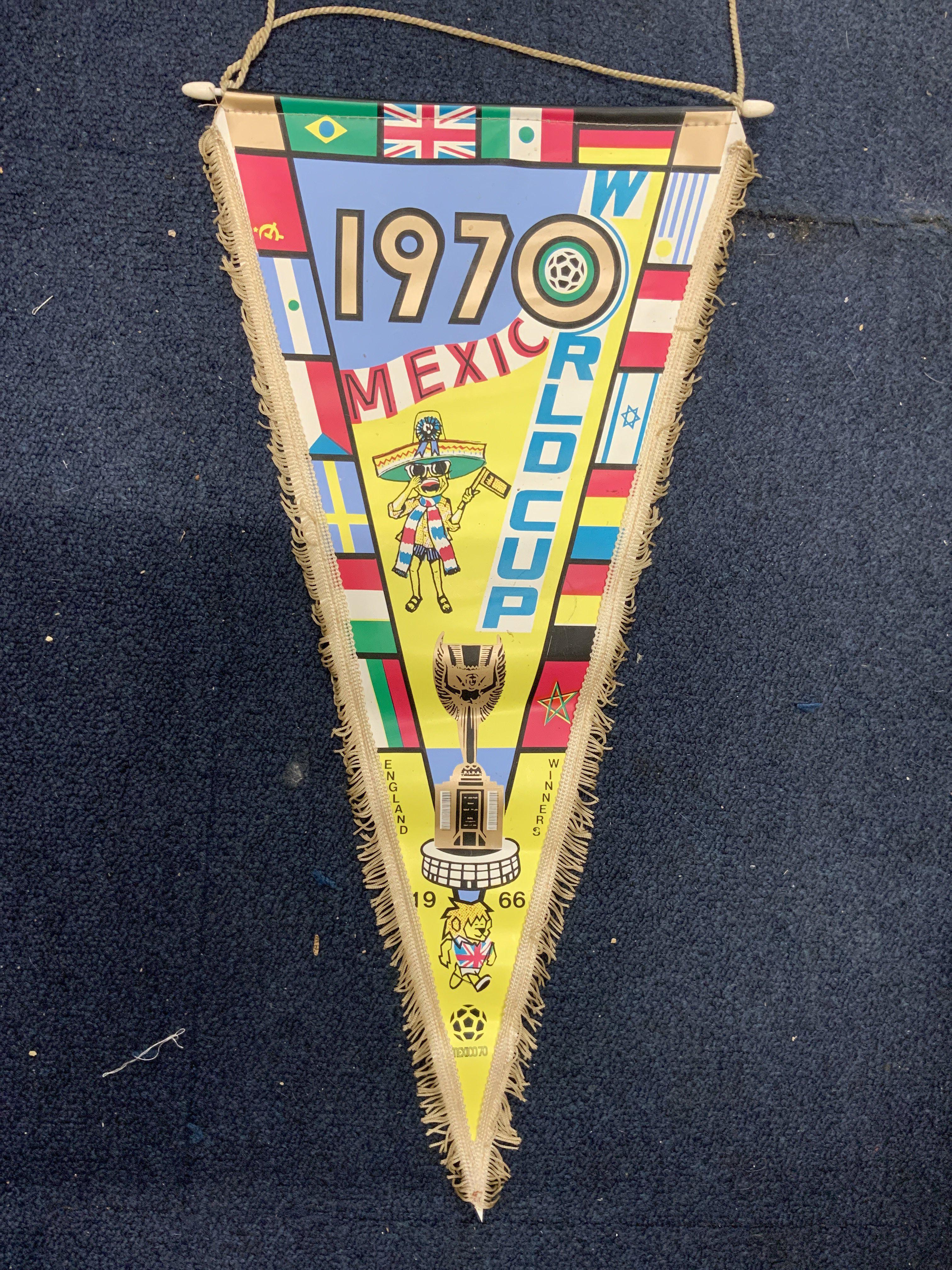 Mexico 1970 World Cup Large Football Pennant: 50cm long colourful original pennant with England winners 1966 and World Cup Willie at the bottom. Flags of participating nations to edge.