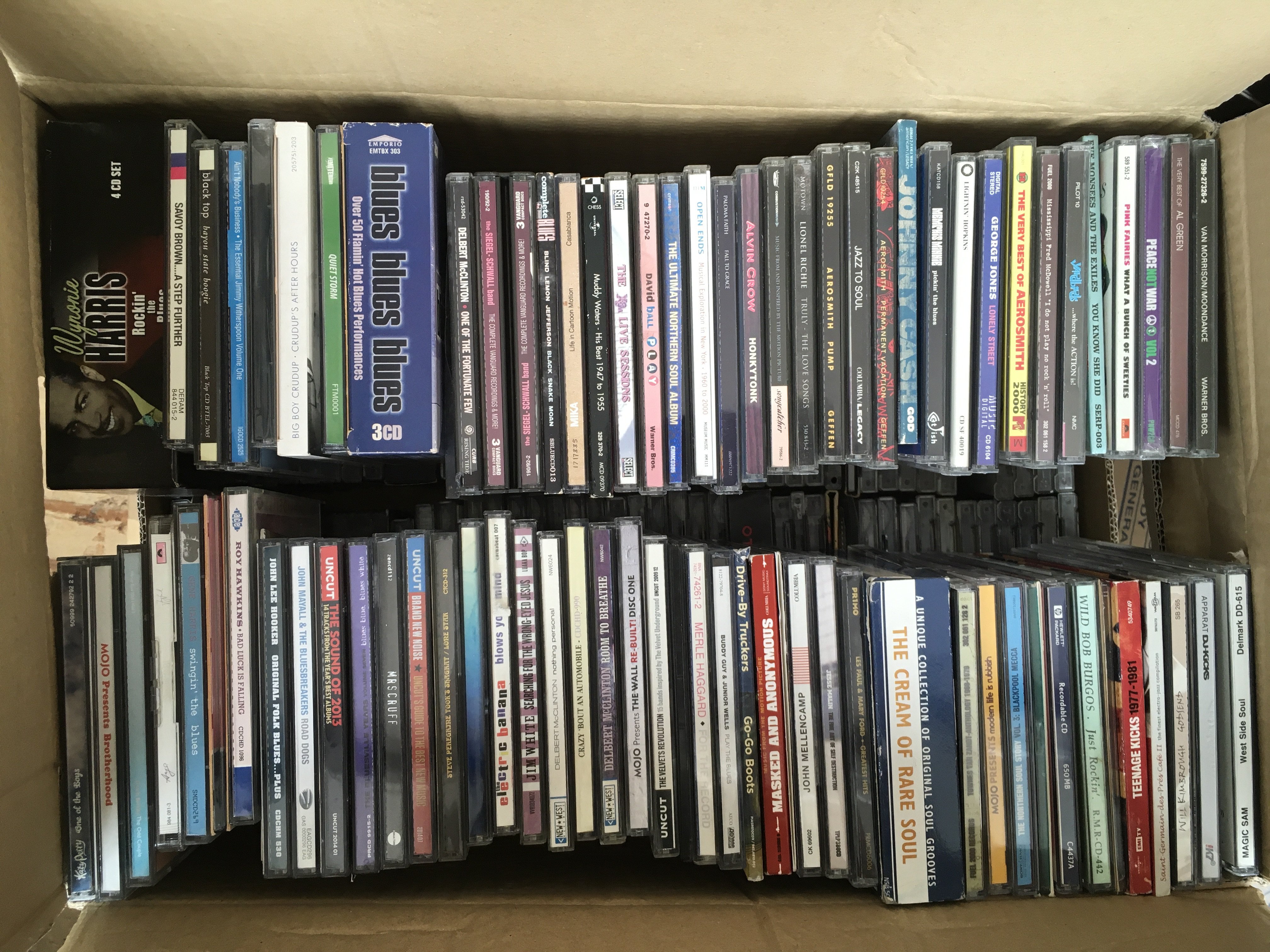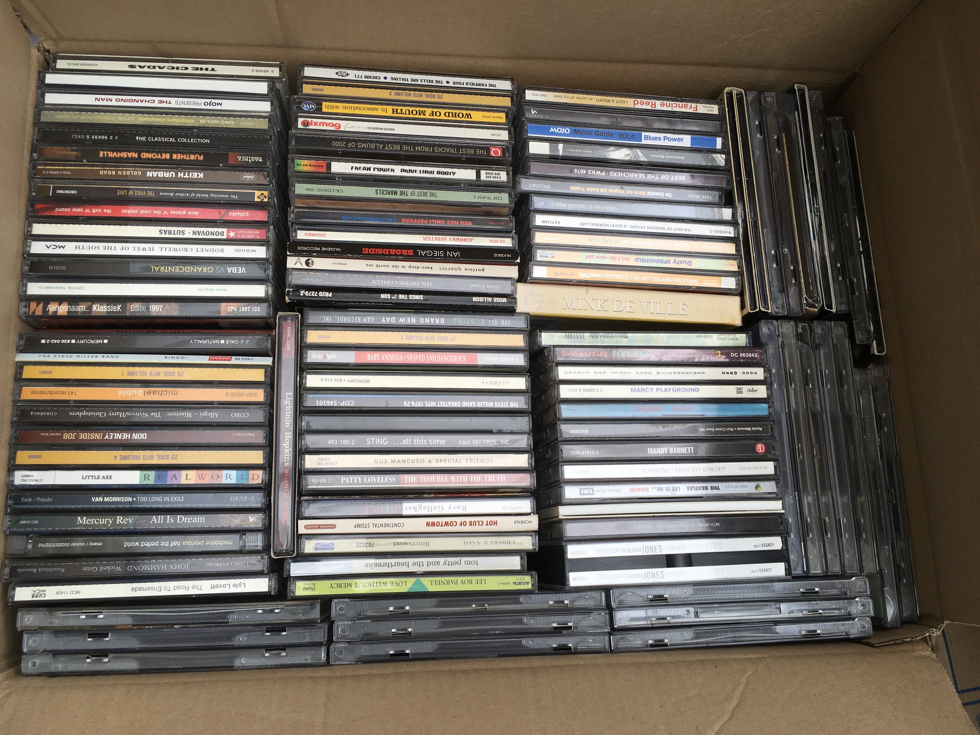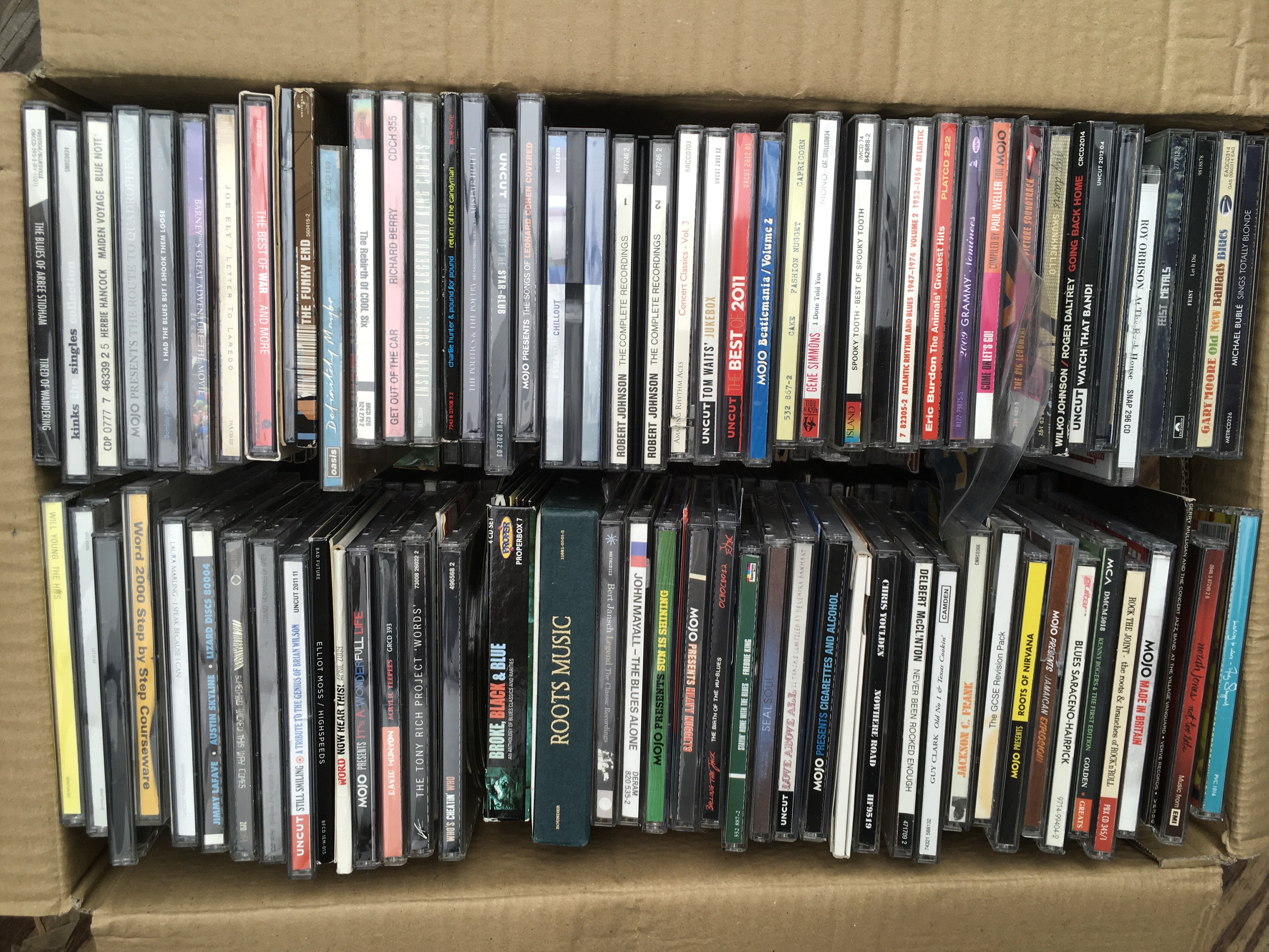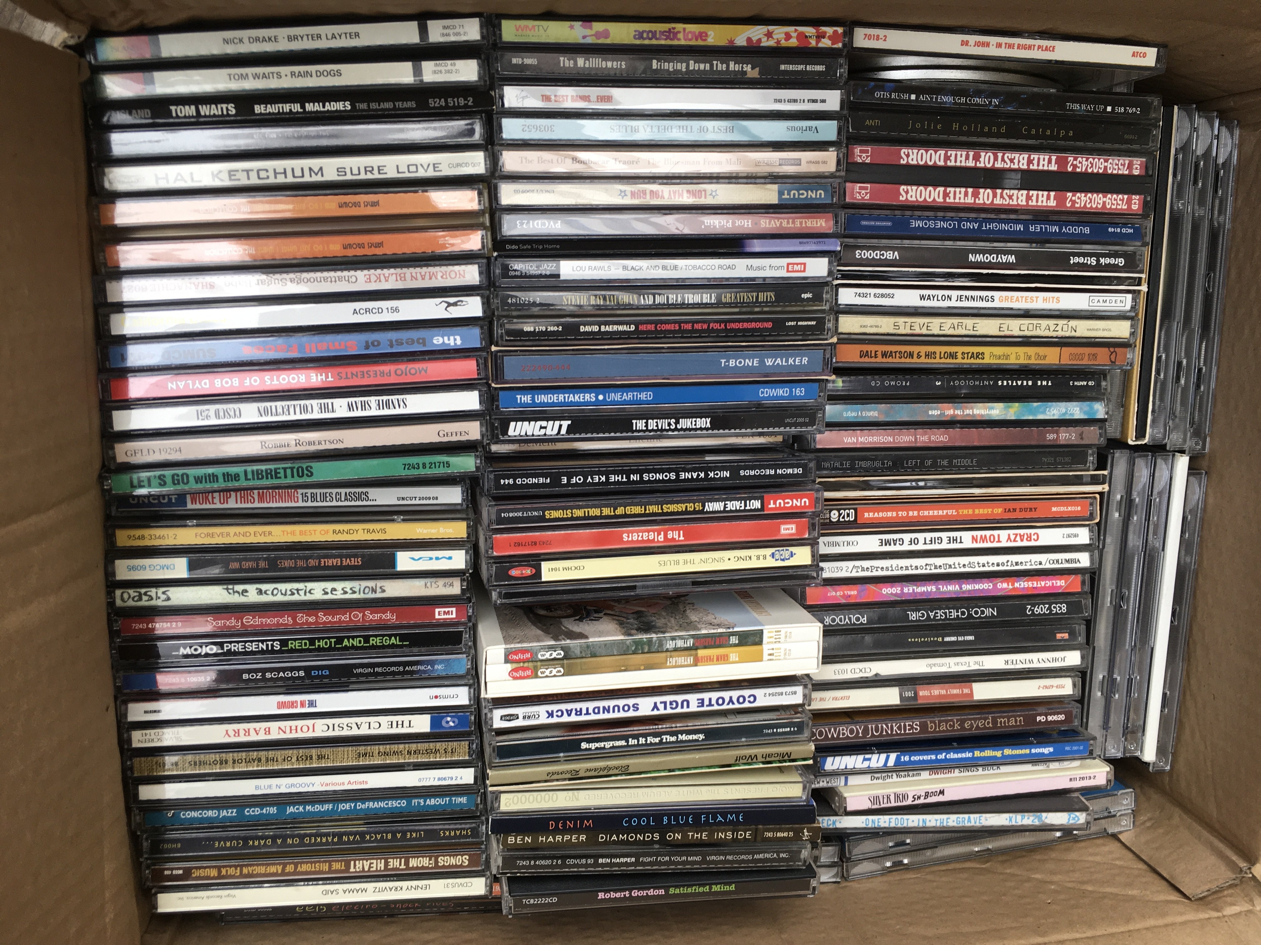 Eight boxes of CDs by various artists including Nick Drake, Tom Waits, Small Faces, Dr John and many more.