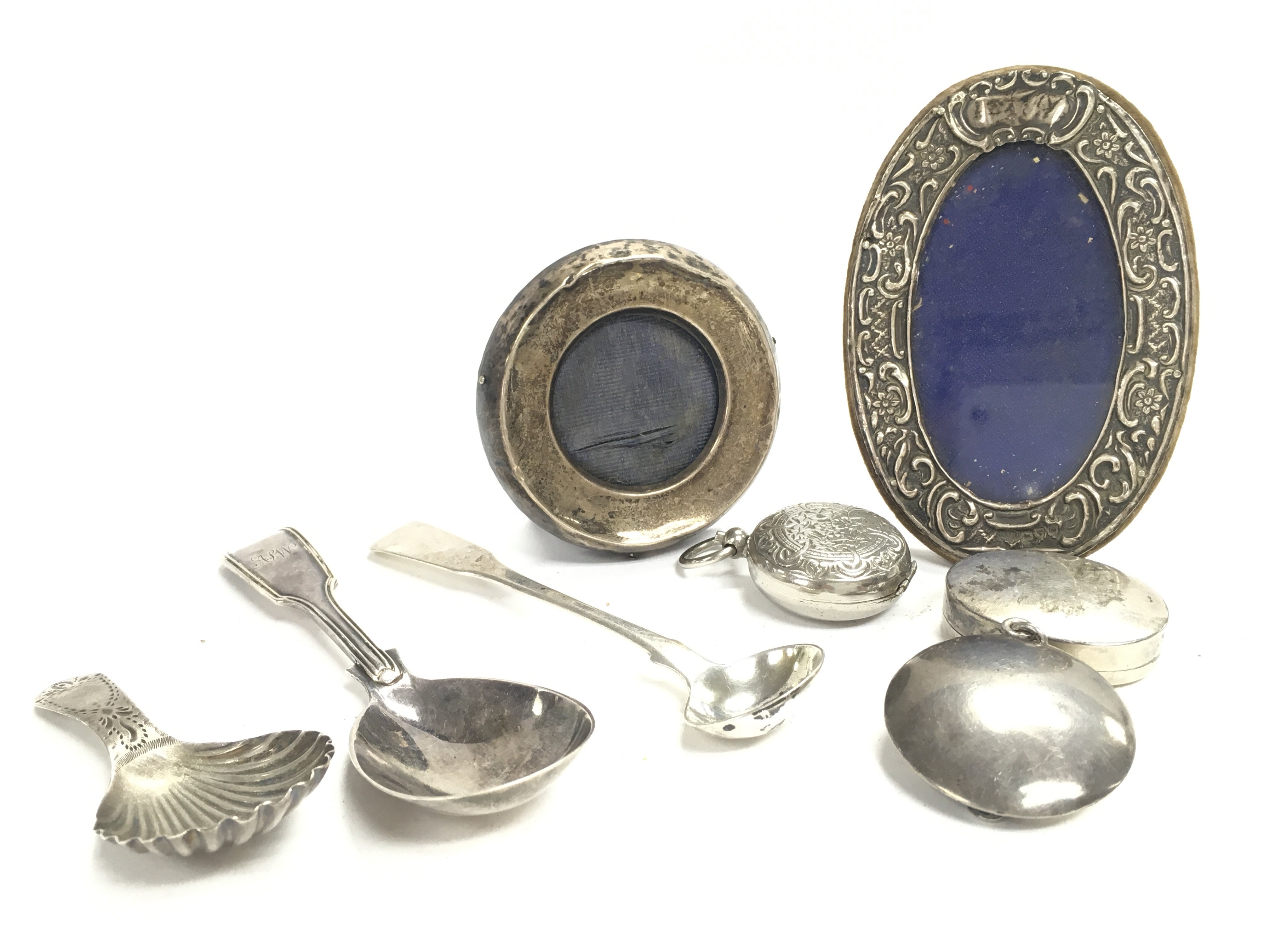 A Collection of hallmarked silver items including spoons, containers and photo frames. this lot cannot be posted