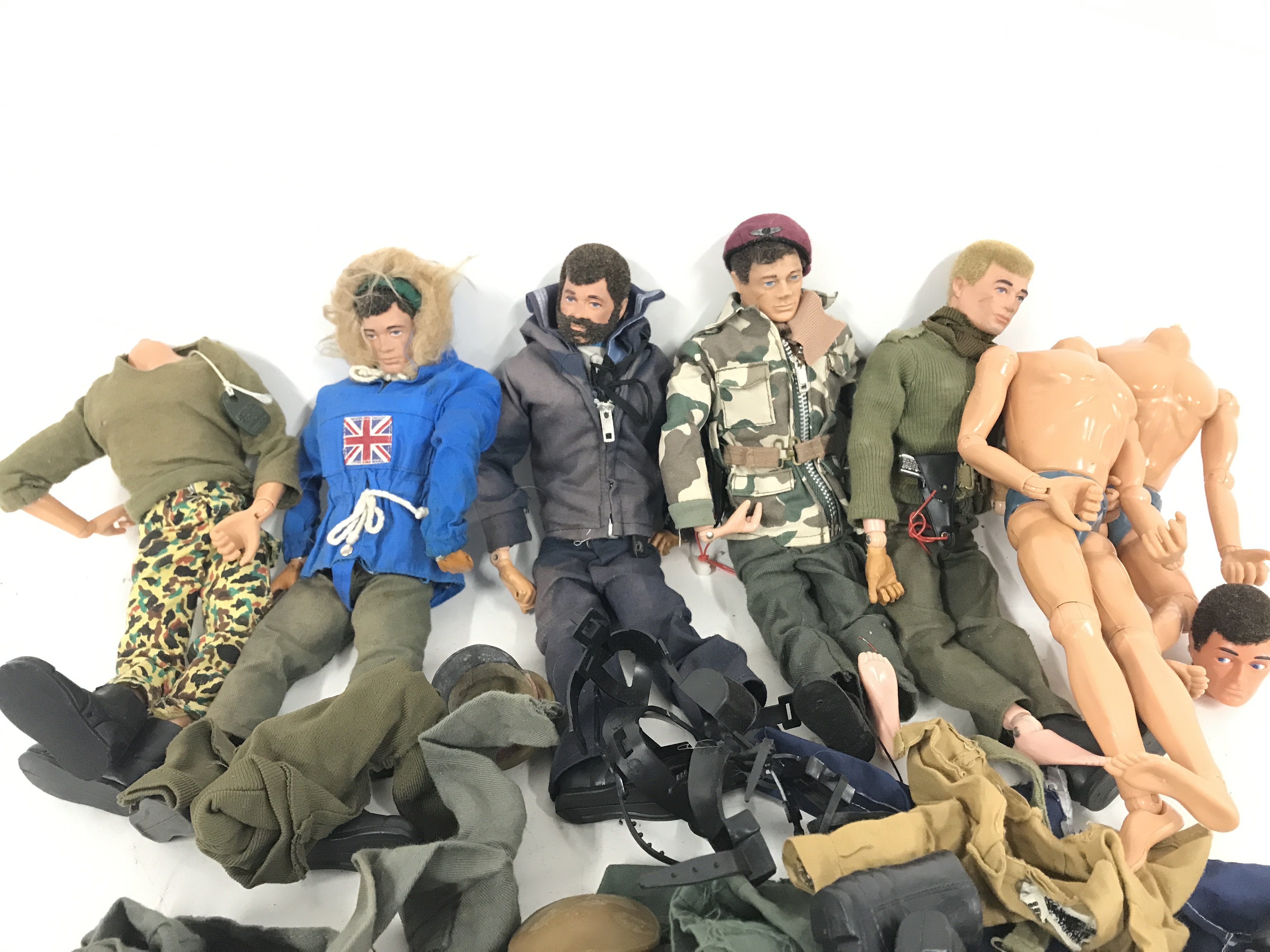 A Collection of Vintage Playworn Action Men with some uniform. No Reserve.