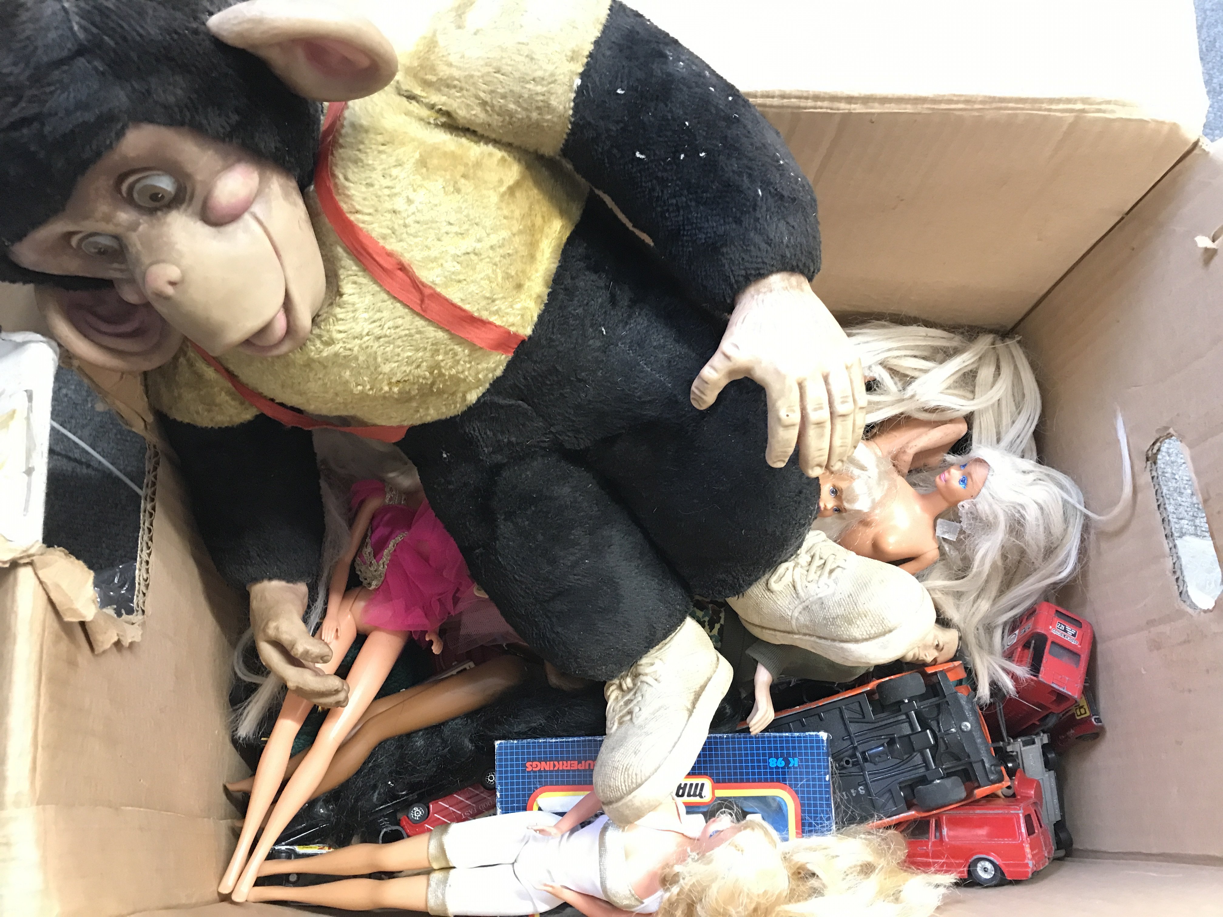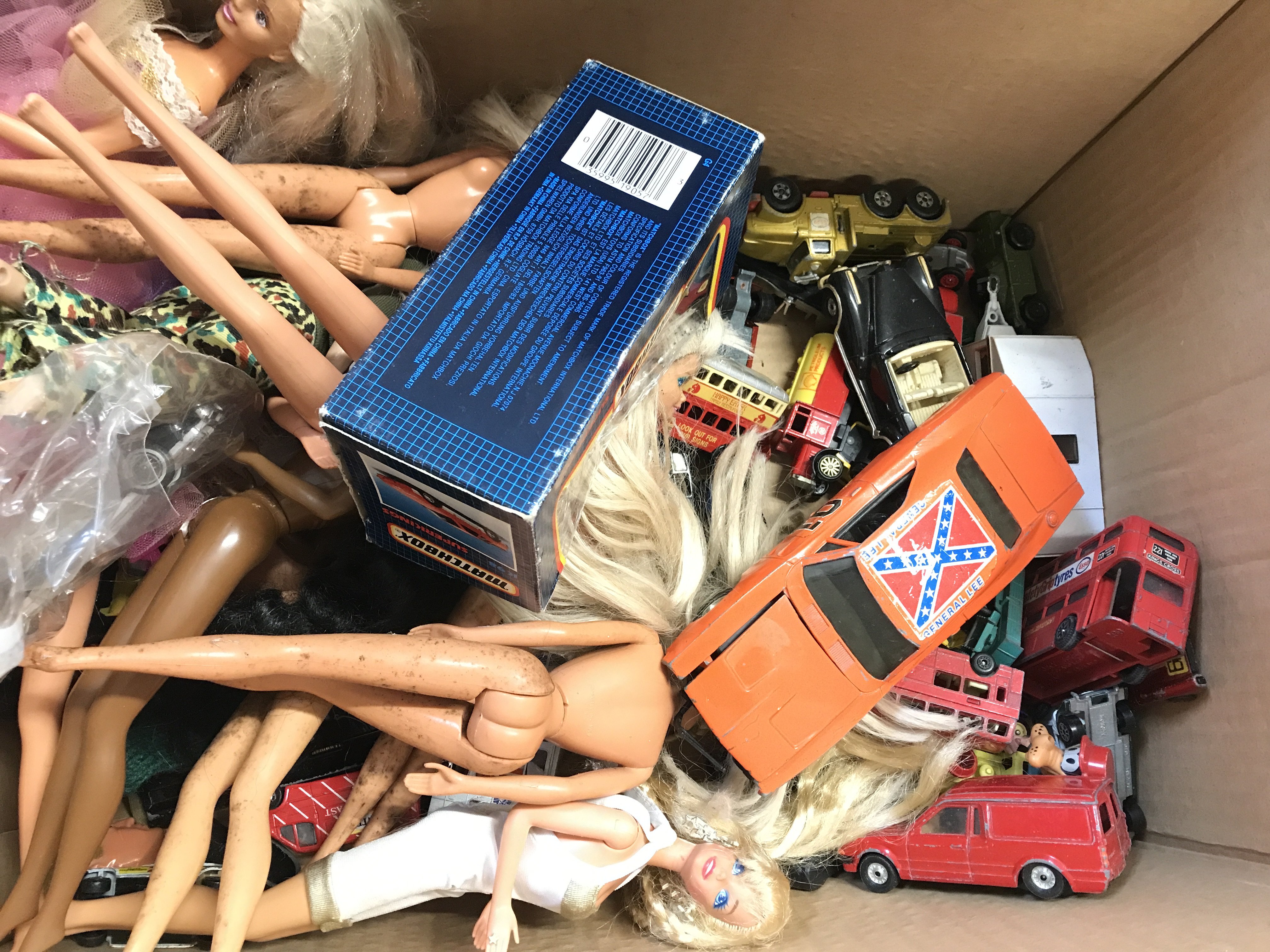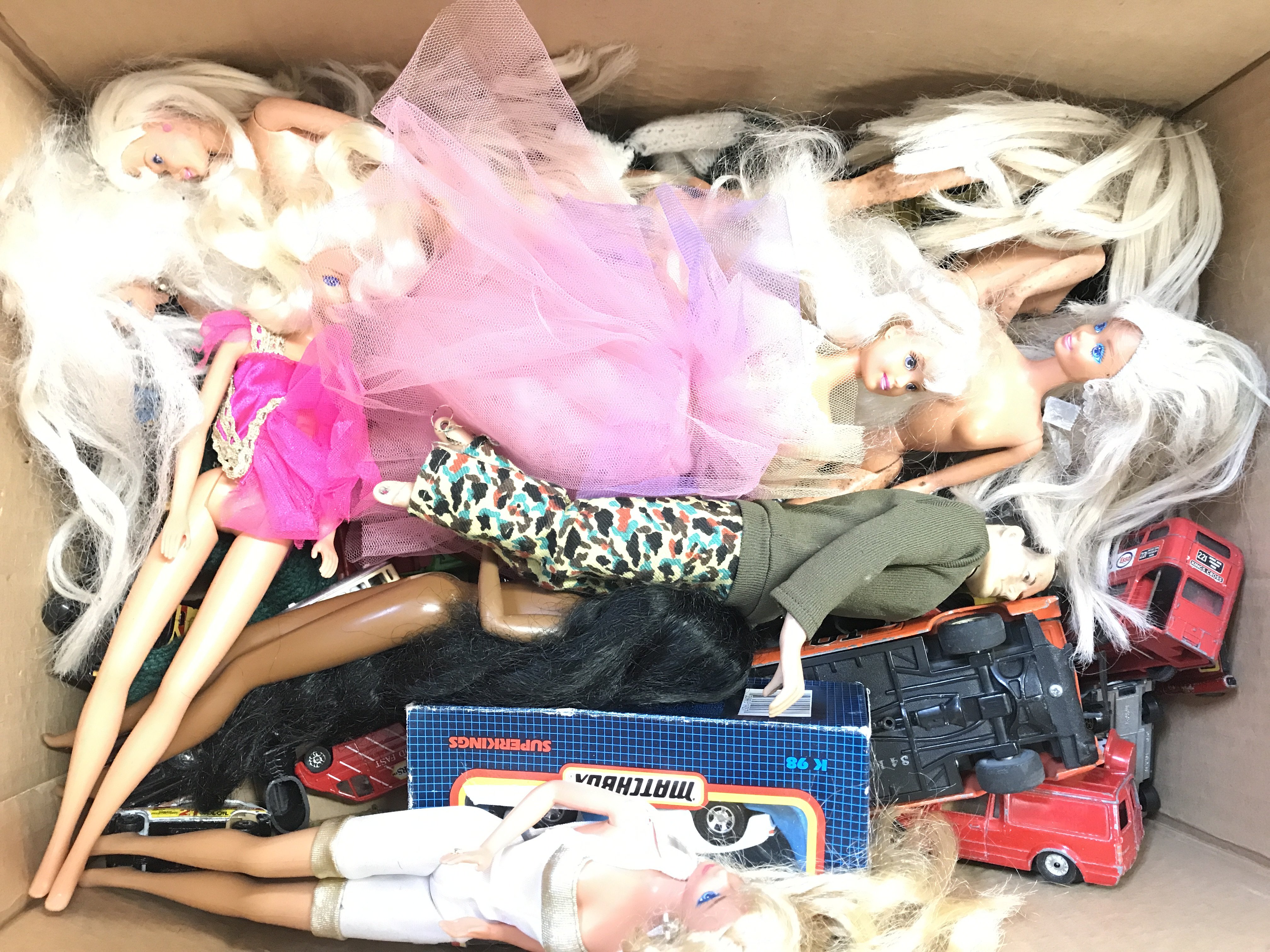 A Box Containing Playworn Dolls And Diecast. No Reserve.