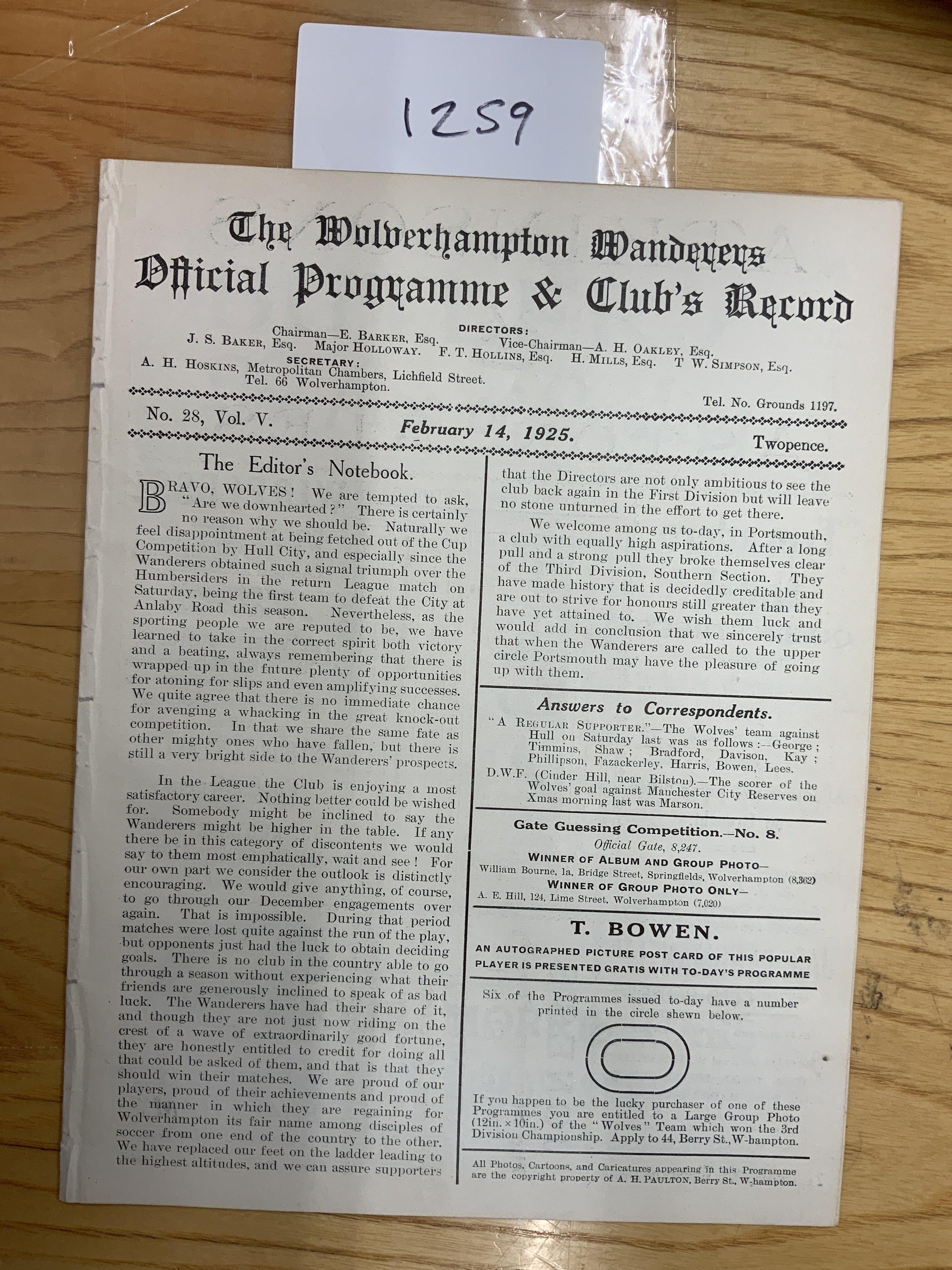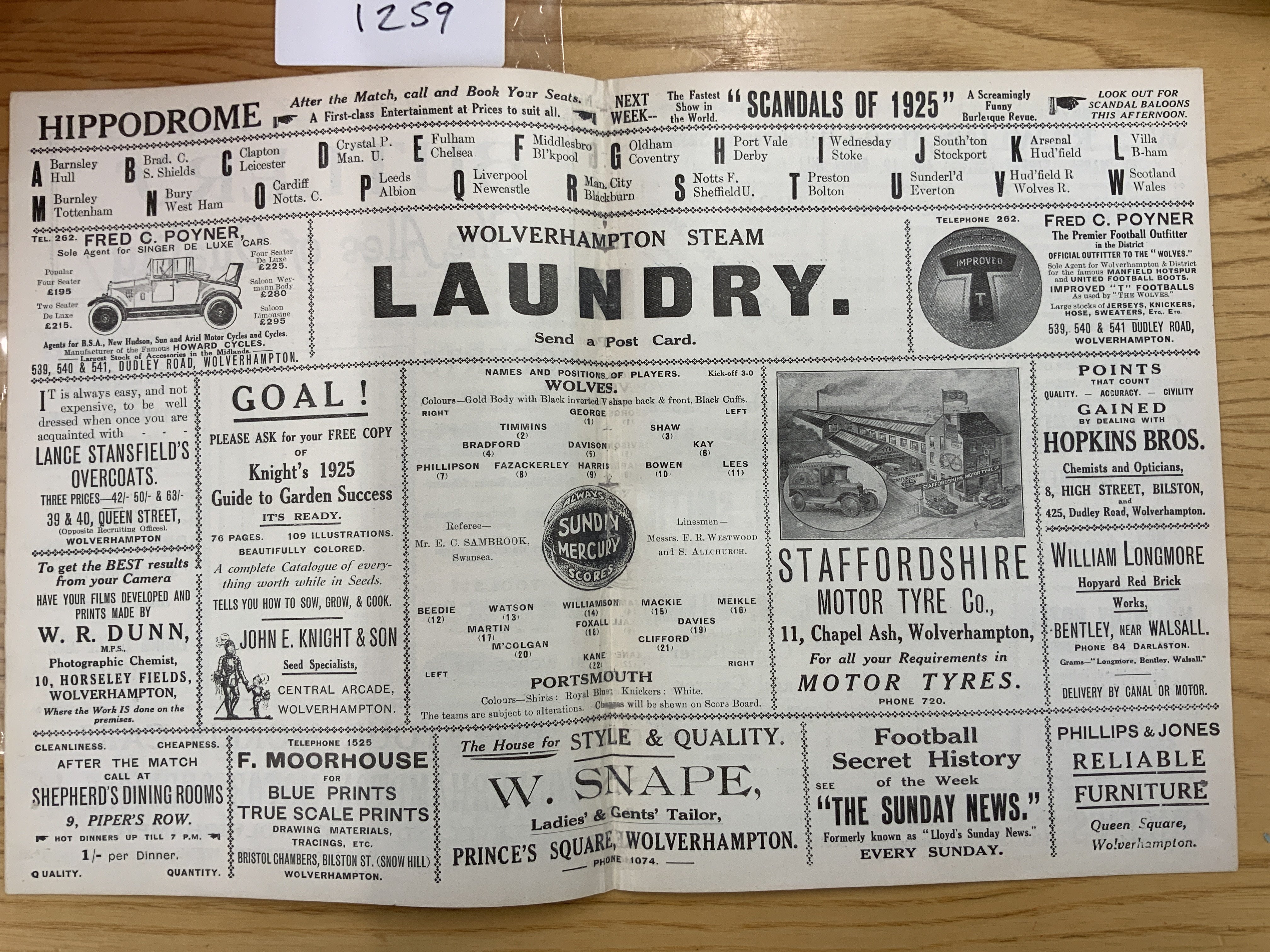 1924 - 1925 Wolves v Portsmouth Football Programme: Ex bound 100 years old excellent condition first team division 2 match with no writing. Now an 8 pager due to covers being removed. Highest away win this season in the league.