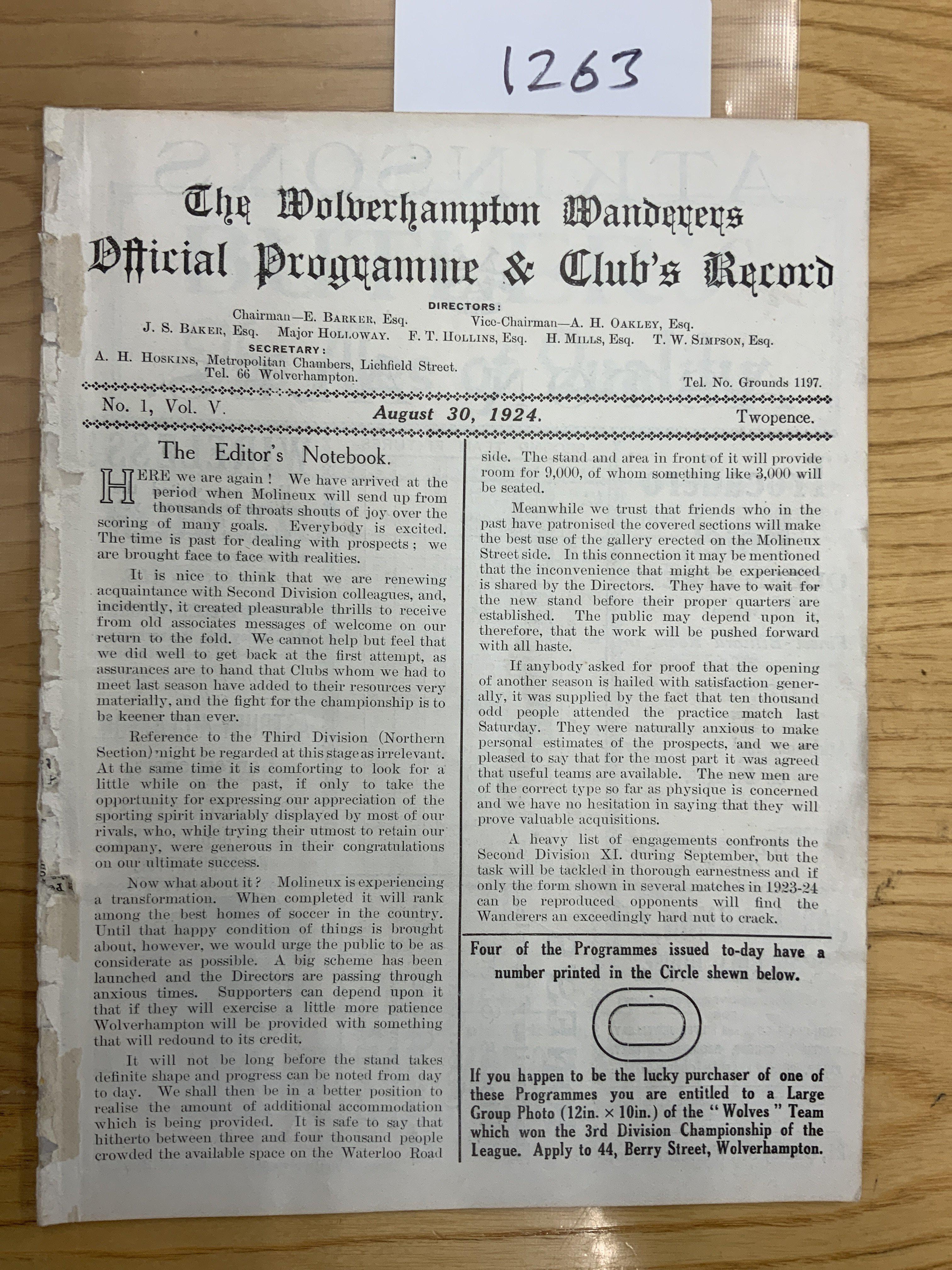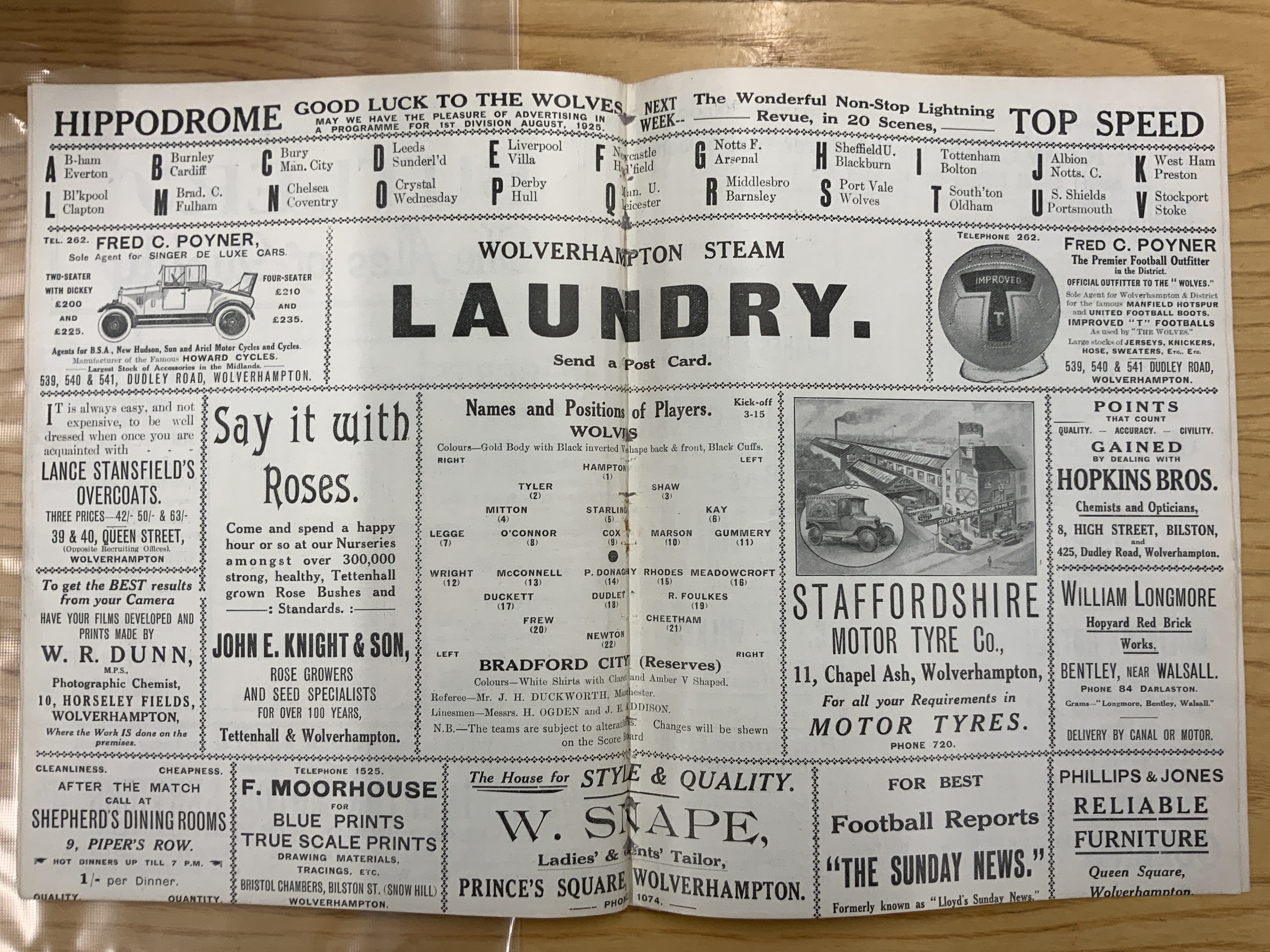 1924 - 1925 Wolves Reserves v Bradford City Central League Football Programme: Ex bound 100 years old excellent condition programme with no writing. Now an 8 pager due to covers being removed.
