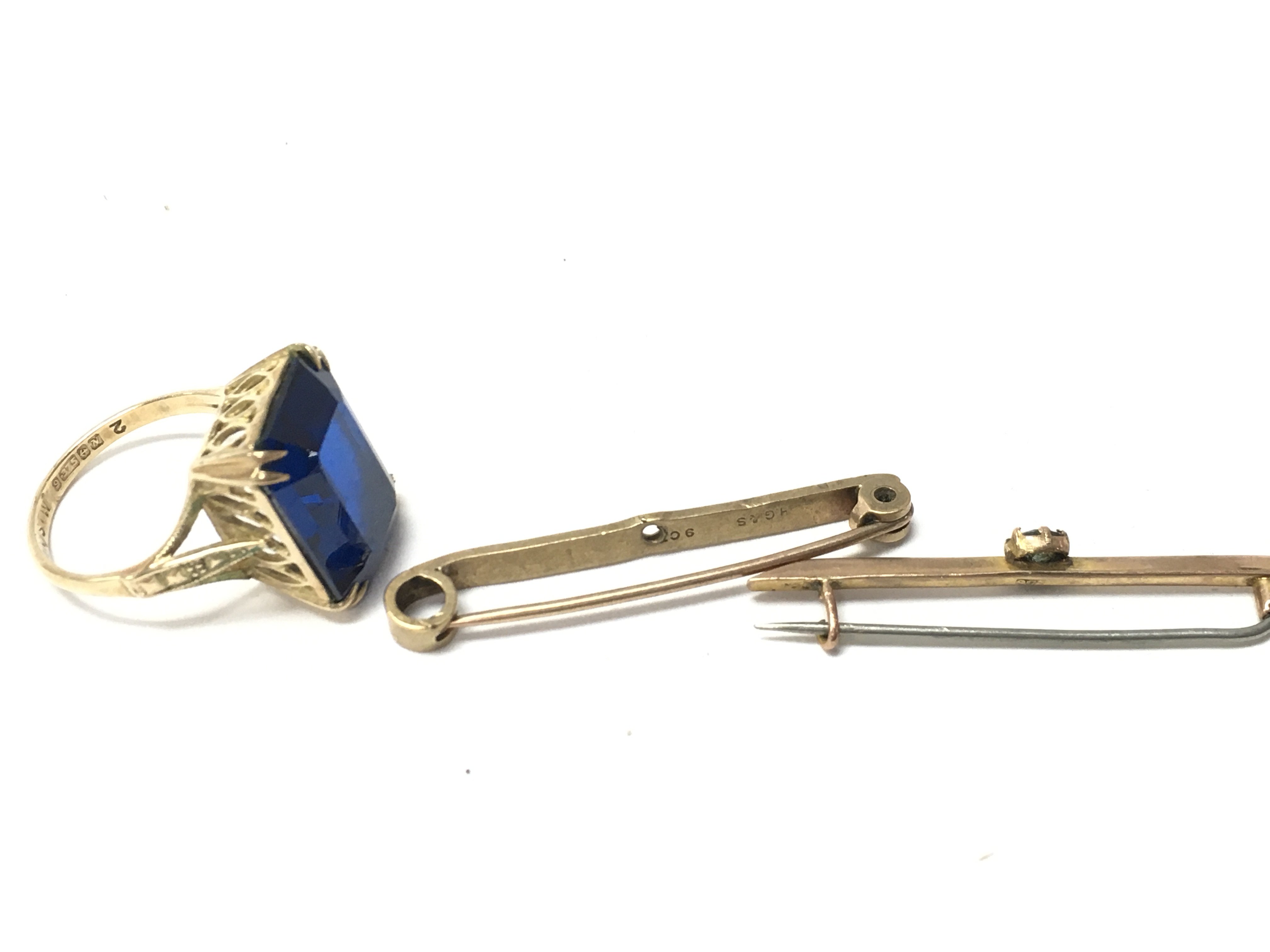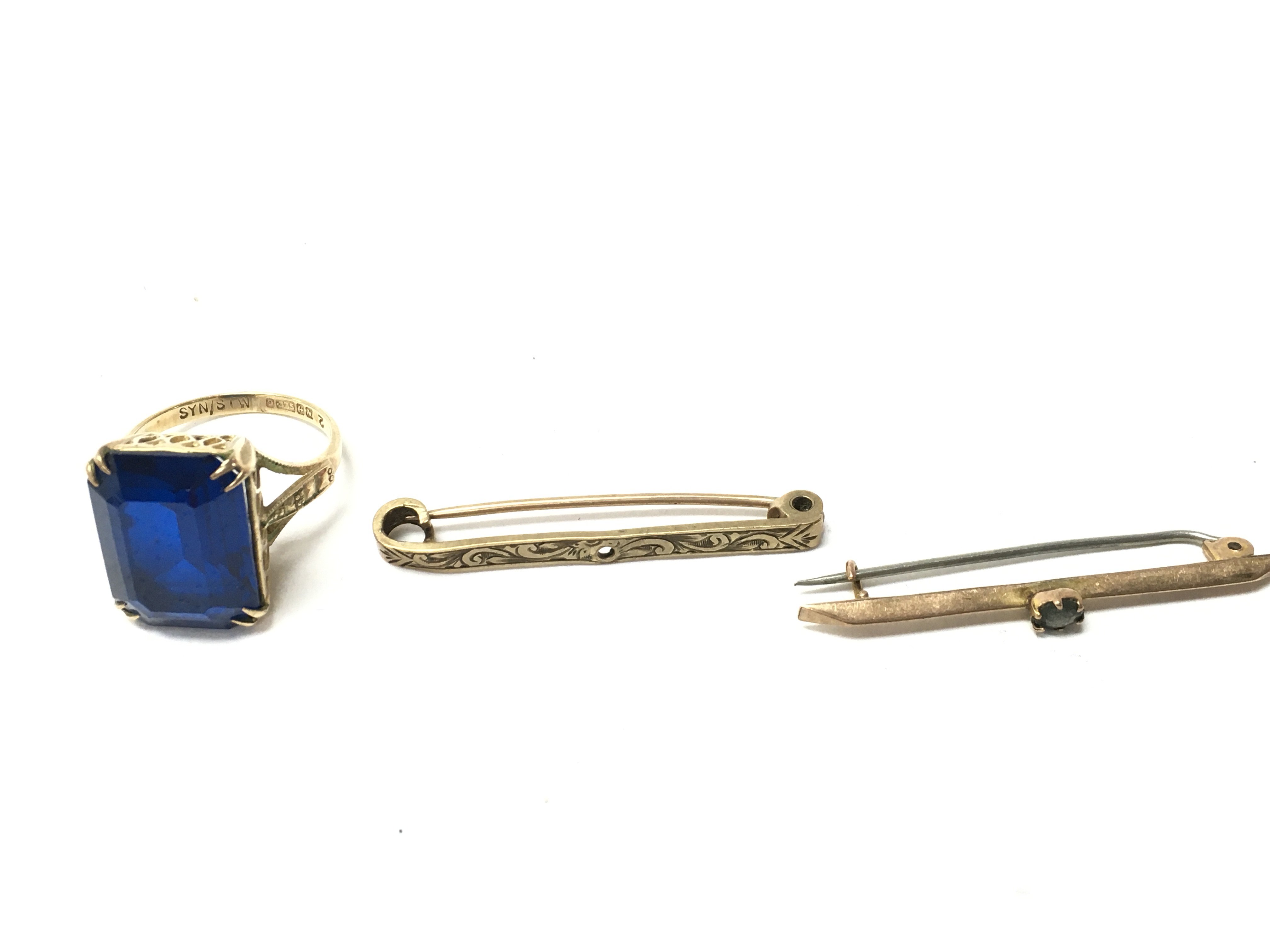 A 9ct gold ring set with blue stone and two 9ct gold brooches. 7.97g total. Postage B
