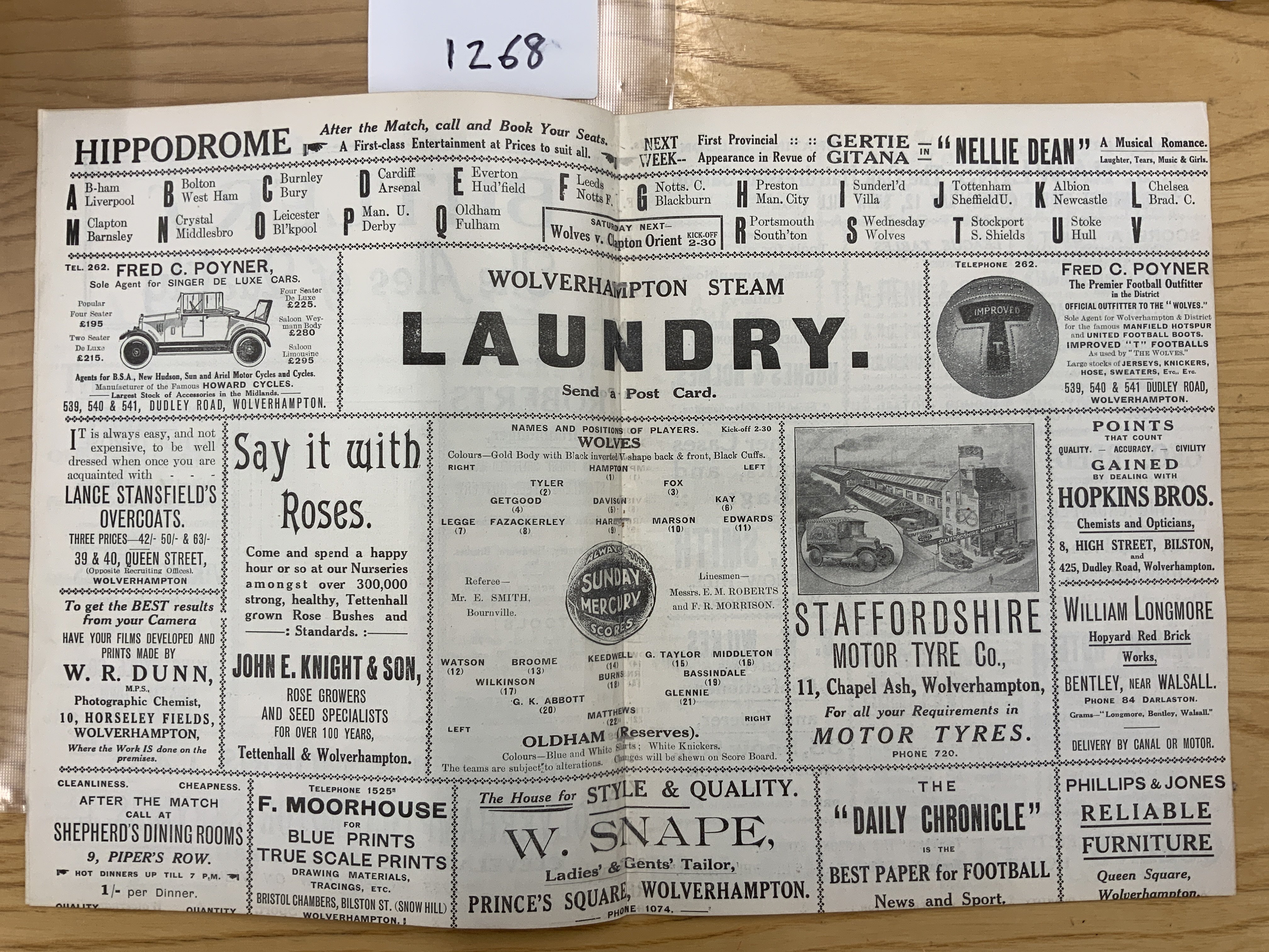 1924 - 1925 Wolves Reserves v Oldham Central League Football Programme: Ex bound 100 years old excellent condition programme with no writing. Now an 8 pager due to covers being removed.