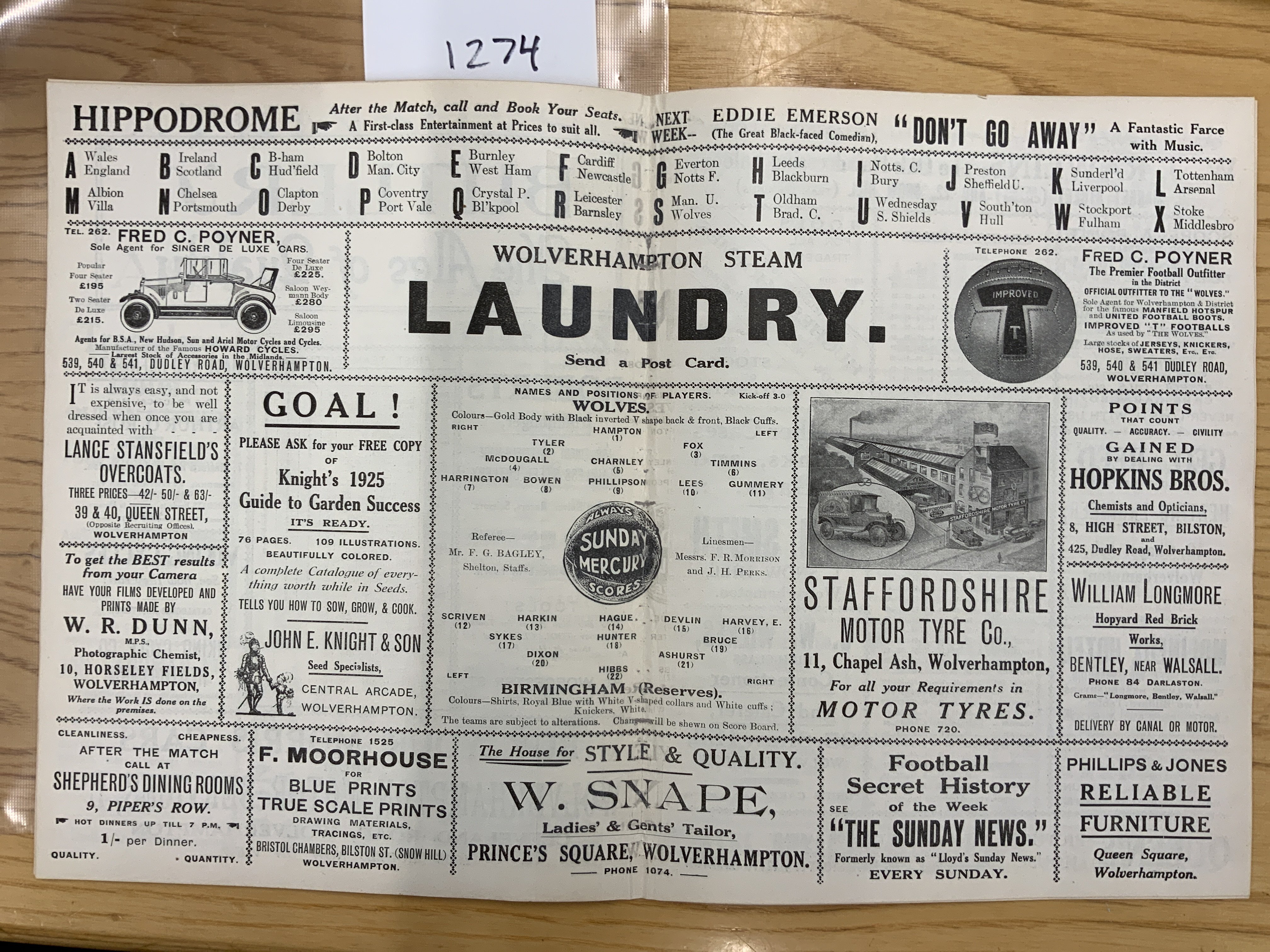 1924 - 1925 Wolves Reserves v Birmingham City Central League Football Programme: Ex bound 100 years old excellent condition programme with no writing. Now an 8 pager due to covers being removed.