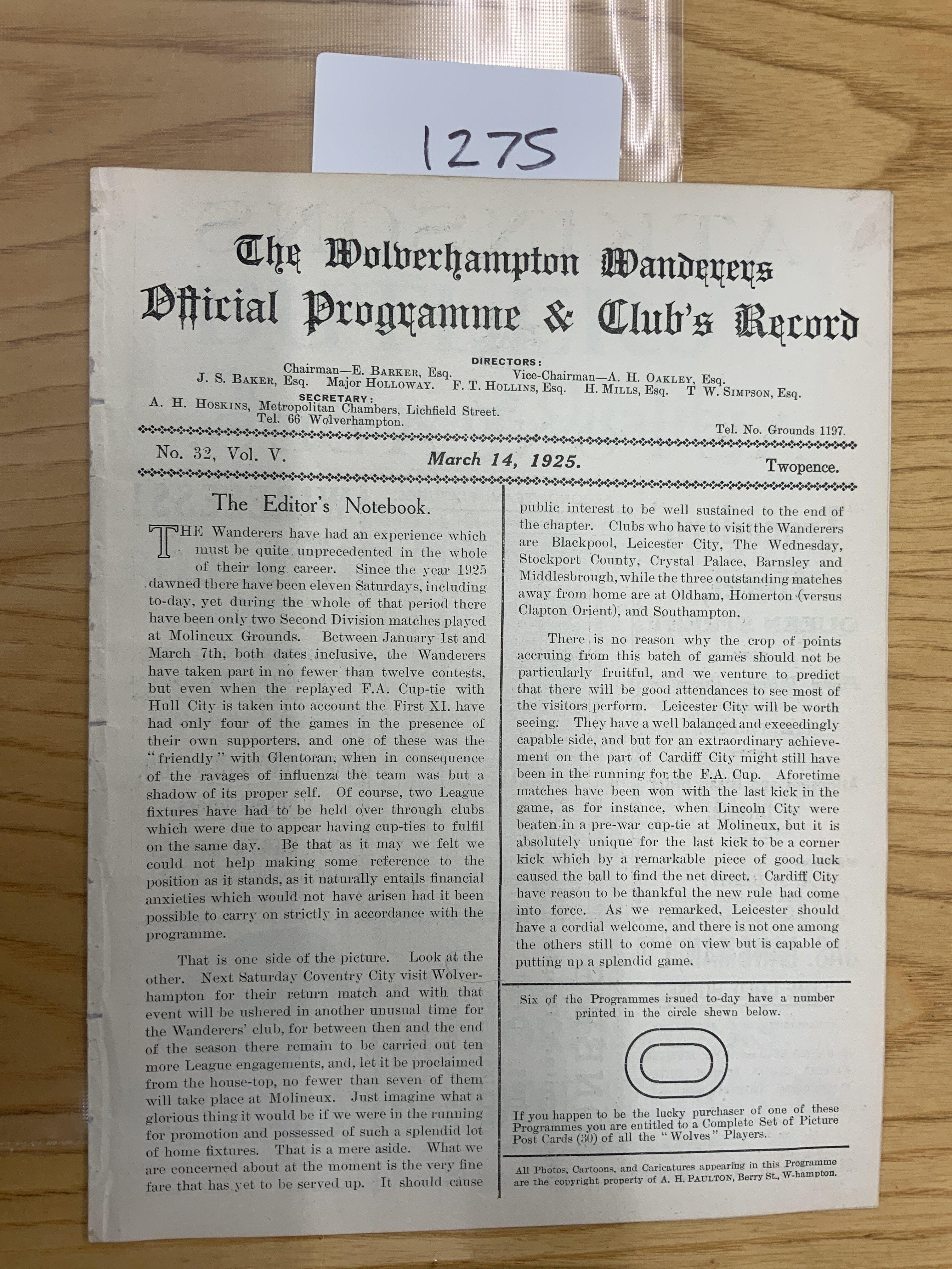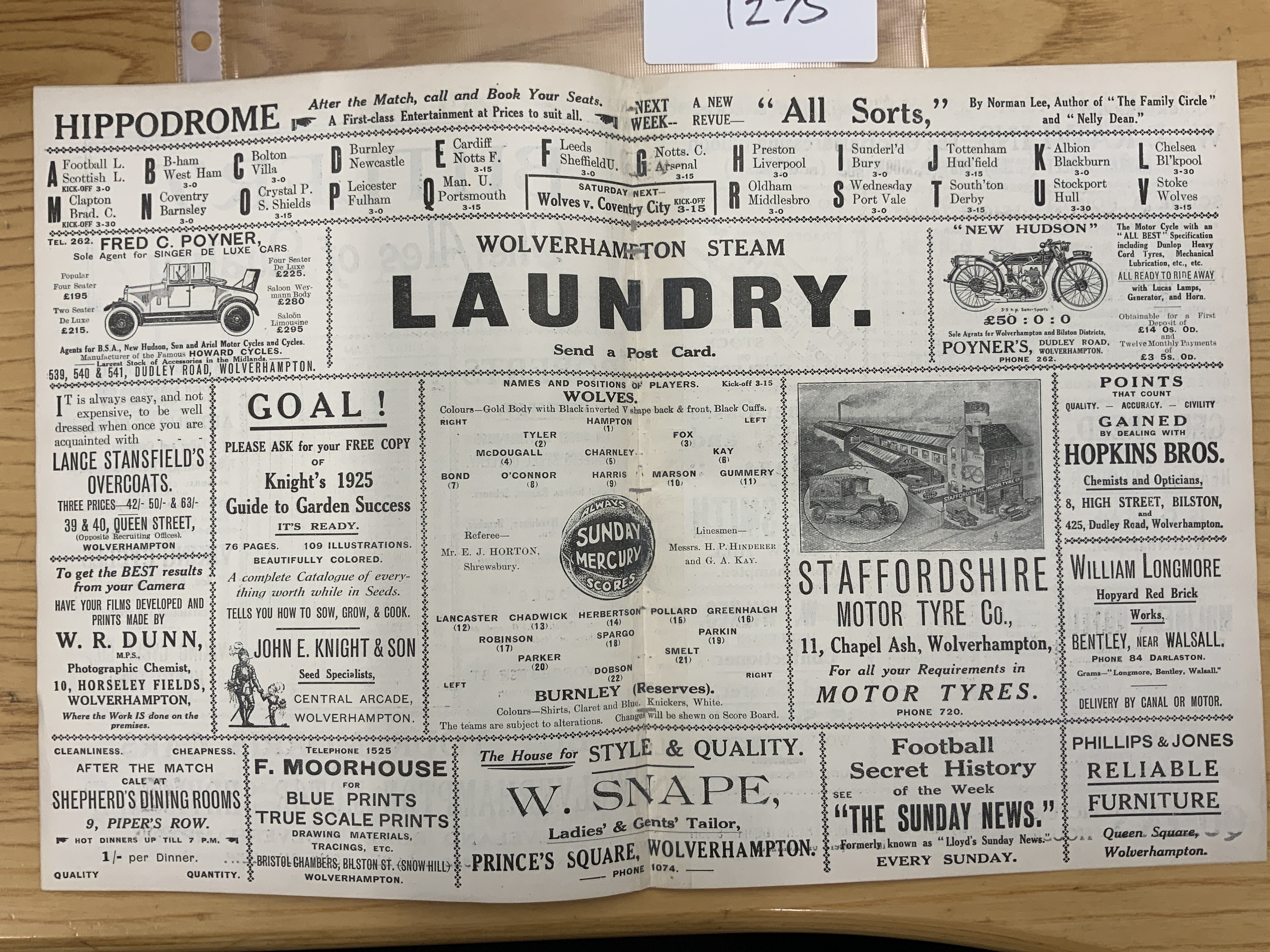 1924 - 1925 Wolves Reserves v Burnley Central League Football Programme: Ex bound 100 years old excellent condition programme with no writing. Now an 8 pager due to covers being removed.