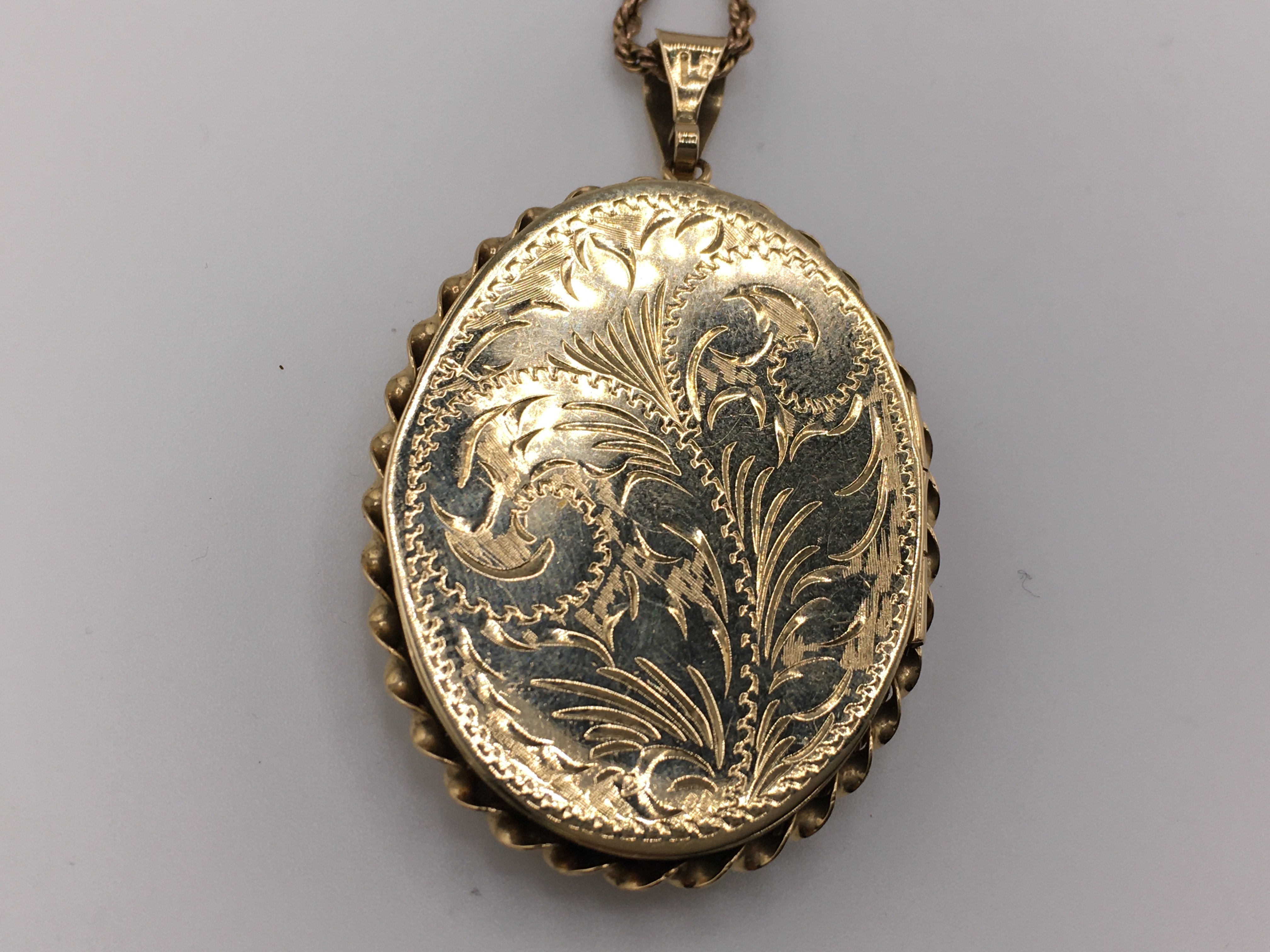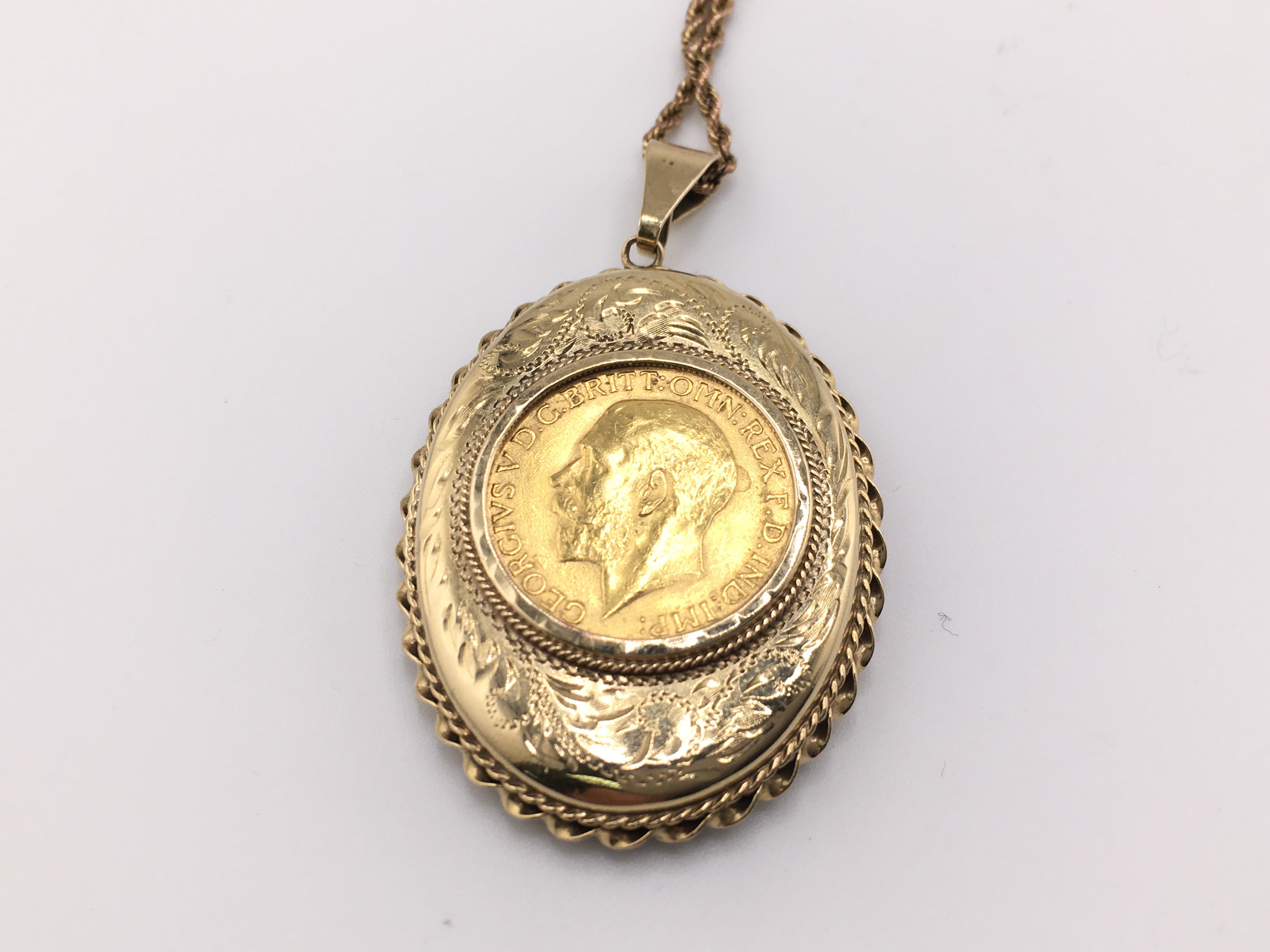 A 1918 full sovereign set in a 9ct locket on a 9ct chain. Total weight 24.95g Postage B