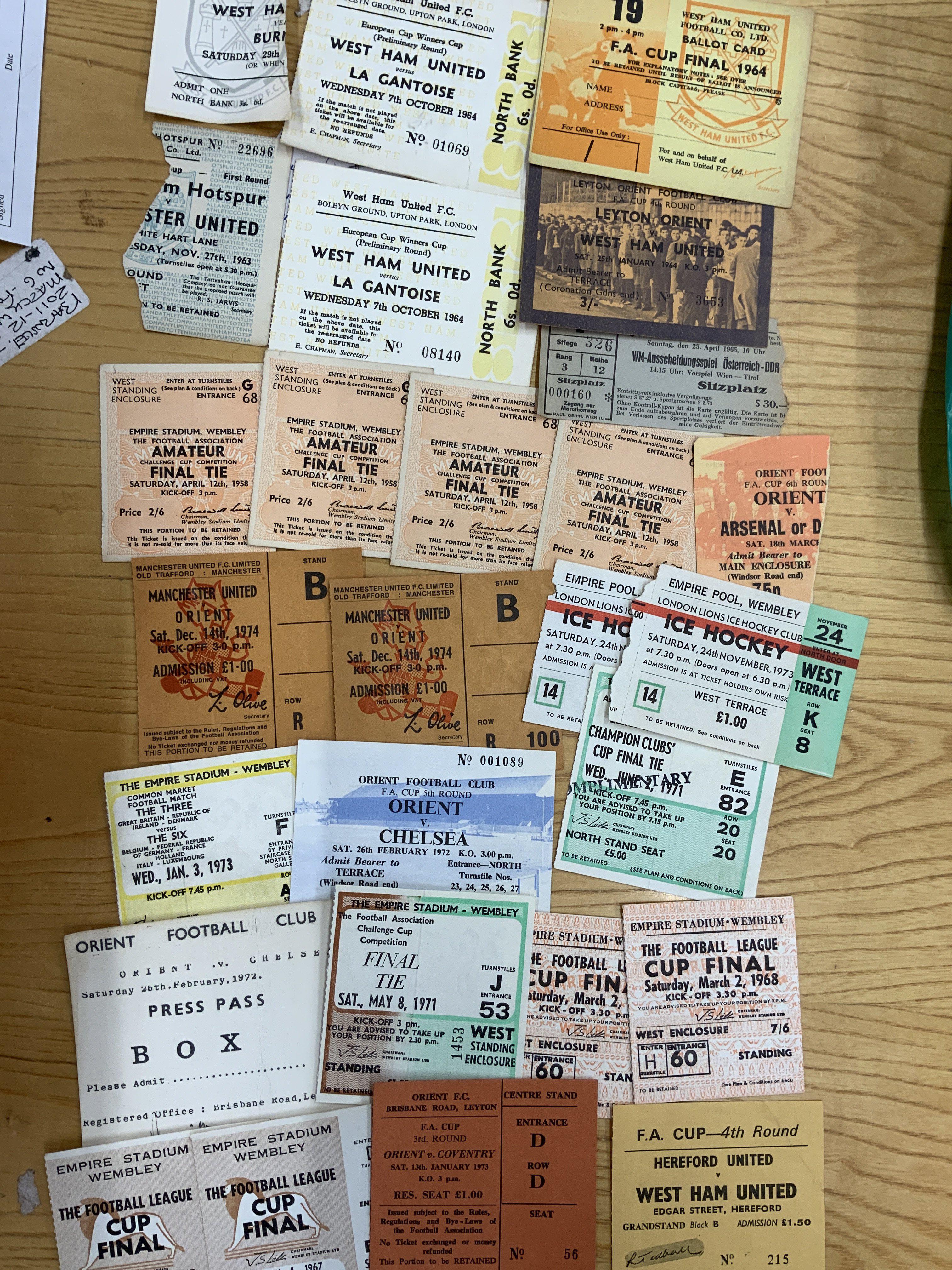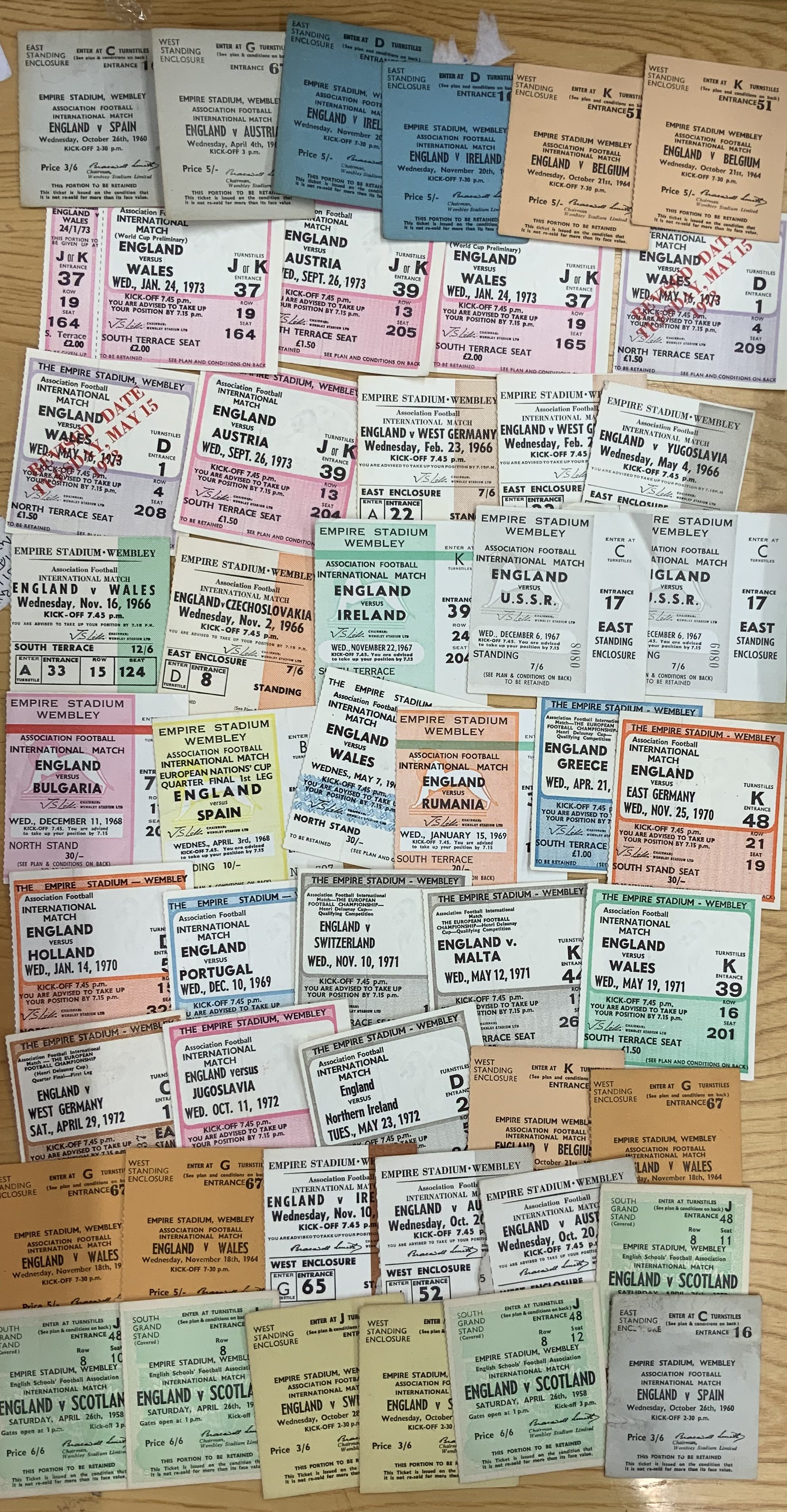 Football Ticket Collection: Must view lot of tickets brought in to a valuation day from the late 50s to the early 70s. Some rare finds including 74/75 Manchester United v Orient x 2, Early 70s Hereford v West Ham FA Cup, 71/72 Orient v Chelsea two versions including press box, 1965 Austria v East Germany, 64/65 West Ham v La Gantoise x 2, 63/64 Orient v West Ham FA Cup, 1971 European Cup Final plus Amateur Cup League Cup and FA Cup finals. C/W nearly 50 England home tickets in this period with duplication. (75)