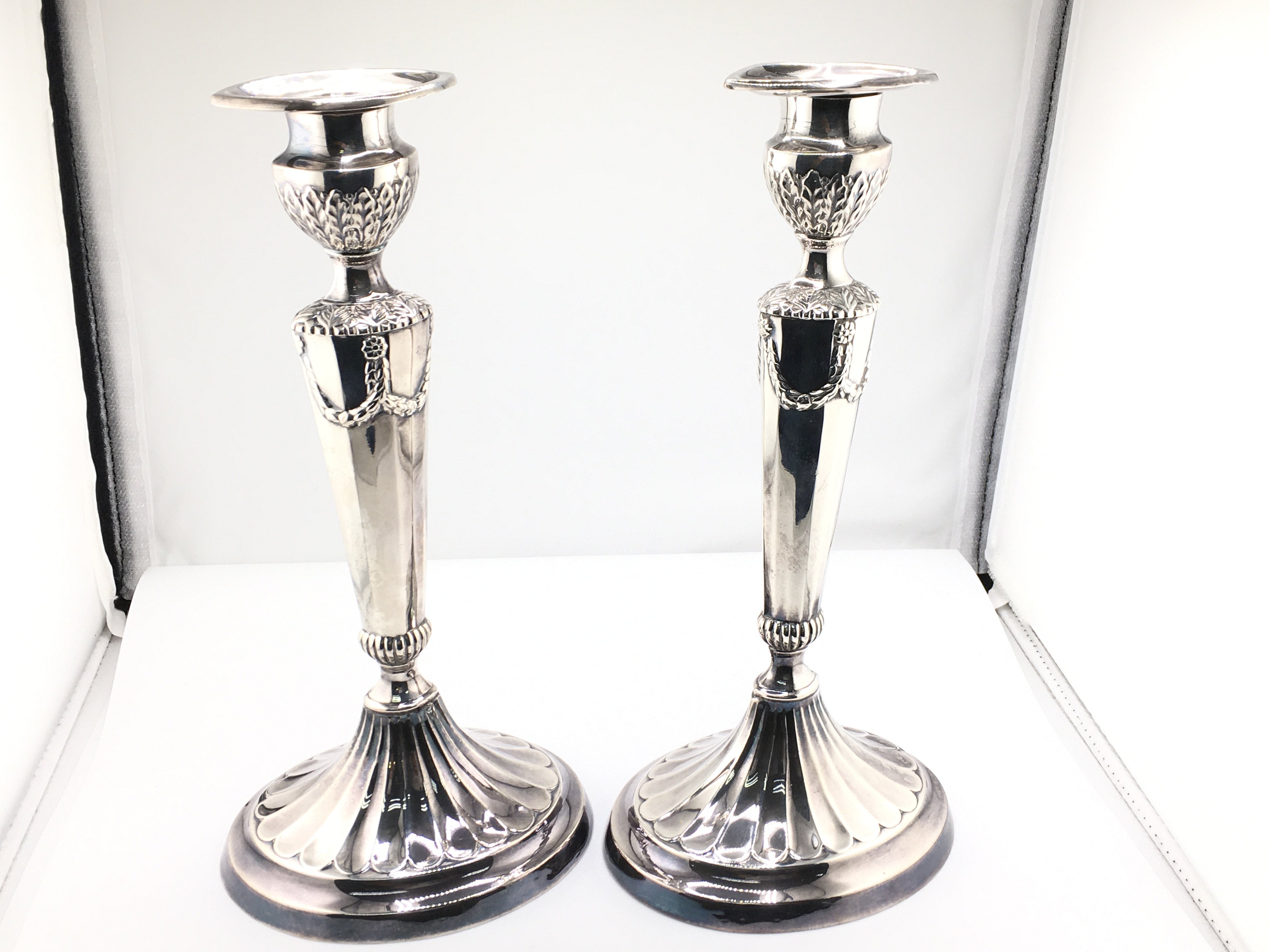 A pair of silver plate regency style candlestick holders. 25cm tall. Postage B