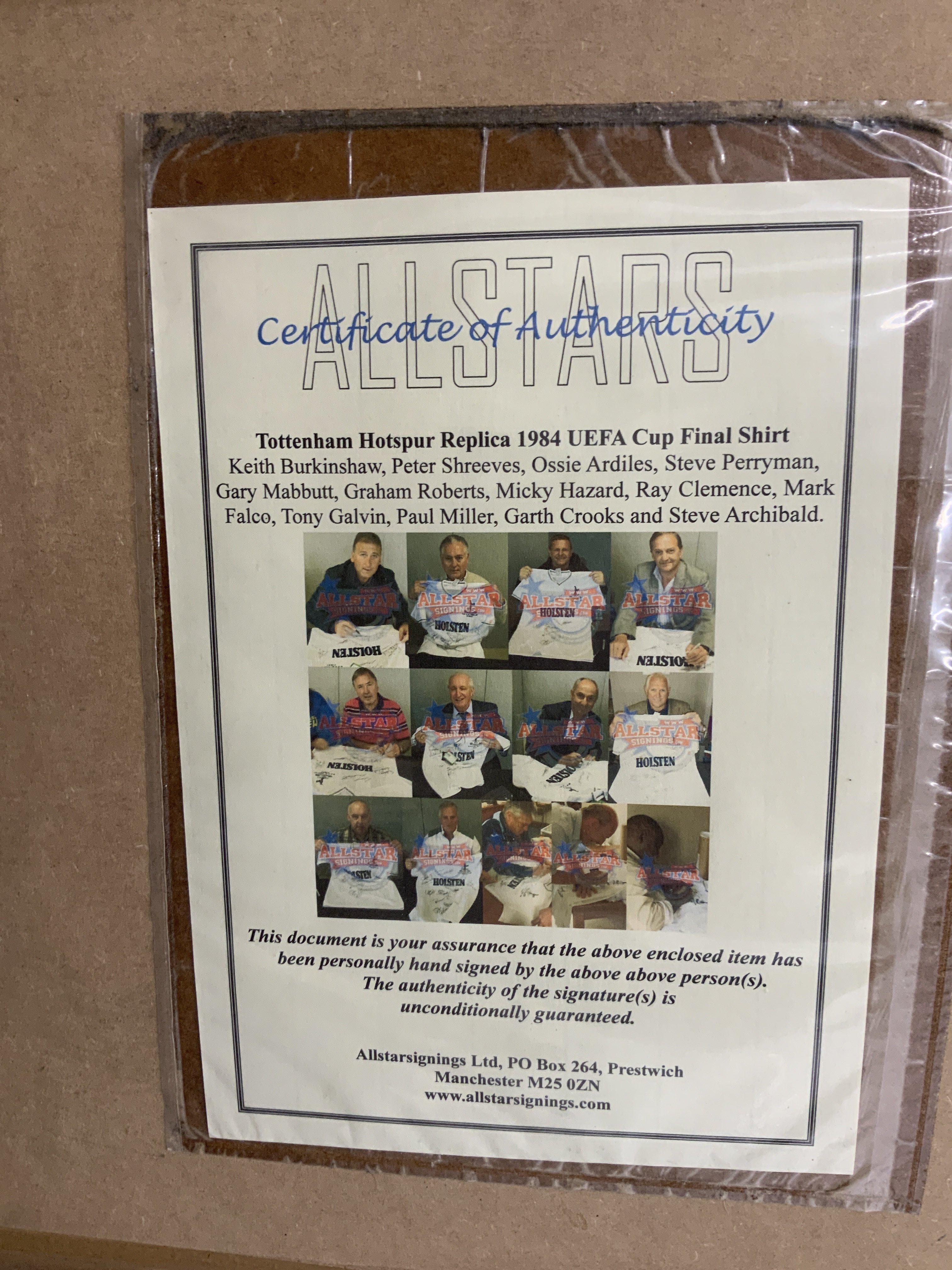Tottenham 1984 UEFA Cup Final Signed Framed Football Shirt: Replica white Holsten shirt with UEFA 1983-84 Final embroidered to breast. Signed clearly to front by Burkinshaw Shreeves Ardiles Perryman Mabbutt Roberts Hazard Clemence Falco Galvin Miller Crooks and Archibald. Photographic proof on COA from a reputable source.