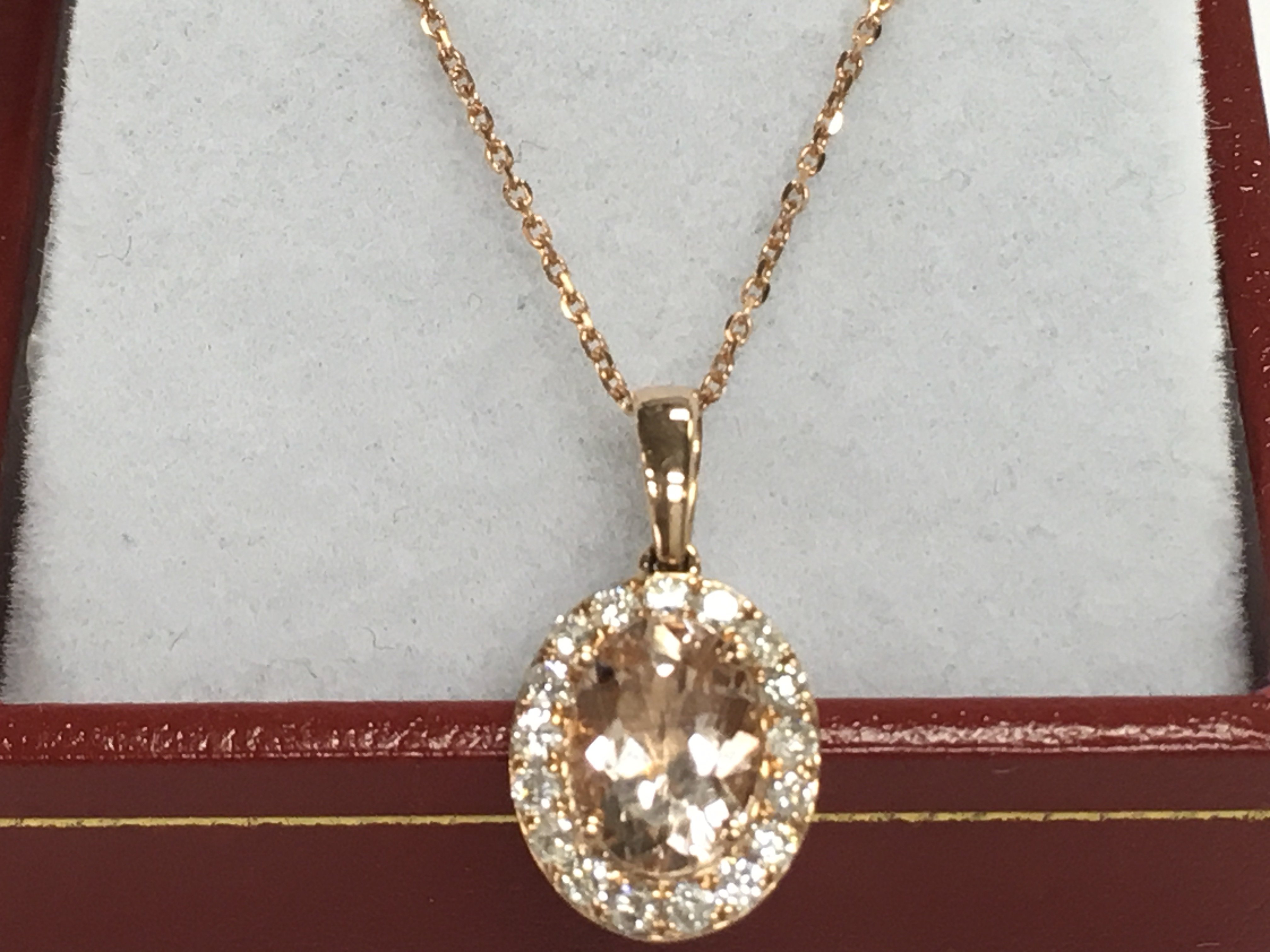 9ct rose gold oval morganite and RBC diamond cluster pendant on a 9ct rose gold chain, boxed. Morganite 1.10ct. Diamonds 0.28ct. Postage category A.
