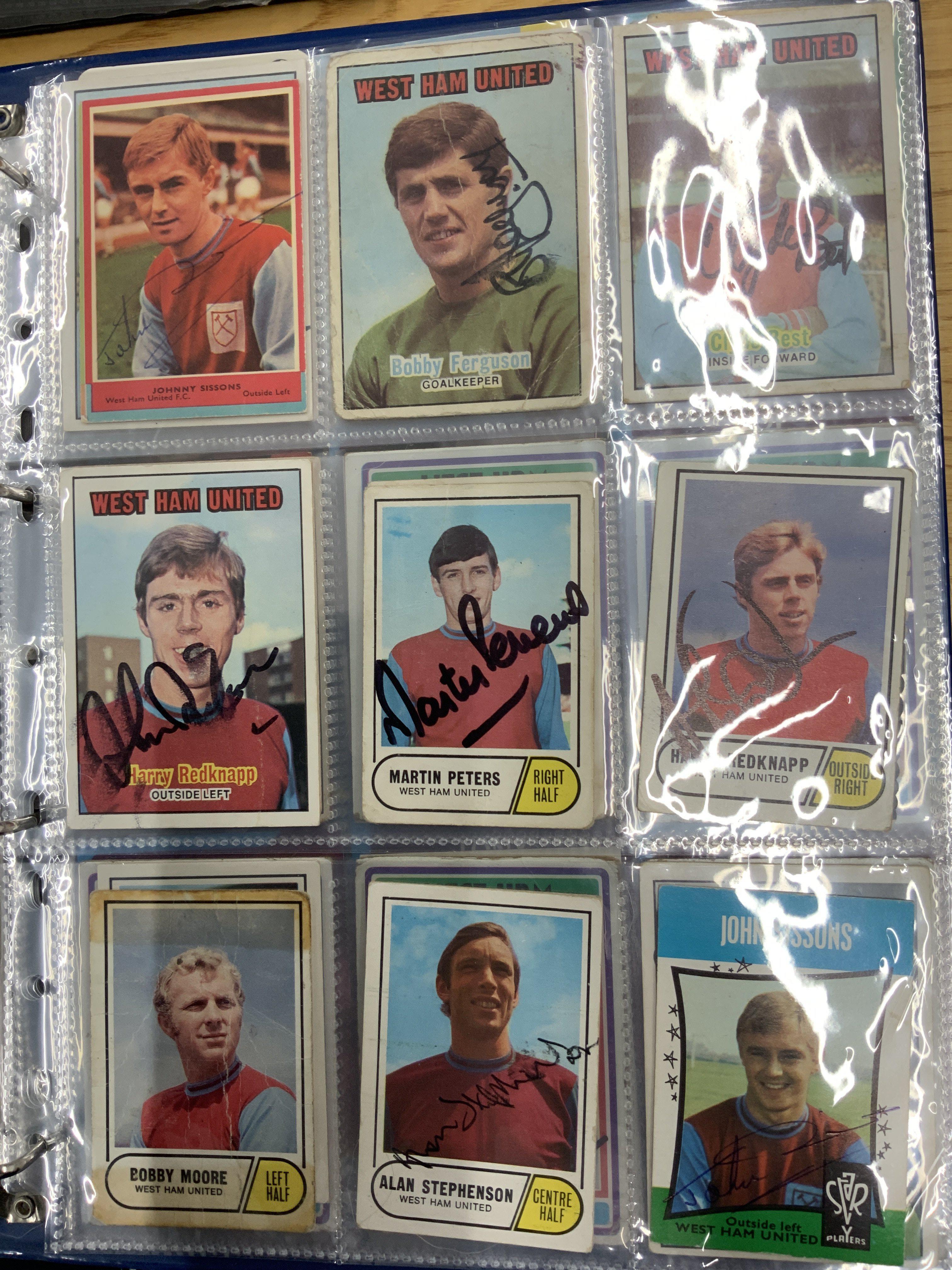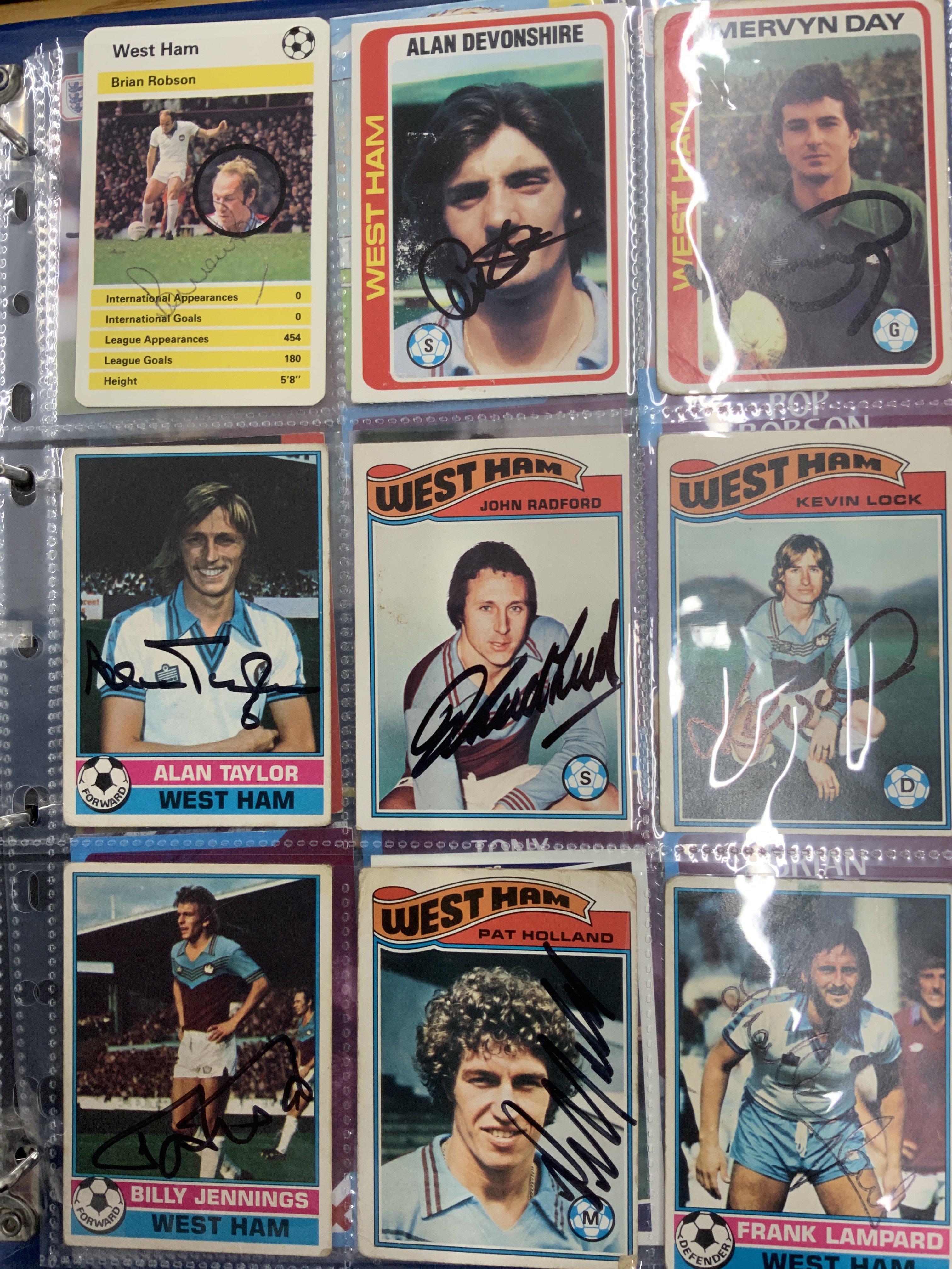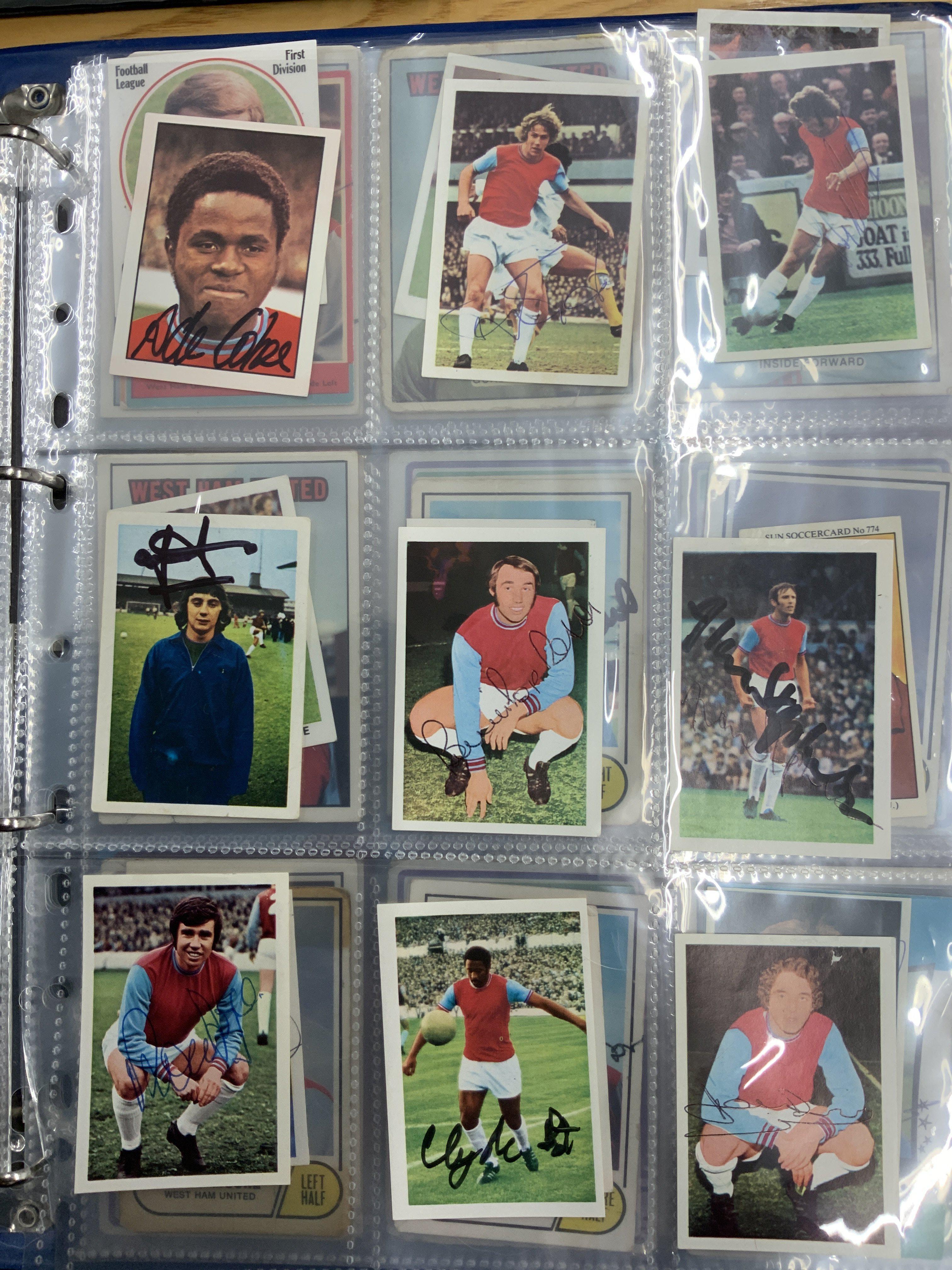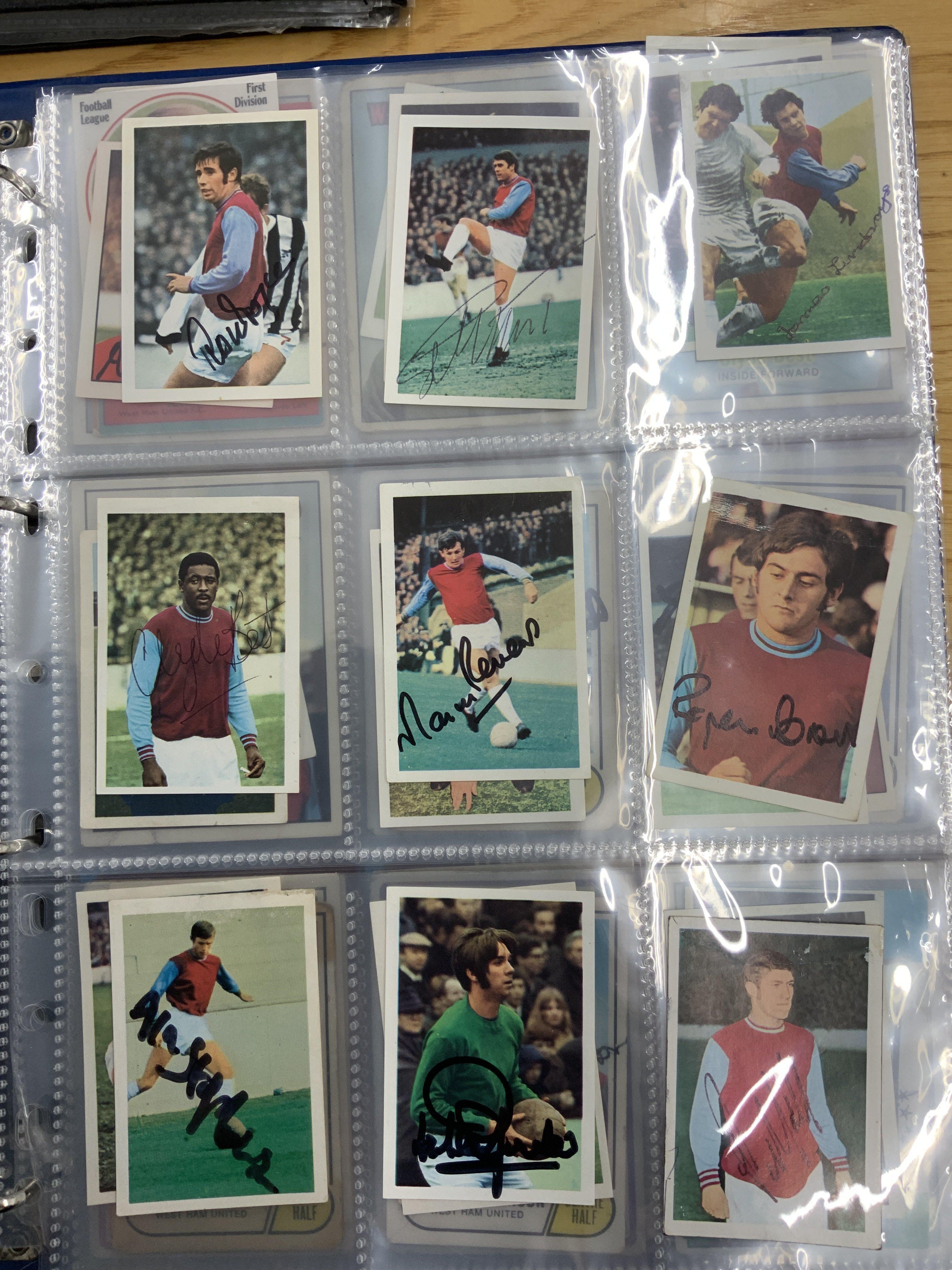 West Ham Signed Football Trade Cards: Superb collection from the 60s to the 80s collected by West Ham book writer who interviewed these players. Cards include FKS A + BC Topps Panini and others. Genuine undedicated signatures include Clyde Best Ade Coker Ron Boyce Geoff Hurst Martin Peters John Sissons Johnny Ayris and Pop Robson. (103)