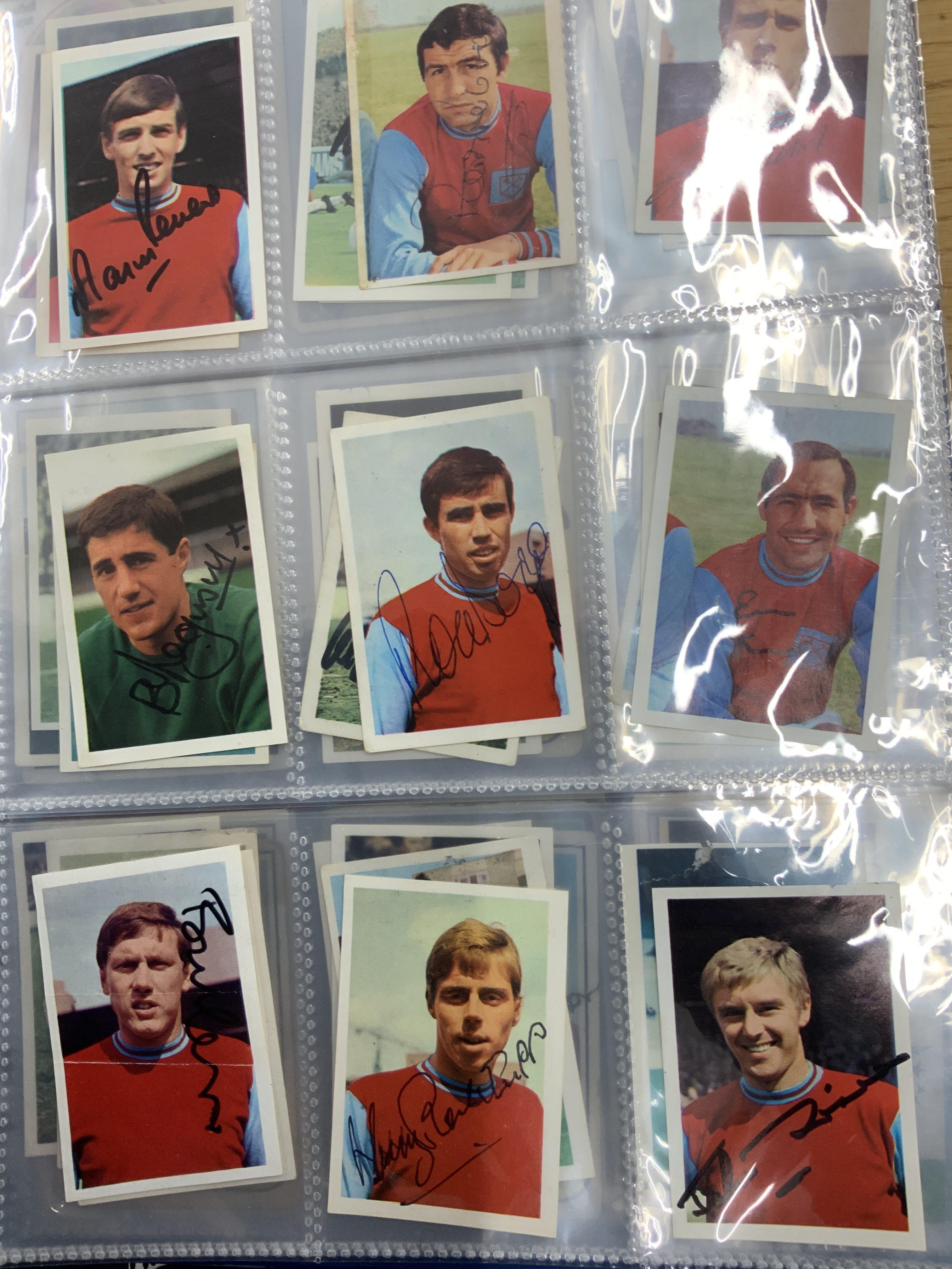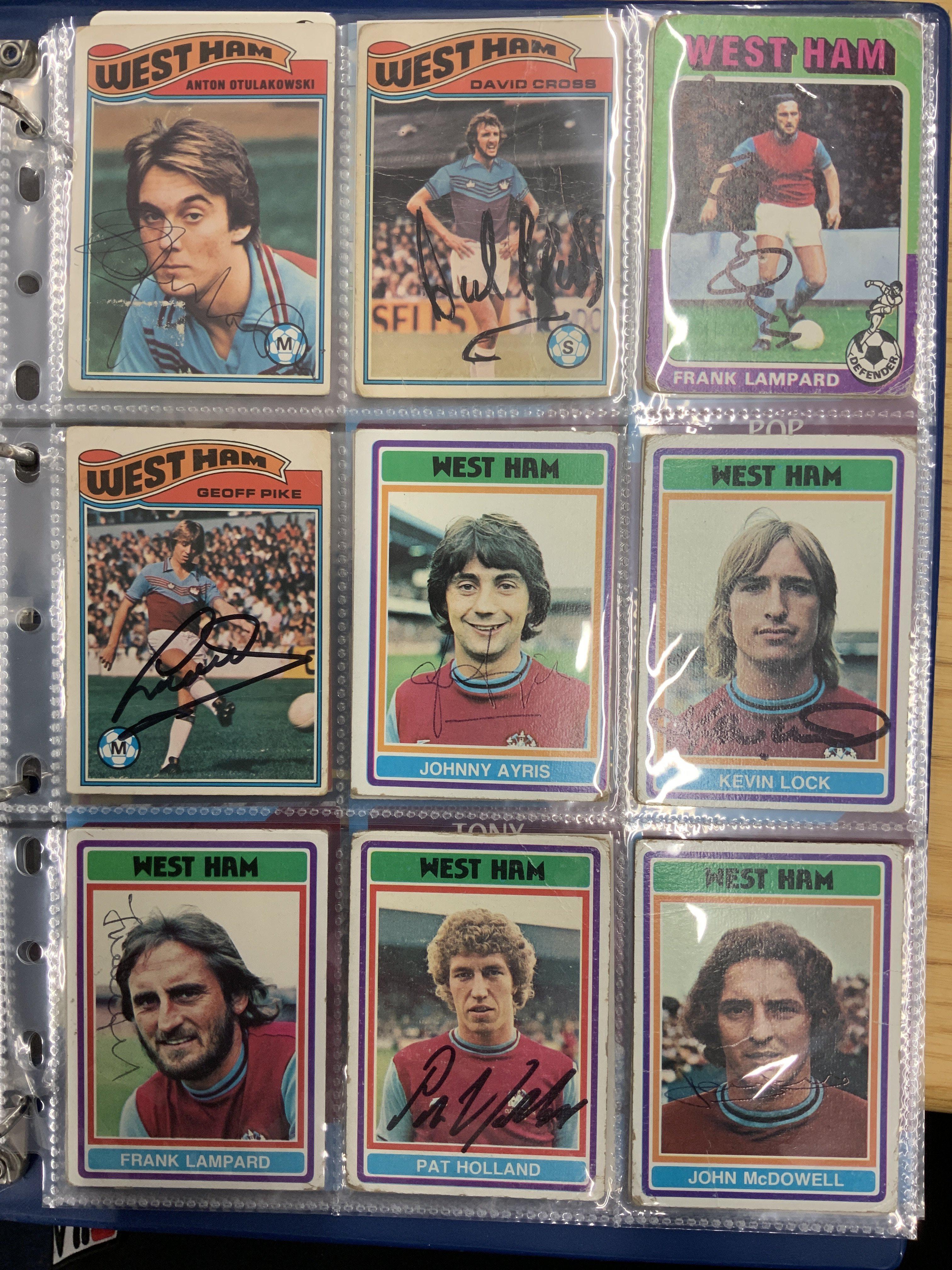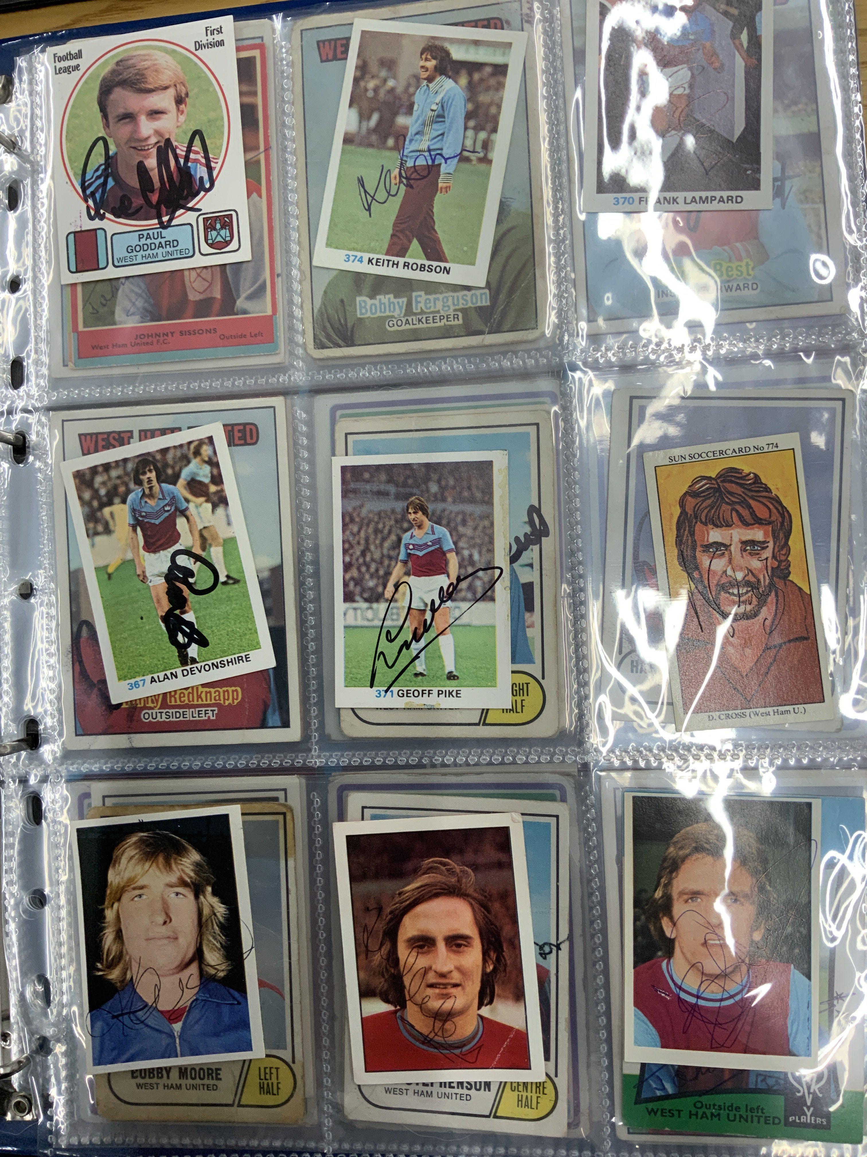West Ham Signed Football Trade Cards: Superb collection from the 60s to the 80s collected by West Ham book writer who interviewed these players. Cards include FKS A + BC Topps Panini and others. Genuine undedicated signatures include Clyde Best Ade Coker Ron Boyce Geoff Hurst Martin Peters John Sissons Johnny Ayris and Pop Robson. (103)