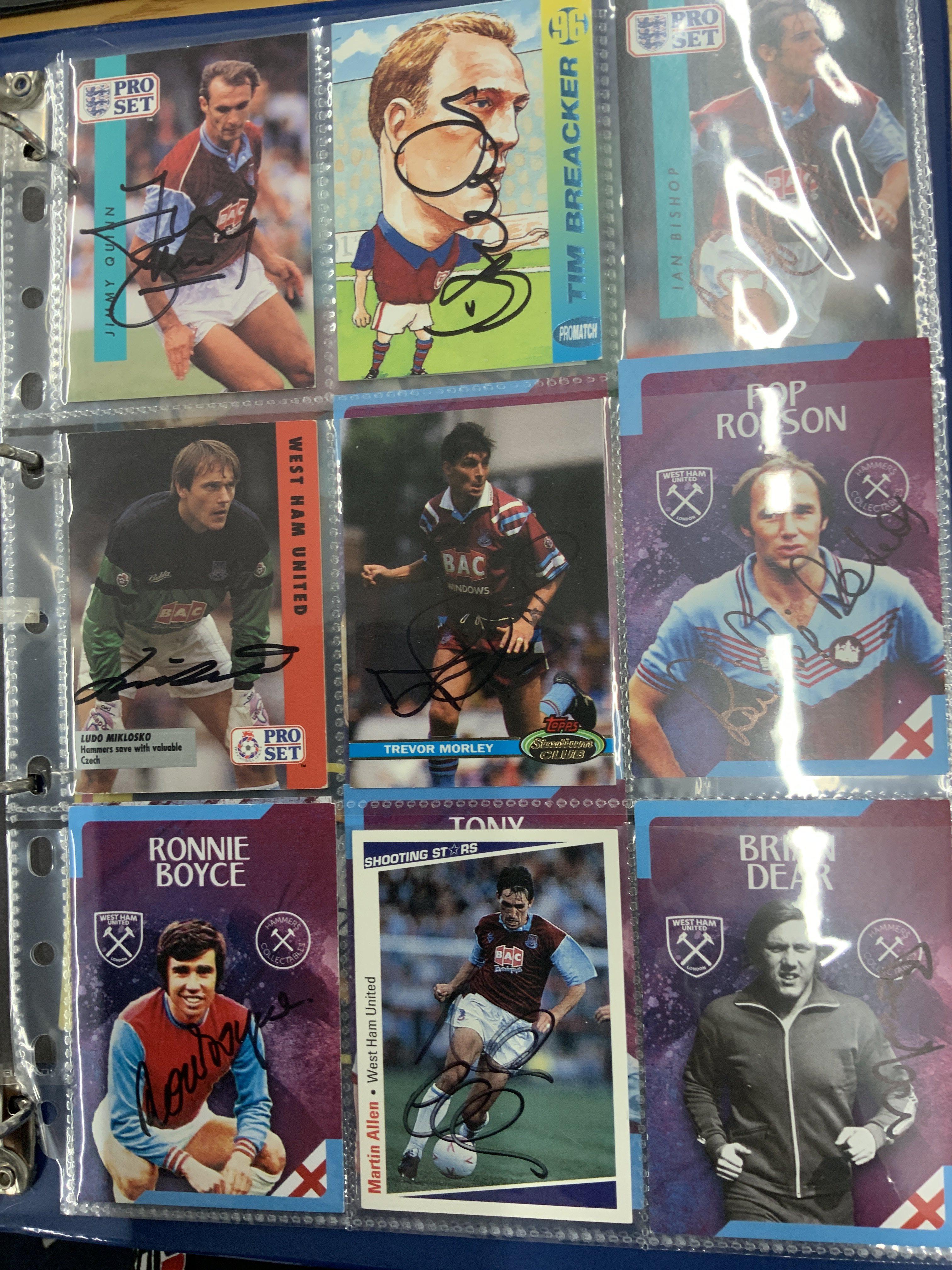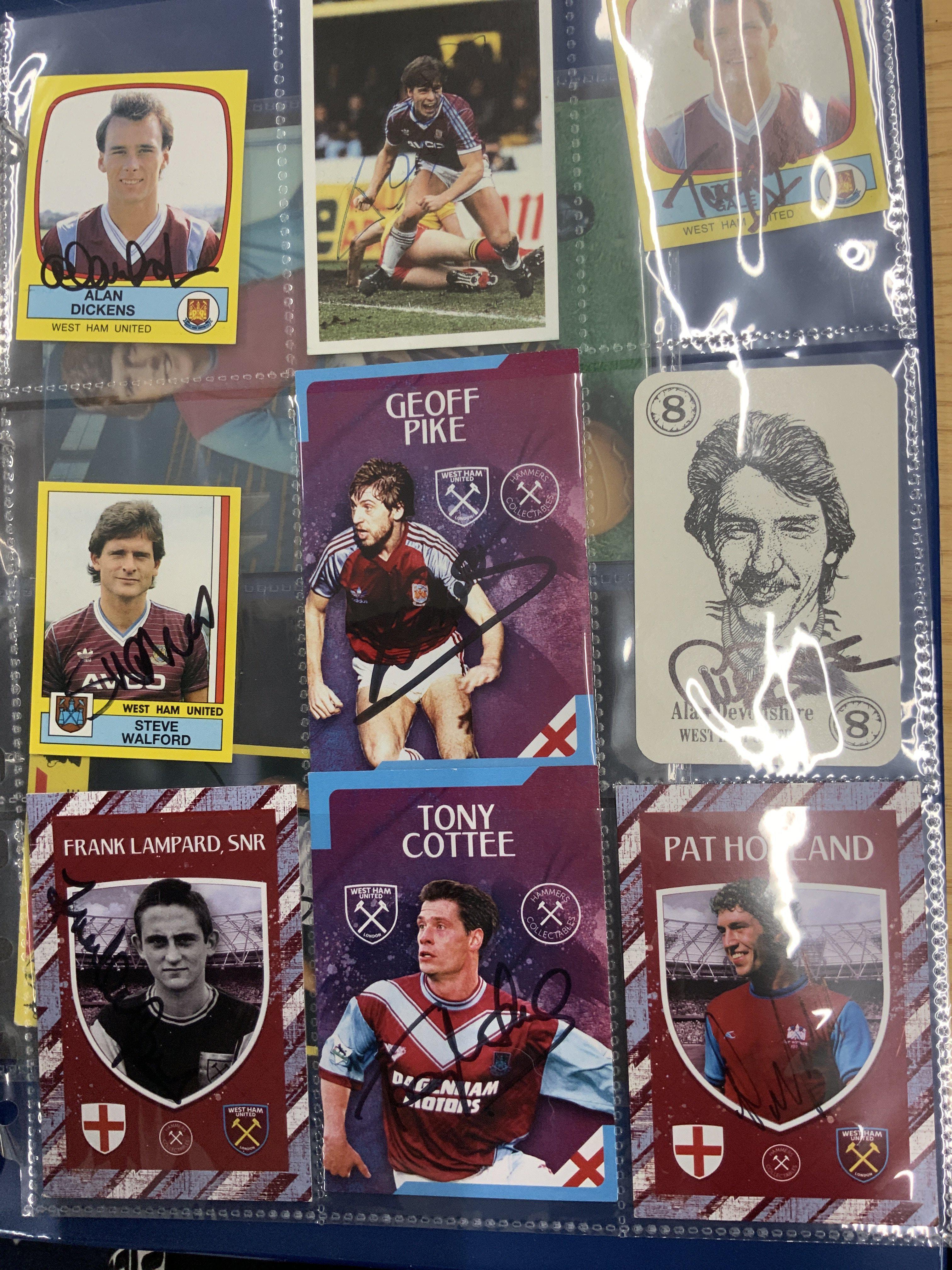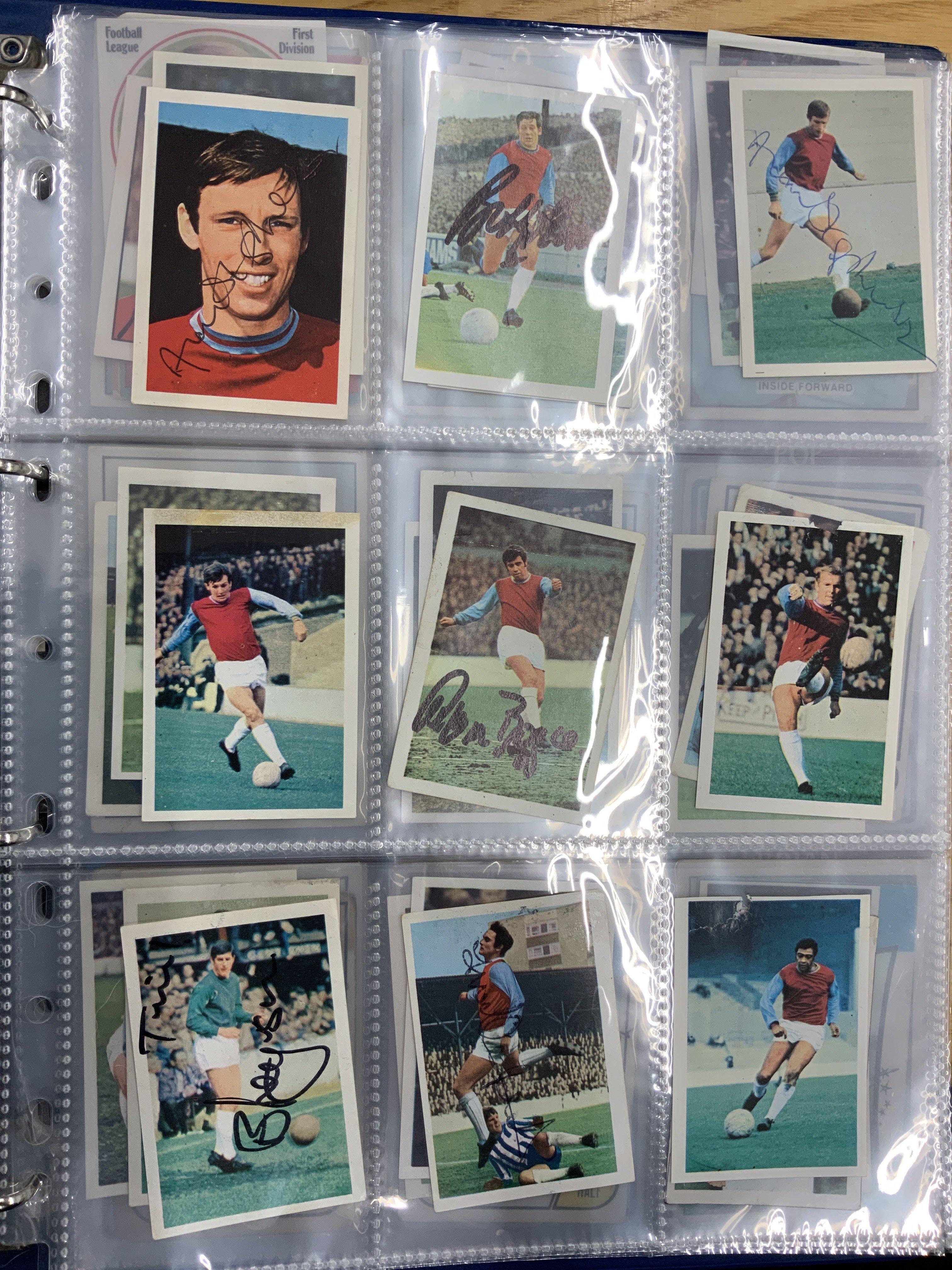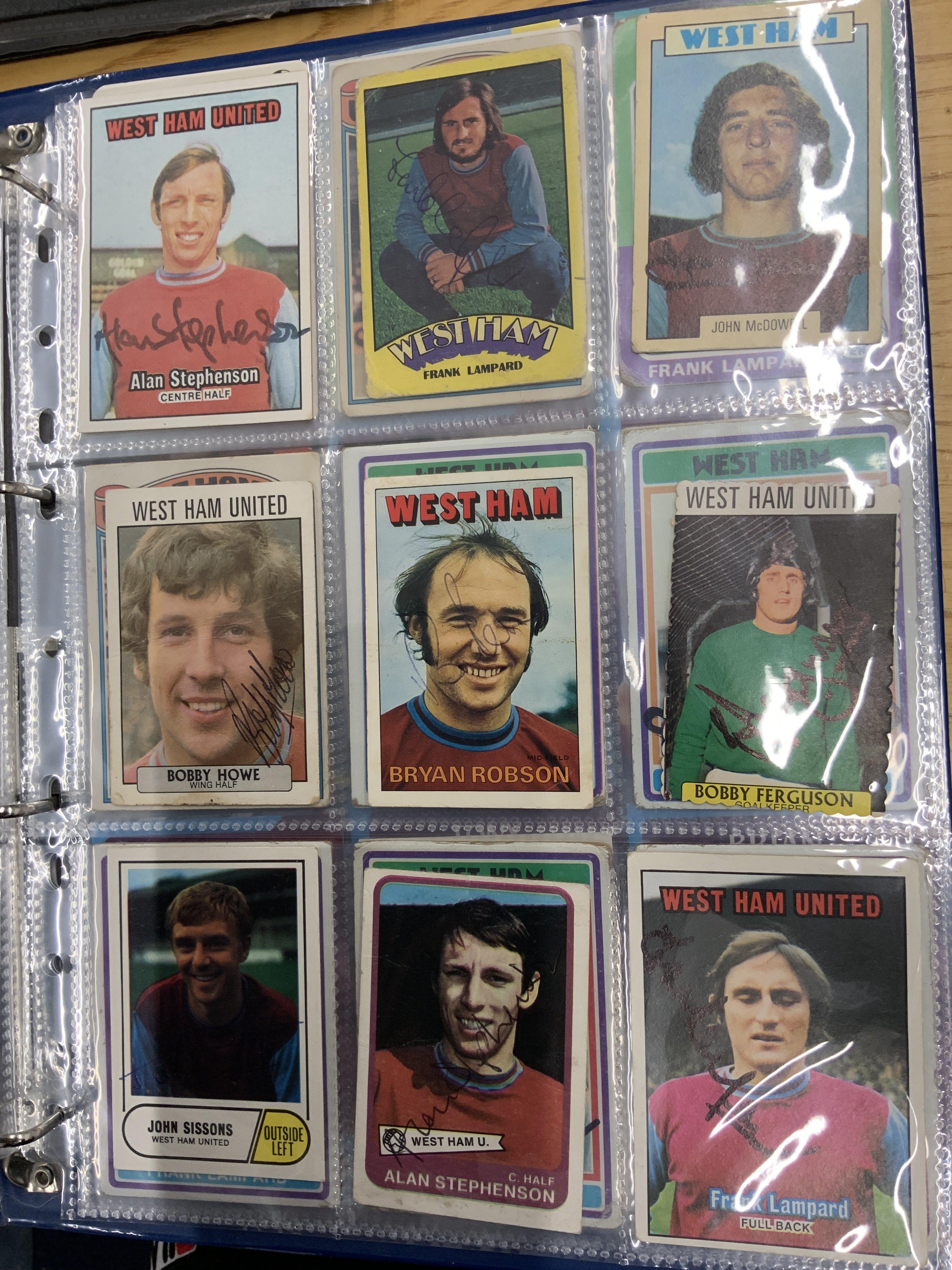 West Ham Signed Football Trade Cards: Superb collection from the 60s to the 80s collected by West Ham book writer who interviewed these players. Cards include FKS A + BC Topps Panini and others. Genuine undedicated signatures include Clyde Best Ade Coker Ron Boyce Geoff Hurst Martin Peters John Sissons Johnny Ayris and Pop Robson. (103)